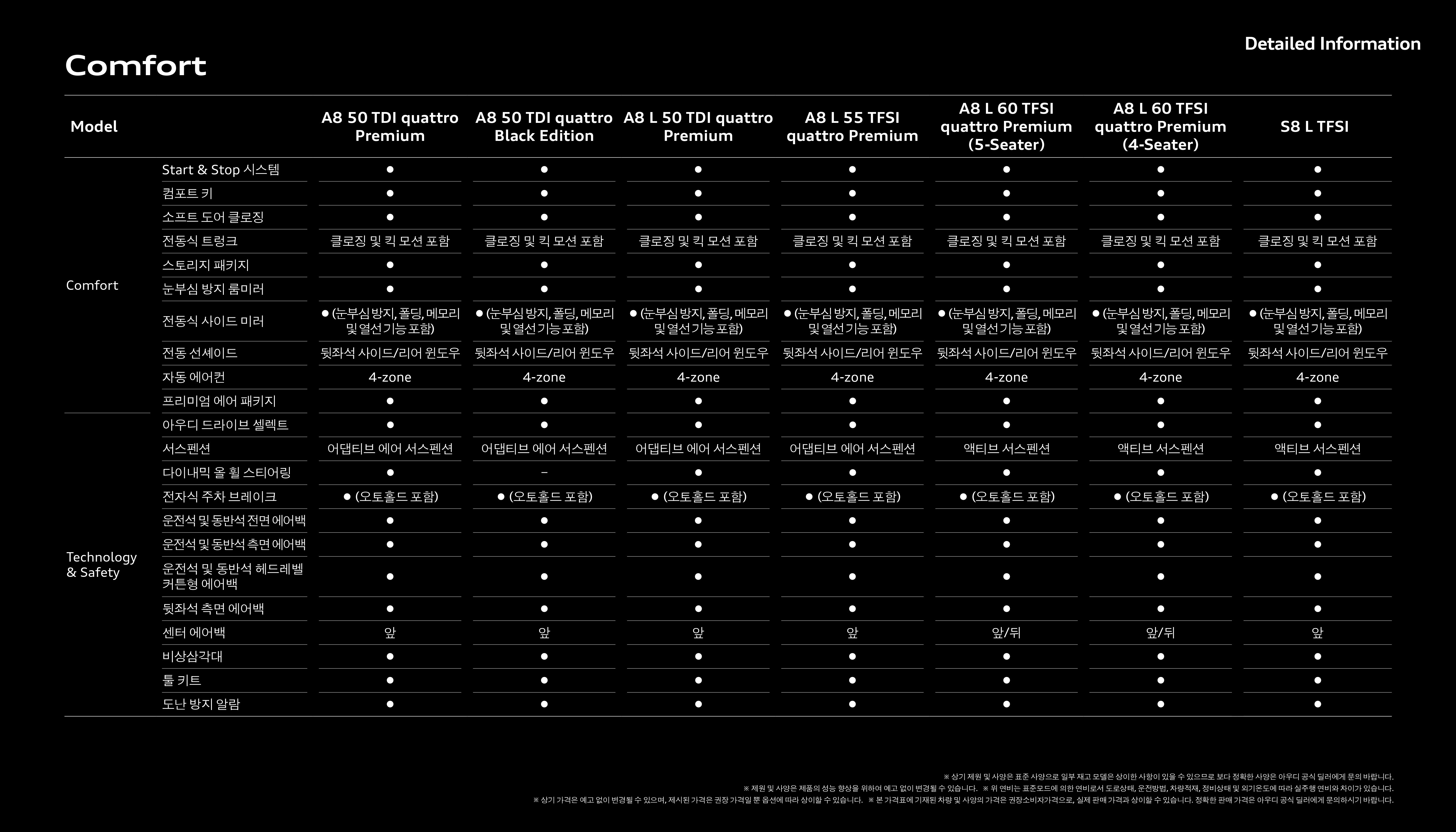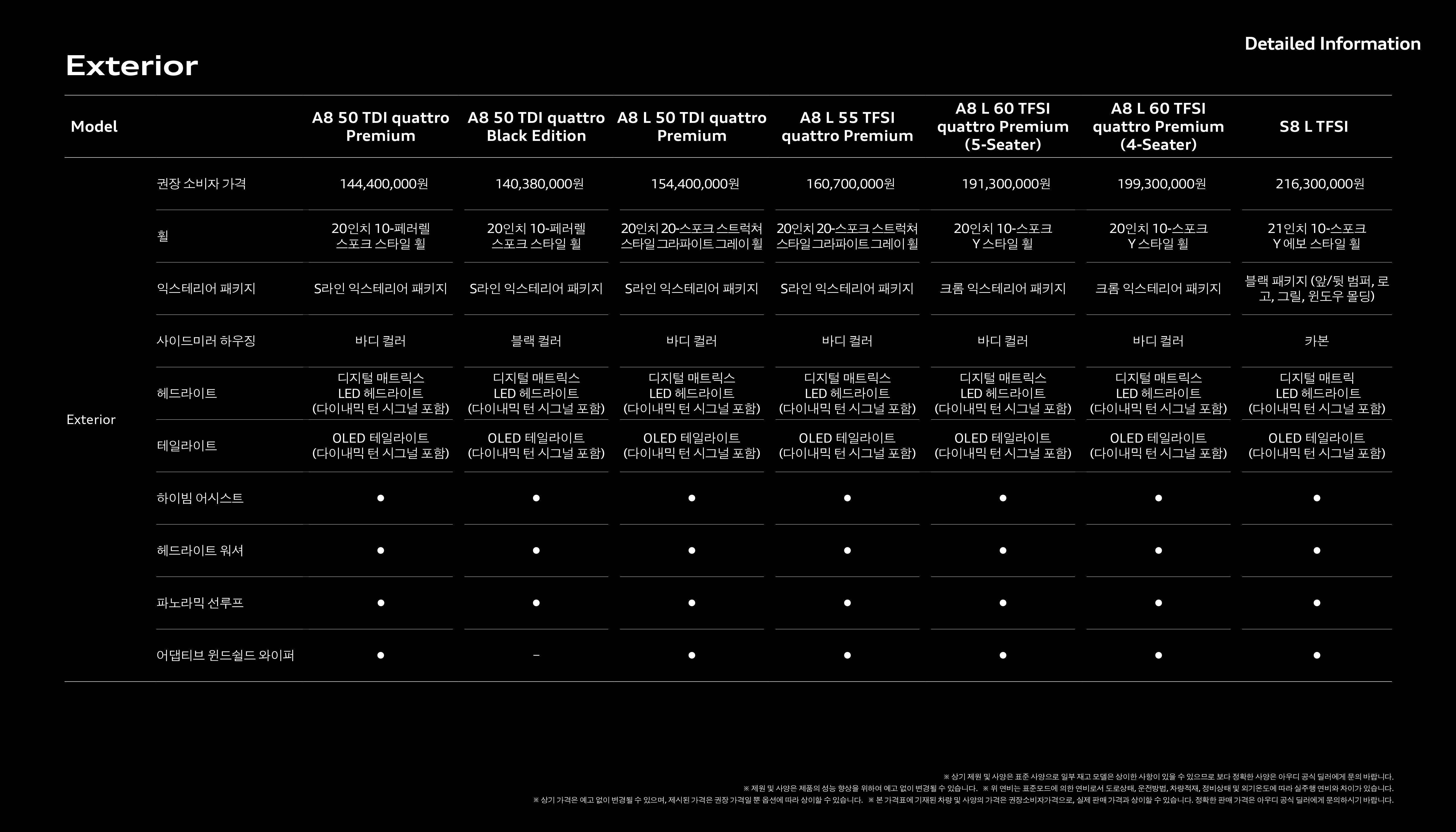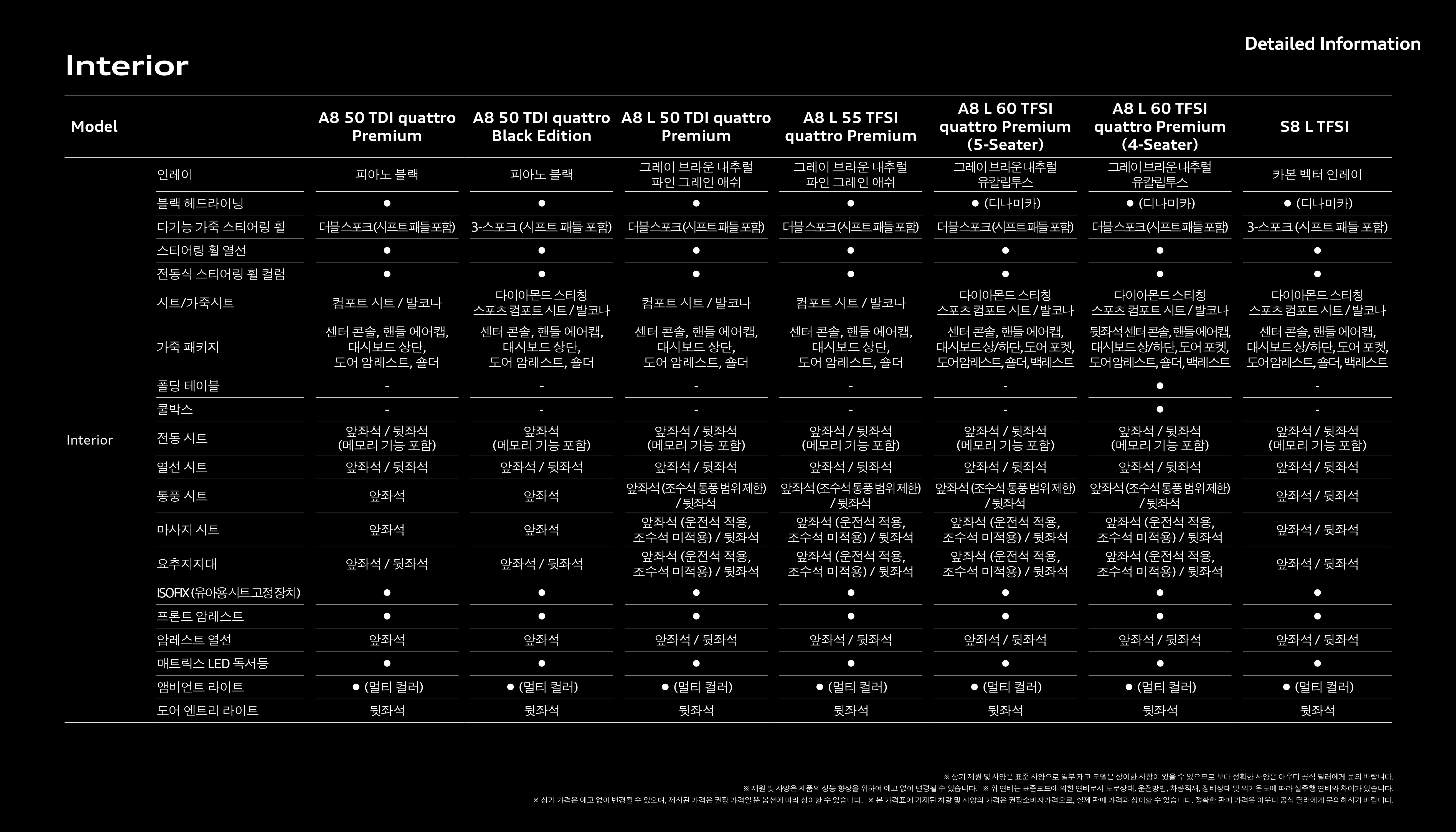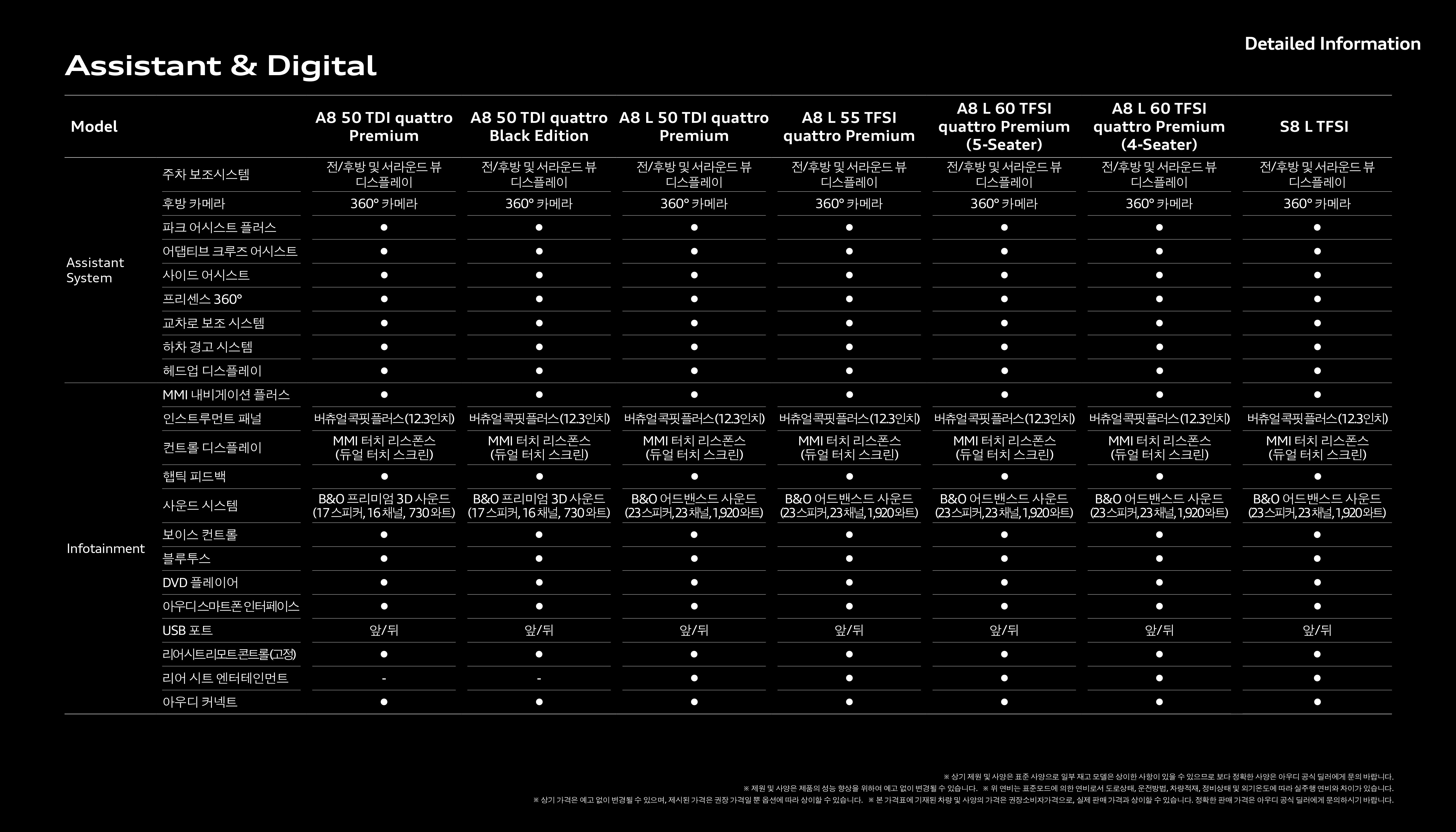 마지막으로 A8 각 모델 간 옵션 차이를 한눈에 볼 수 있게 준비한 자료입니다.