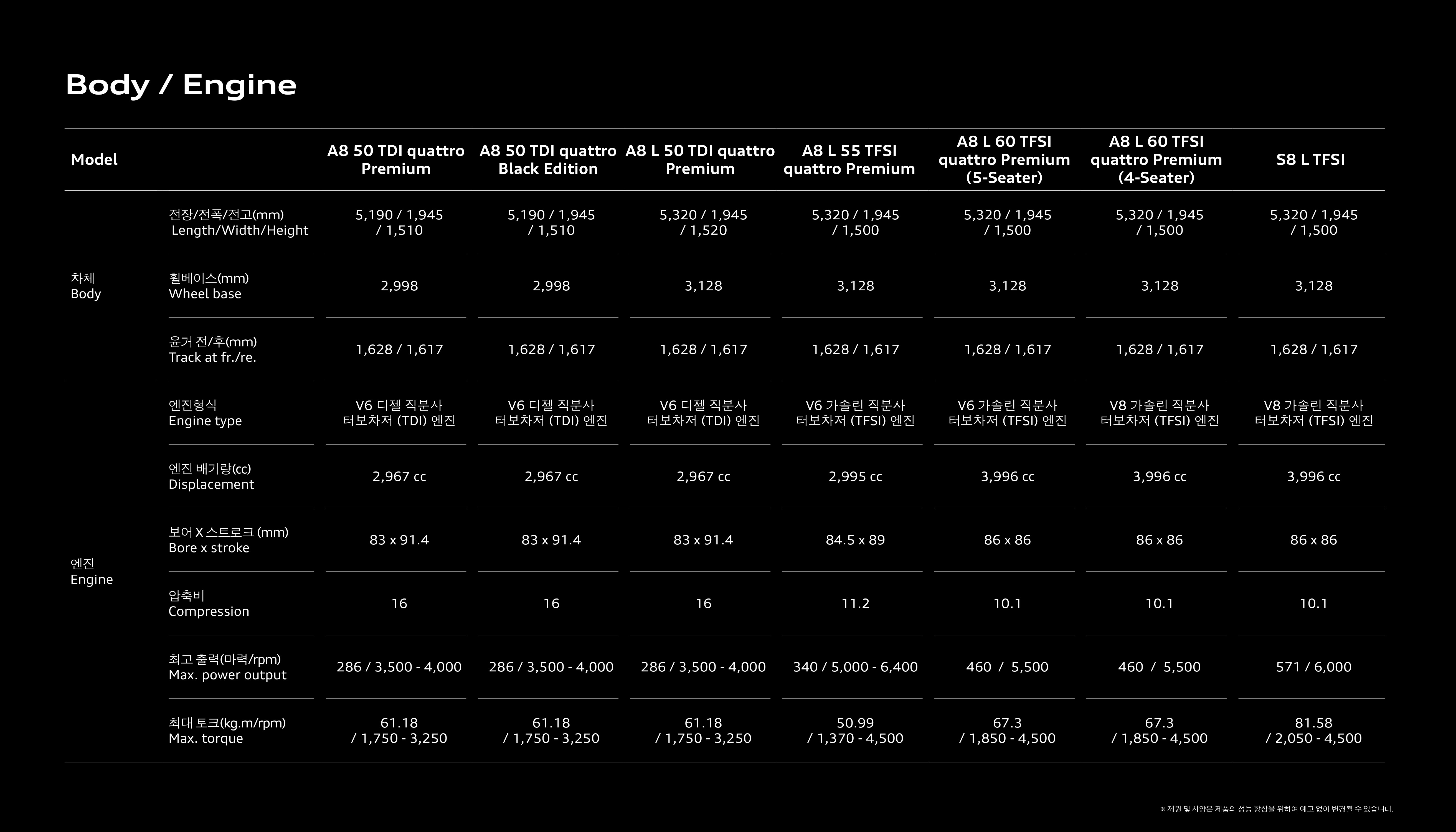 옵션표를 분석해 보자면, A8 숏바디는 무조건 디젤 엔진 밖에 선택이 불가합니다.