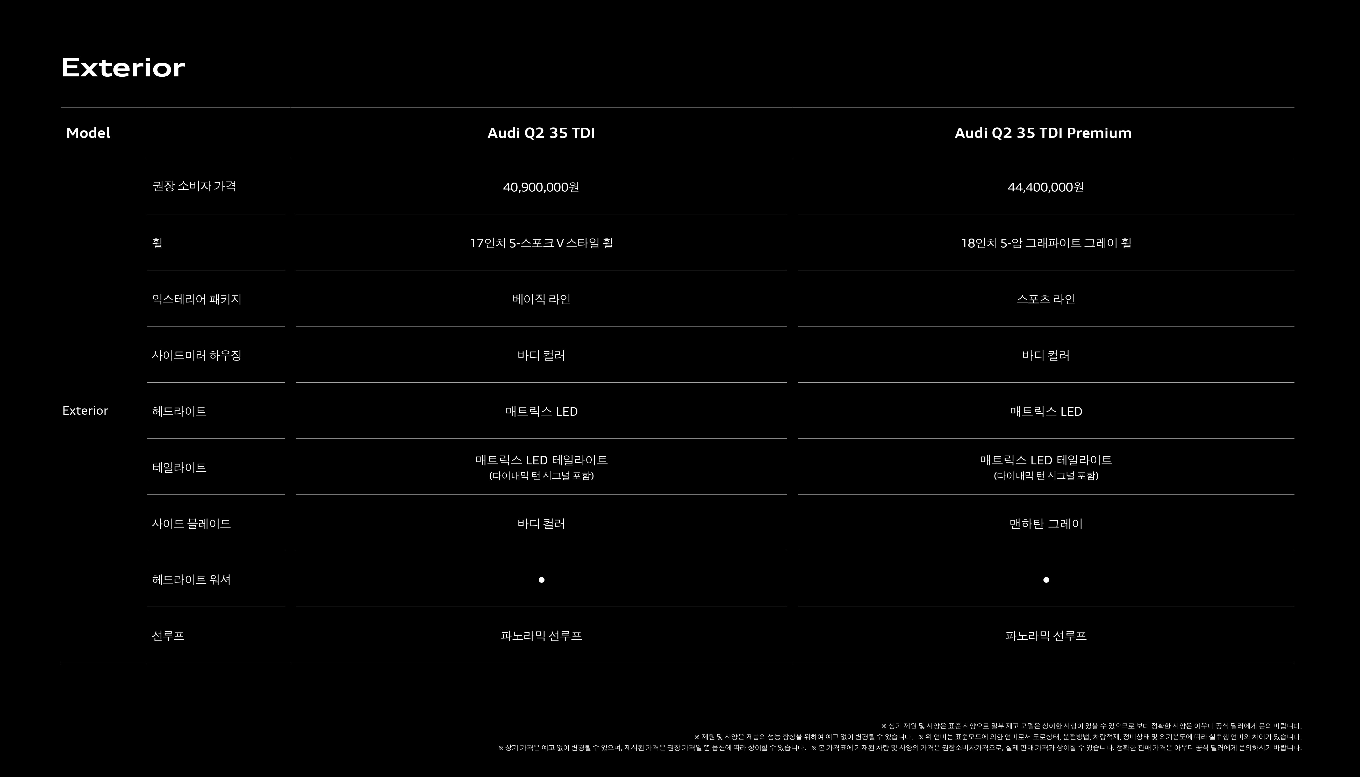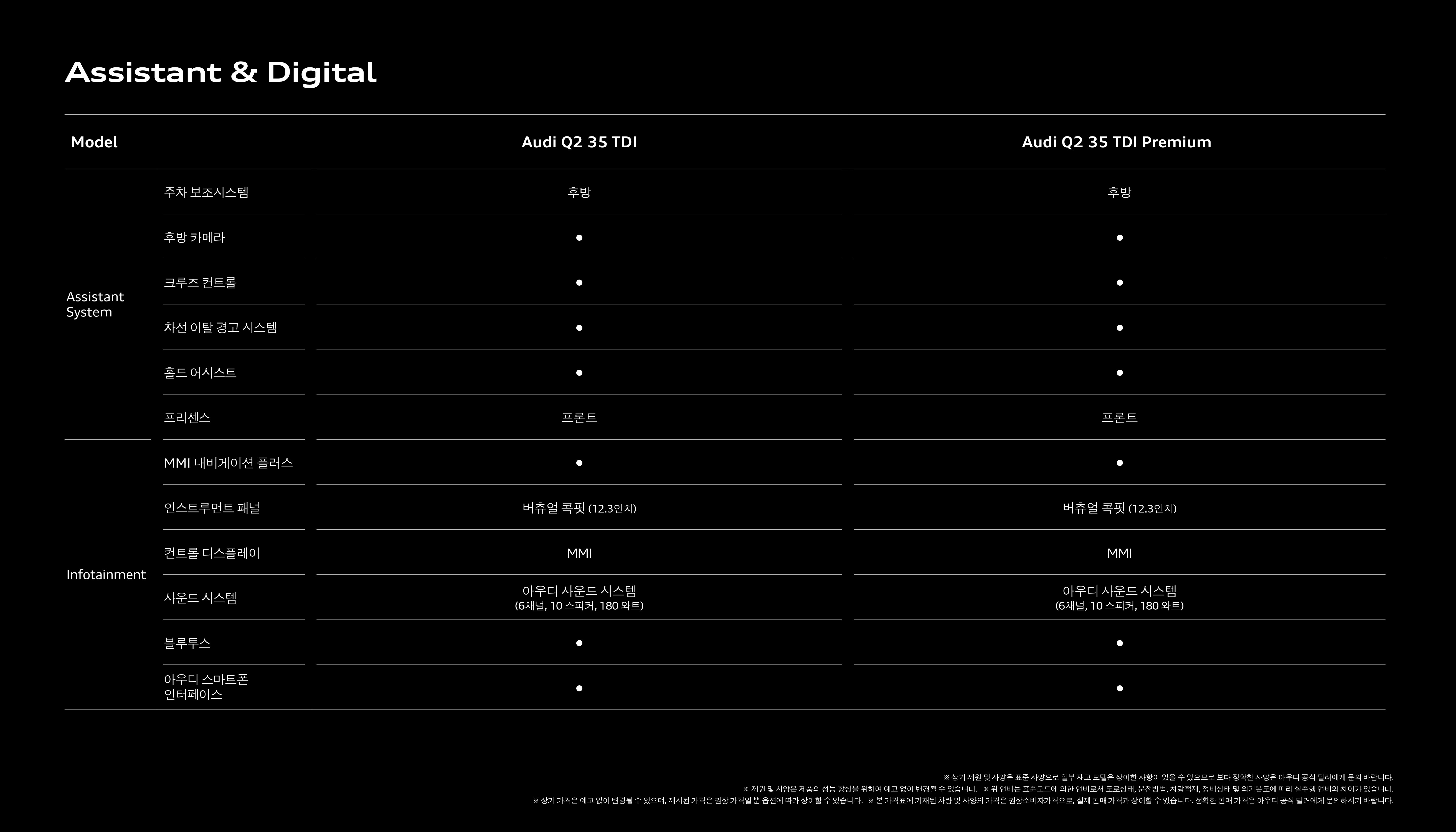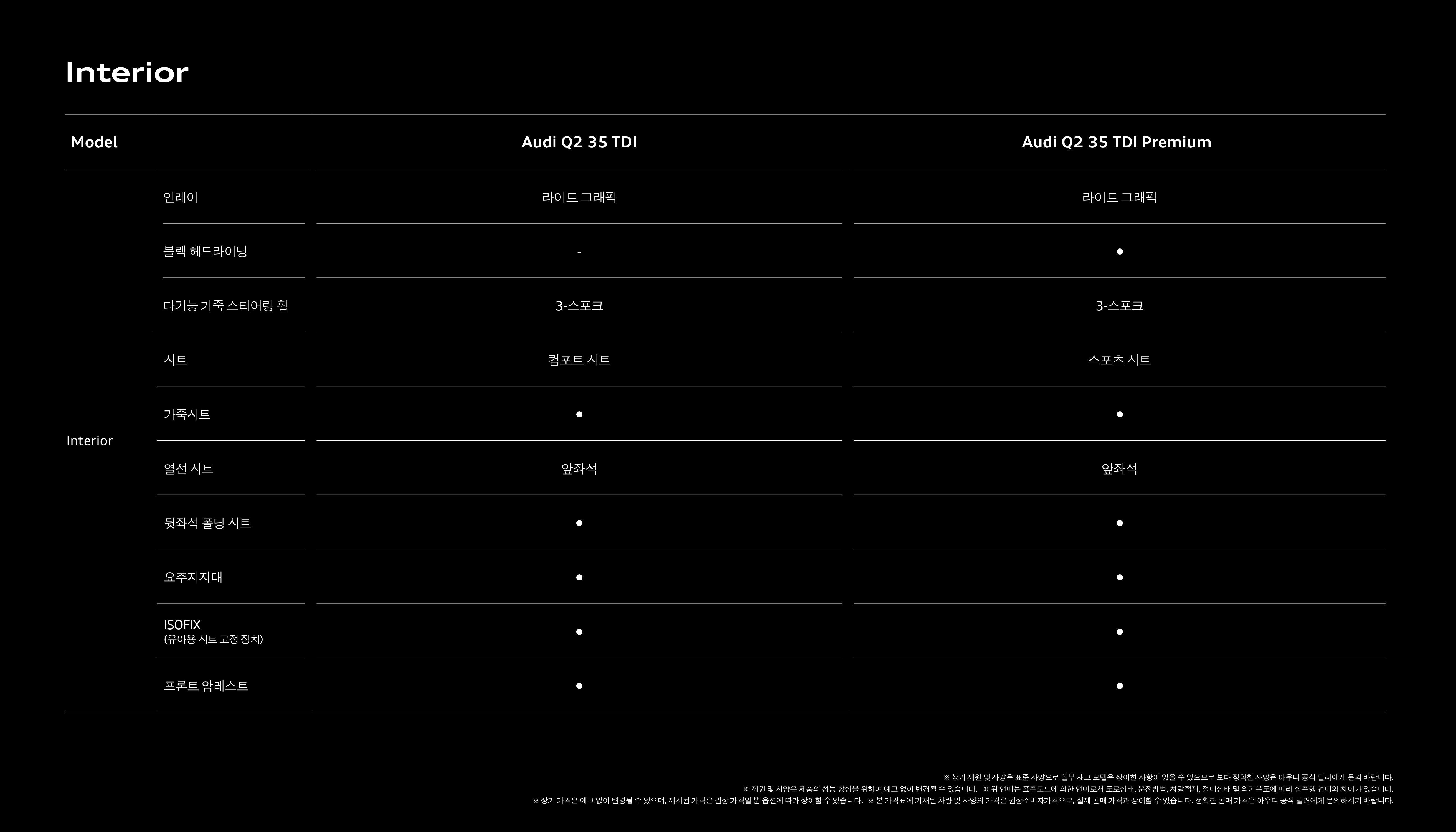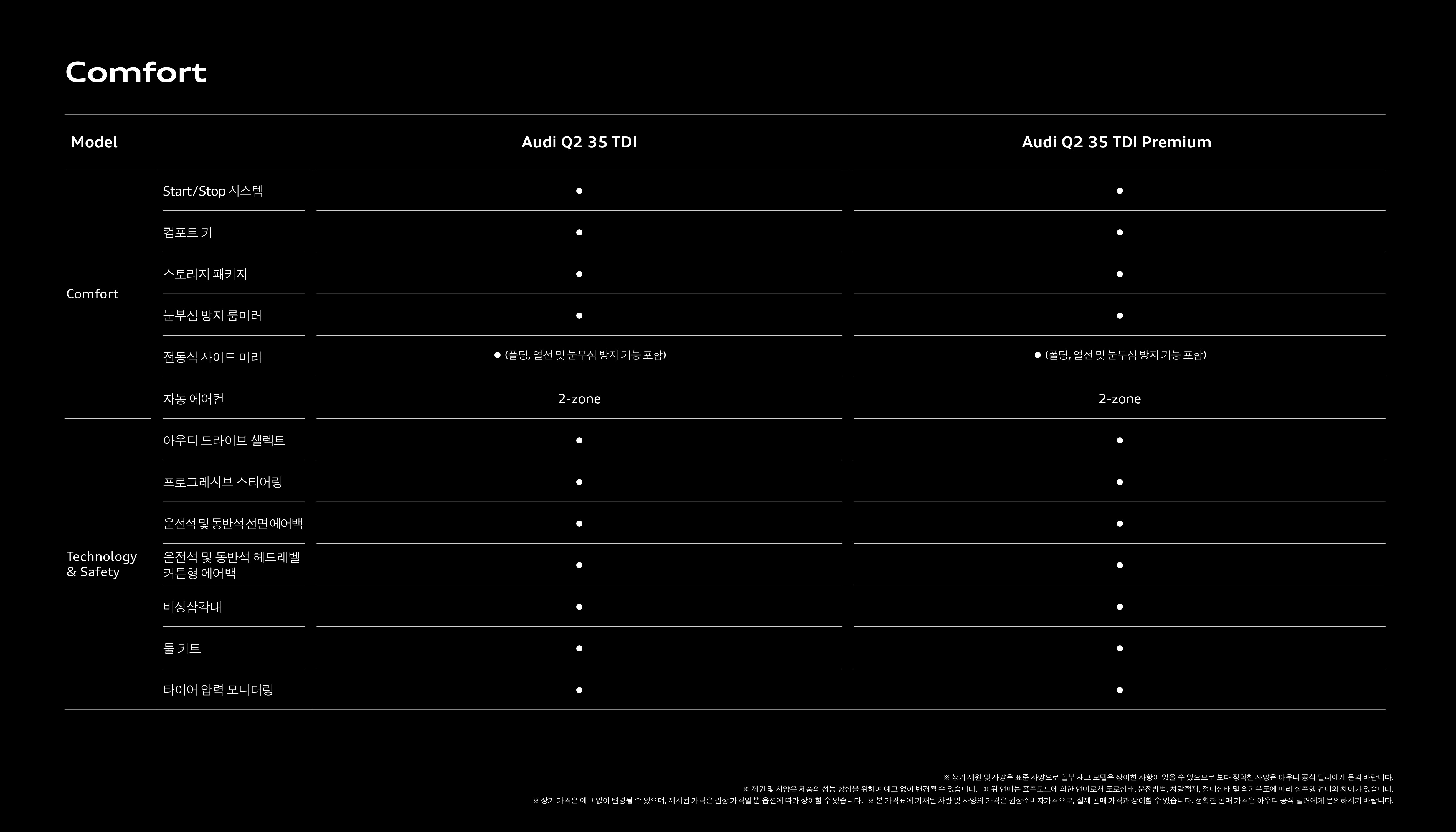 마지막으로 Q2 35TDI 컴포트 및 프리미엄 간의 스펙 비교인데, 크게 의미는 없습니다.