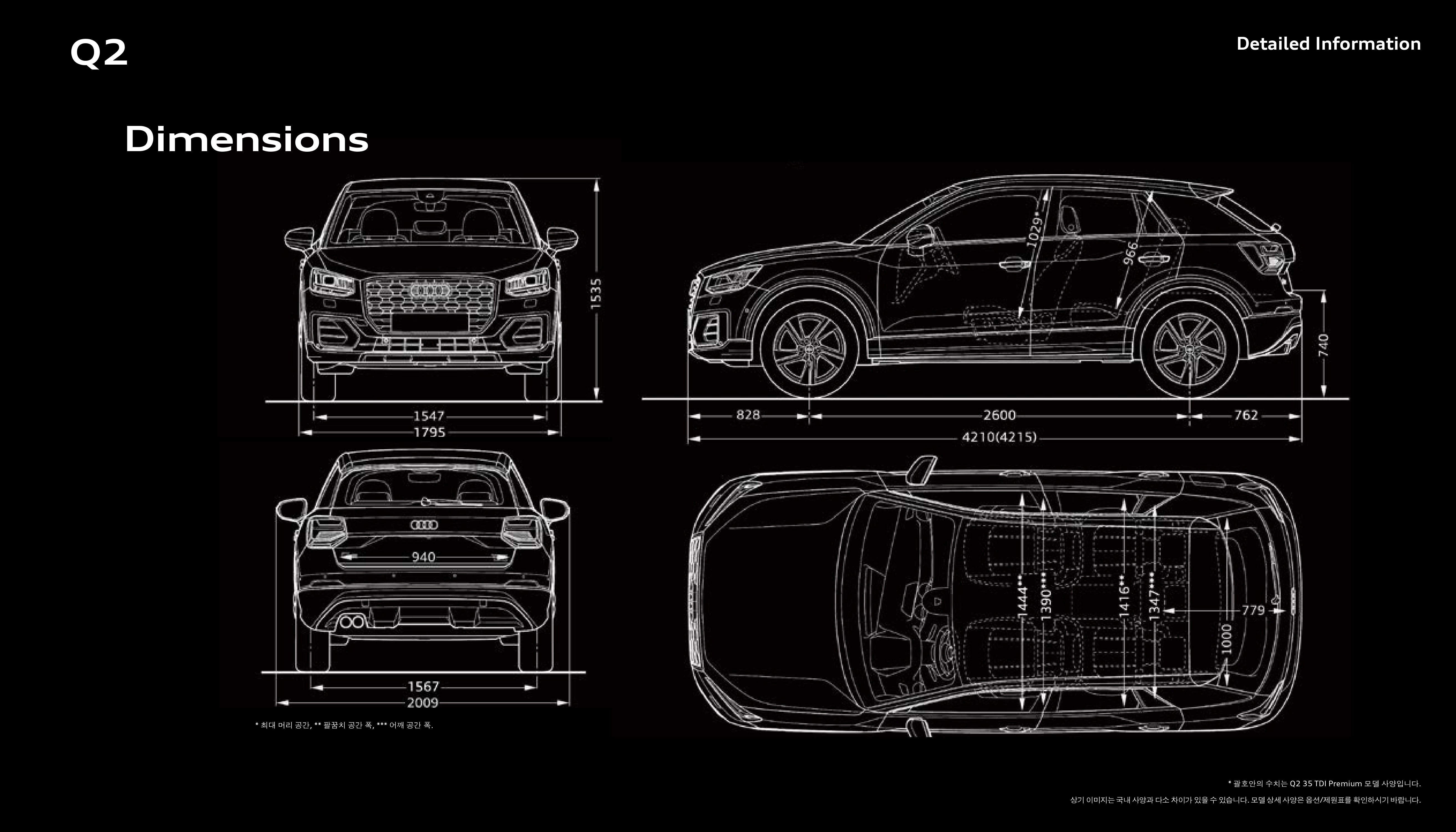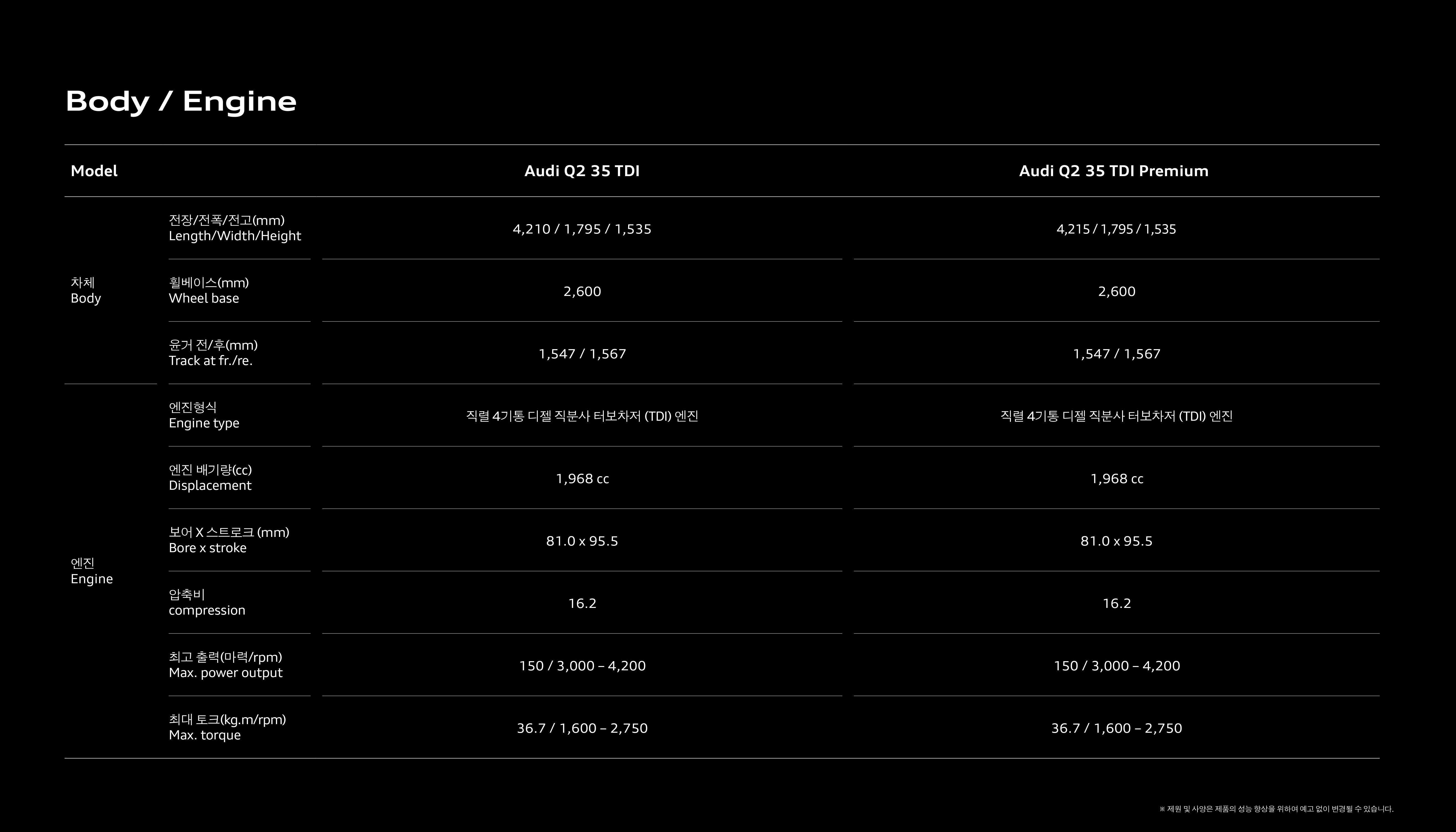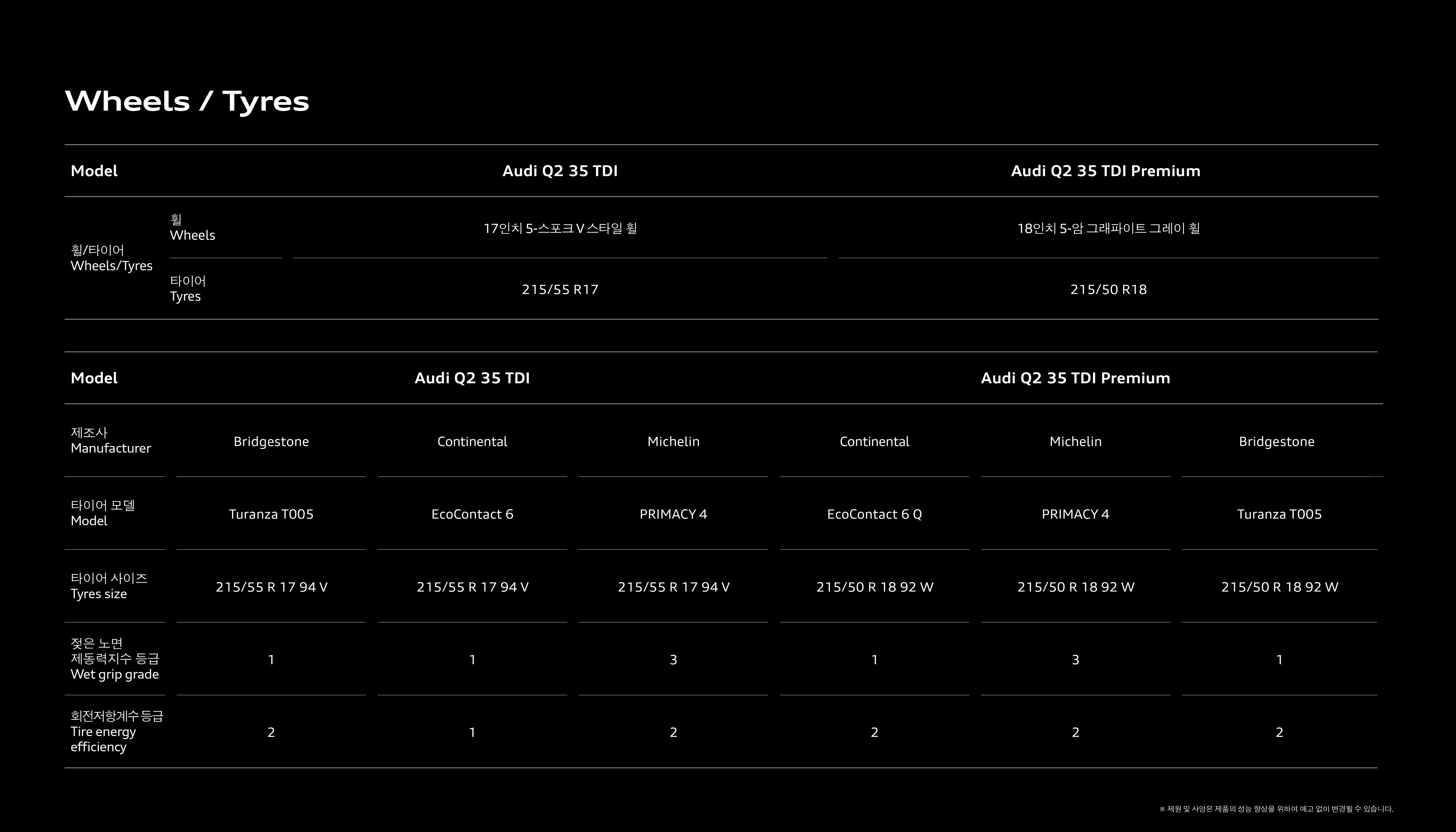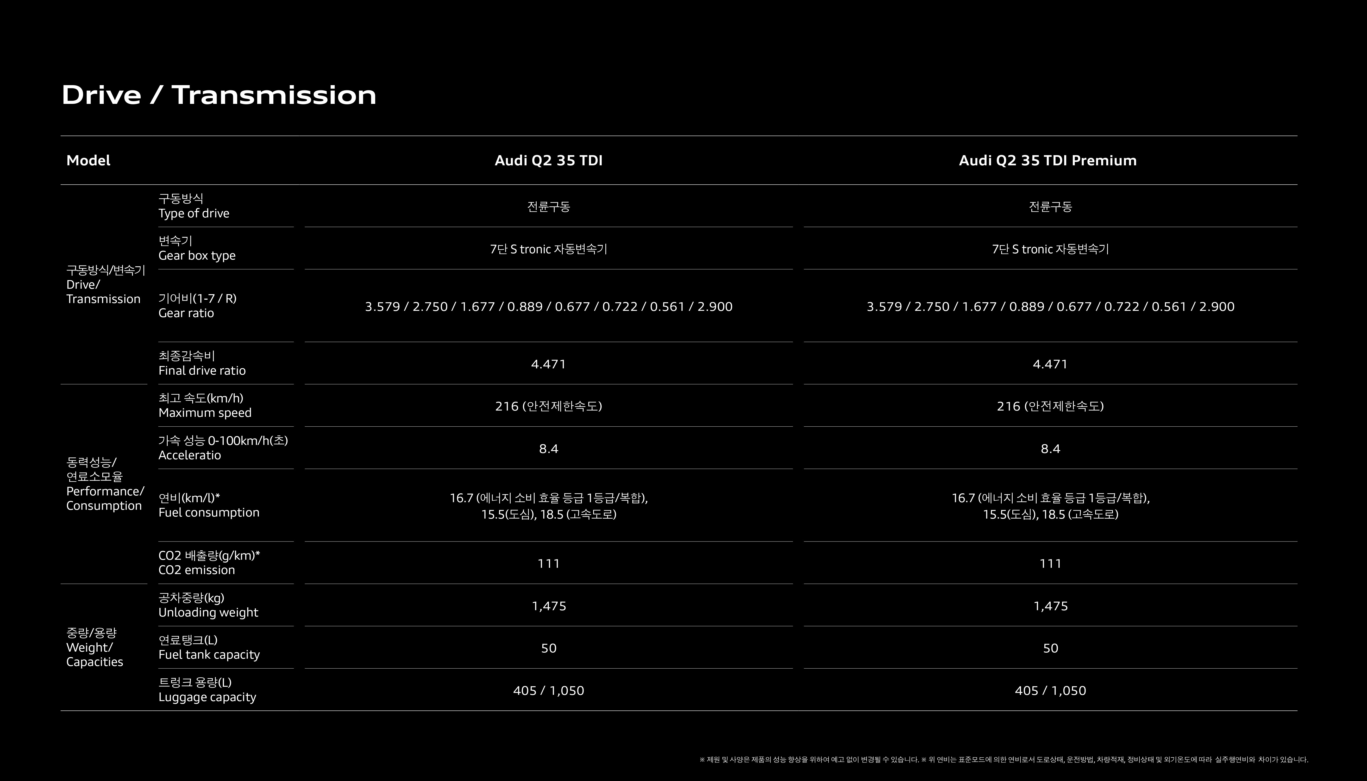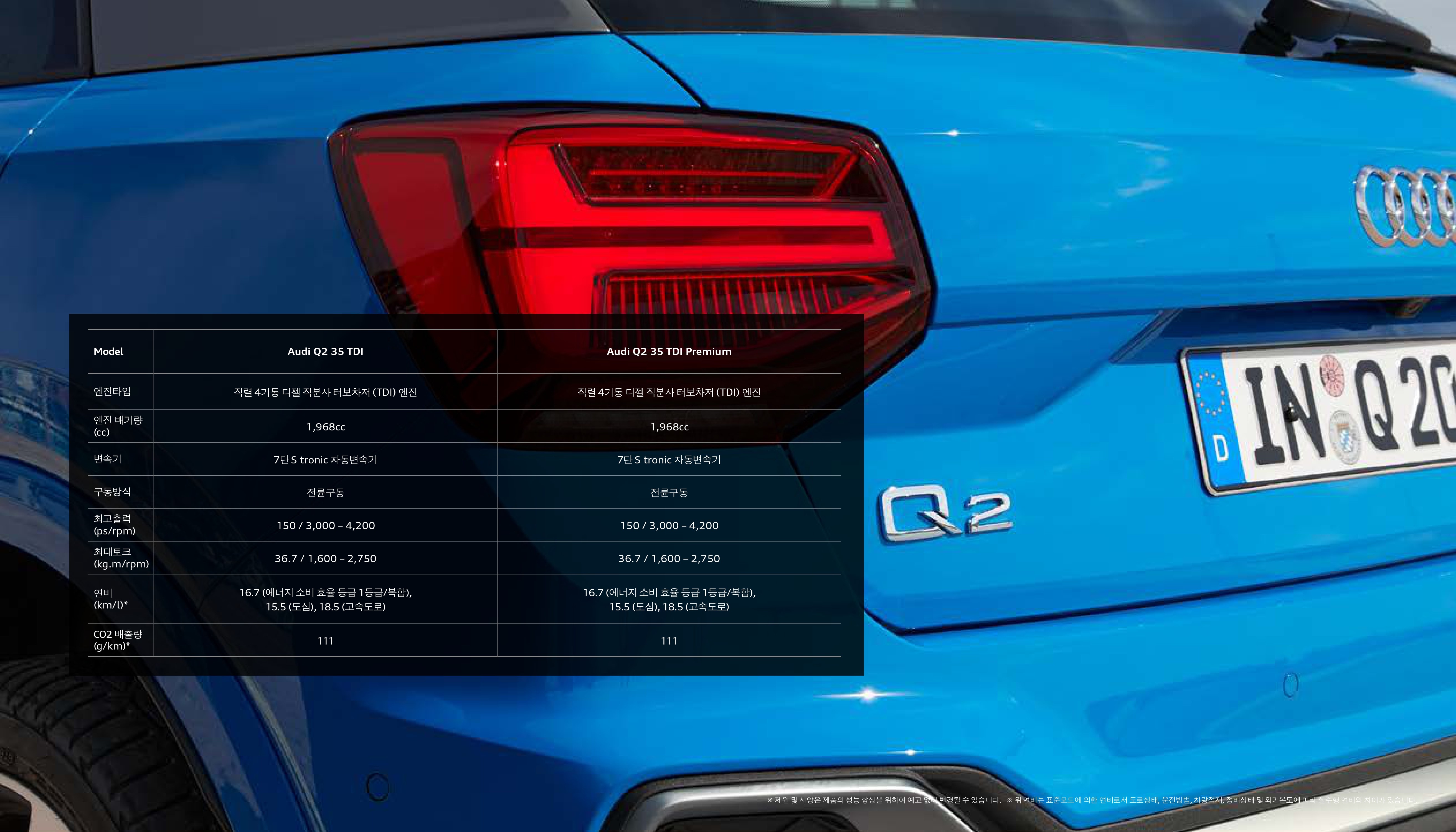 마지막으로 Q2 35TDI 컴포트 및 프리미엄 간의 스펙 비교인데, 크게 의미는 없습니다.