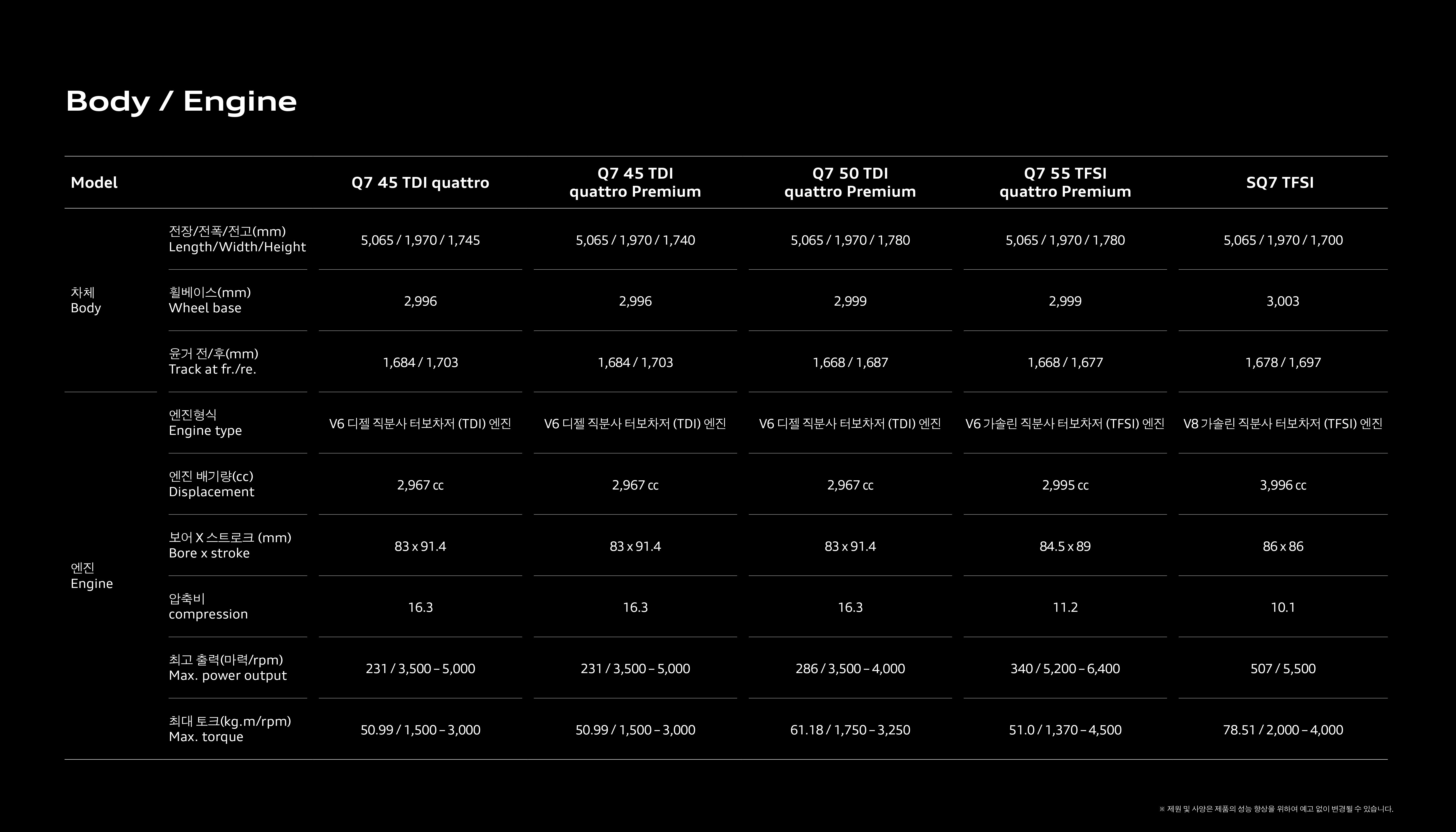 다음은 Q7 50TDI에서 Q7 55TFSI 로 변경했을 때의 차이점입니다.