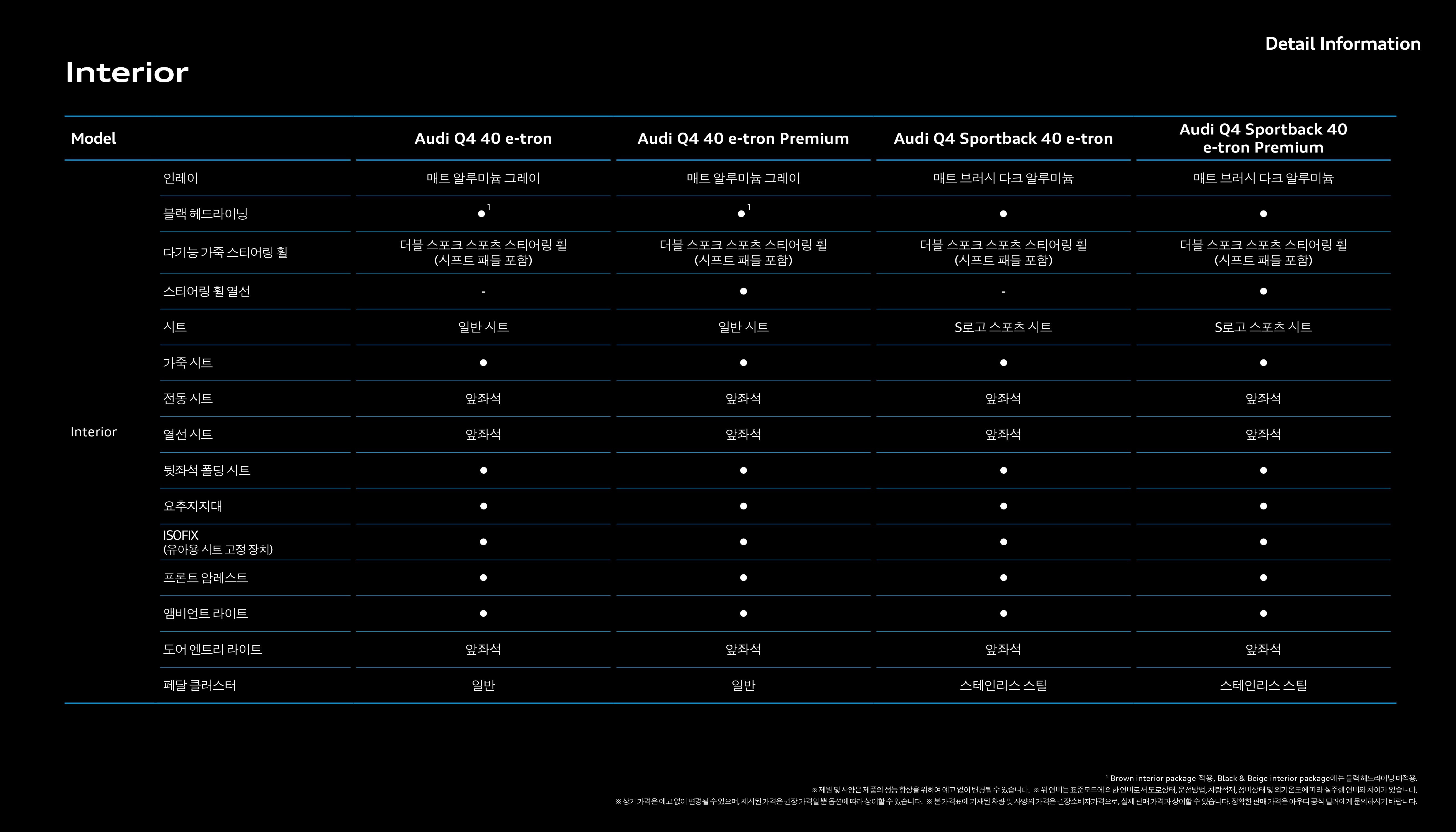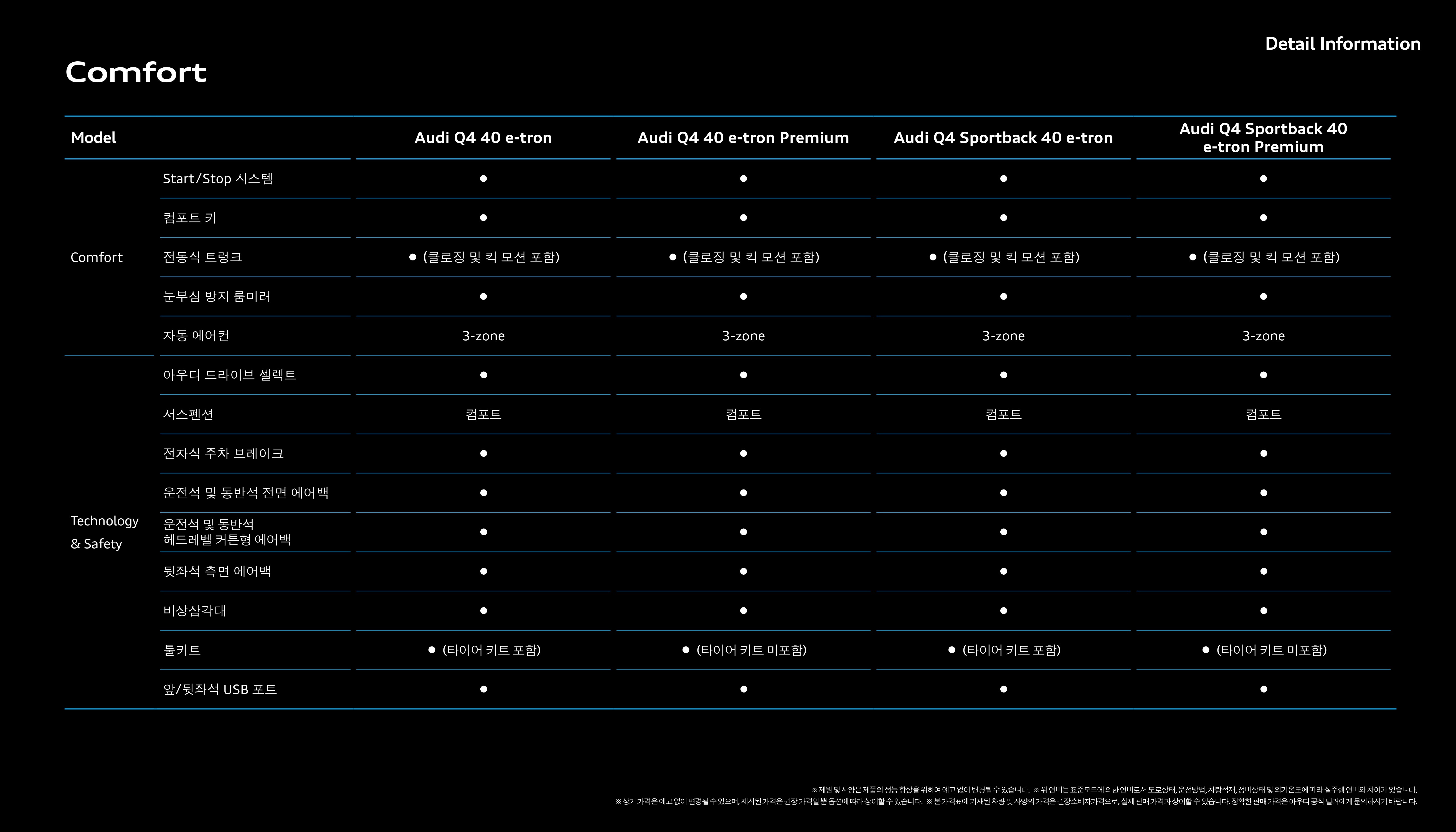 아래는 Q4 이트론의 컴포트와 프리미엄 모델 간의 차이를 정리한 자료입니다.