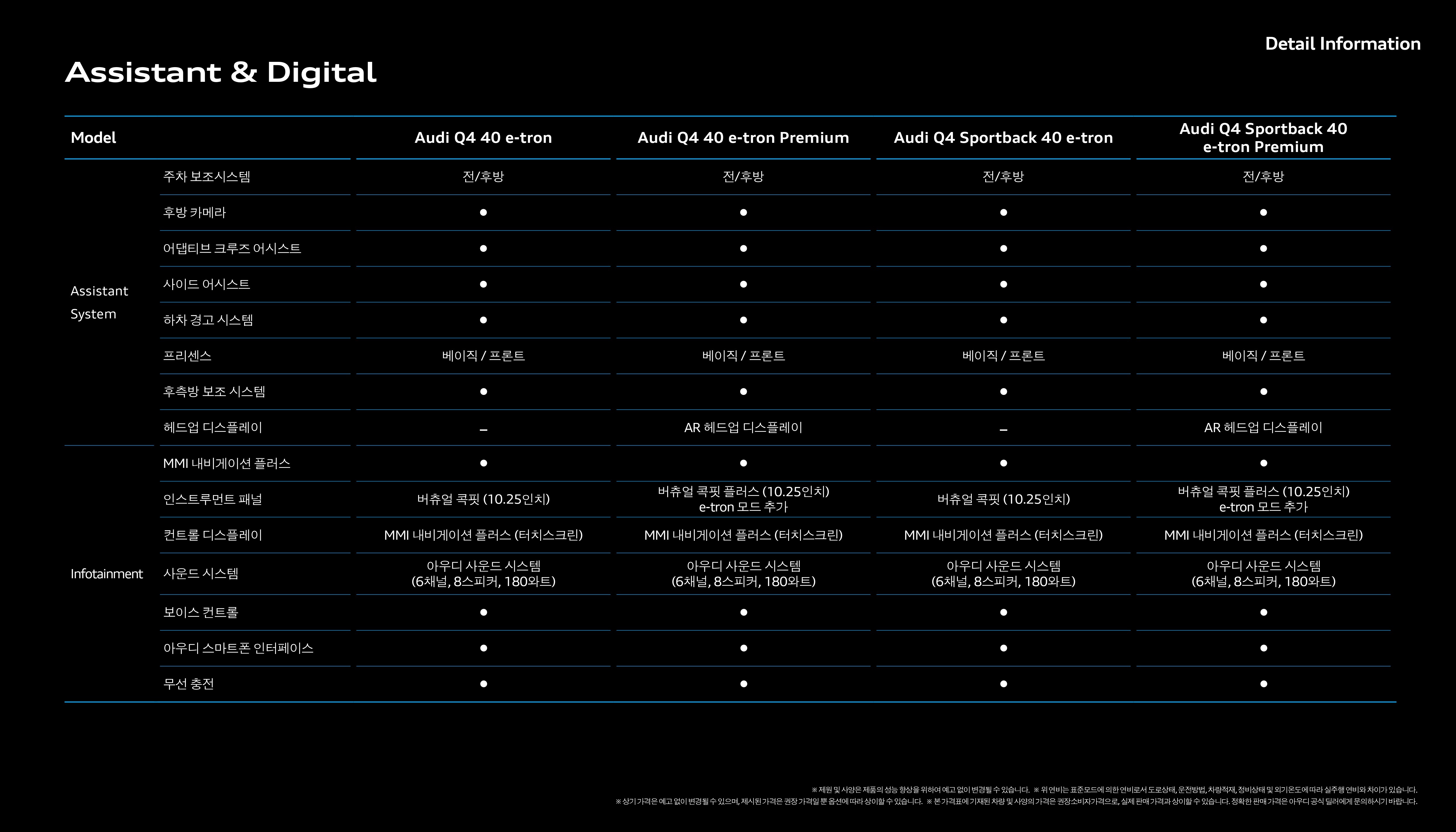 파워트레인은 40 이트론 한 가지만 판매 중이며, 트림은 모델 별로 두 가지 트림을 판매 중에 있습니다.