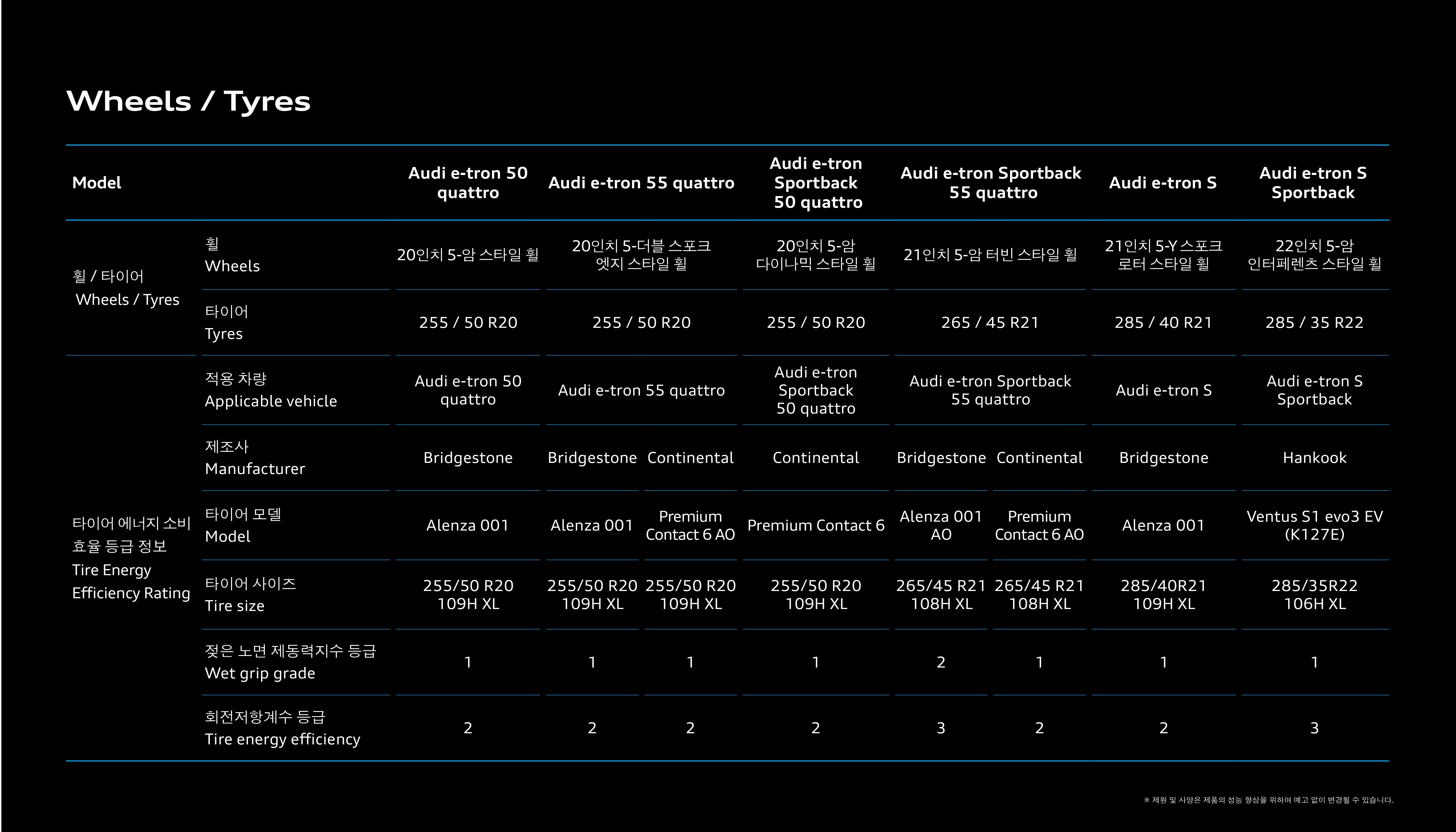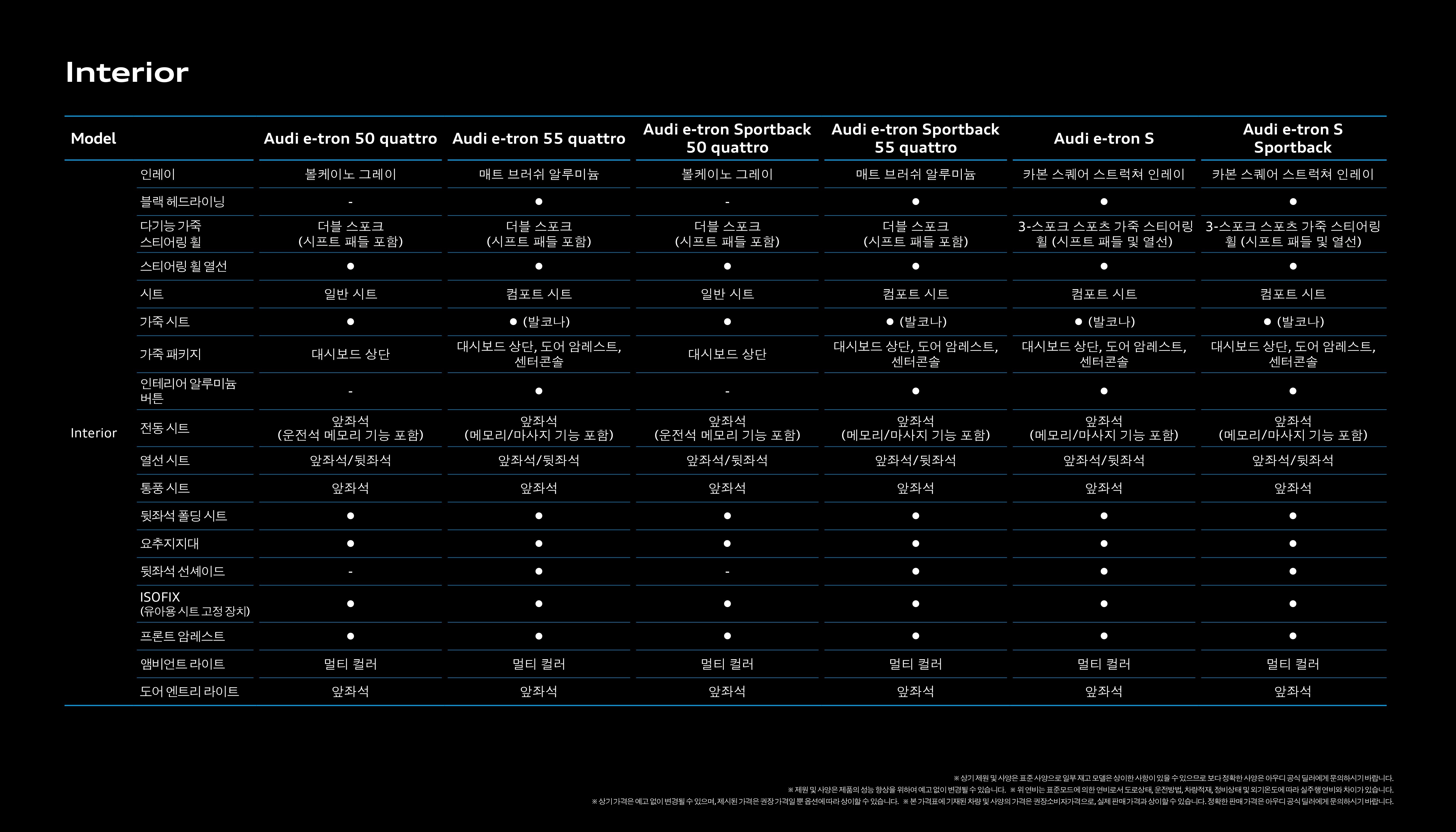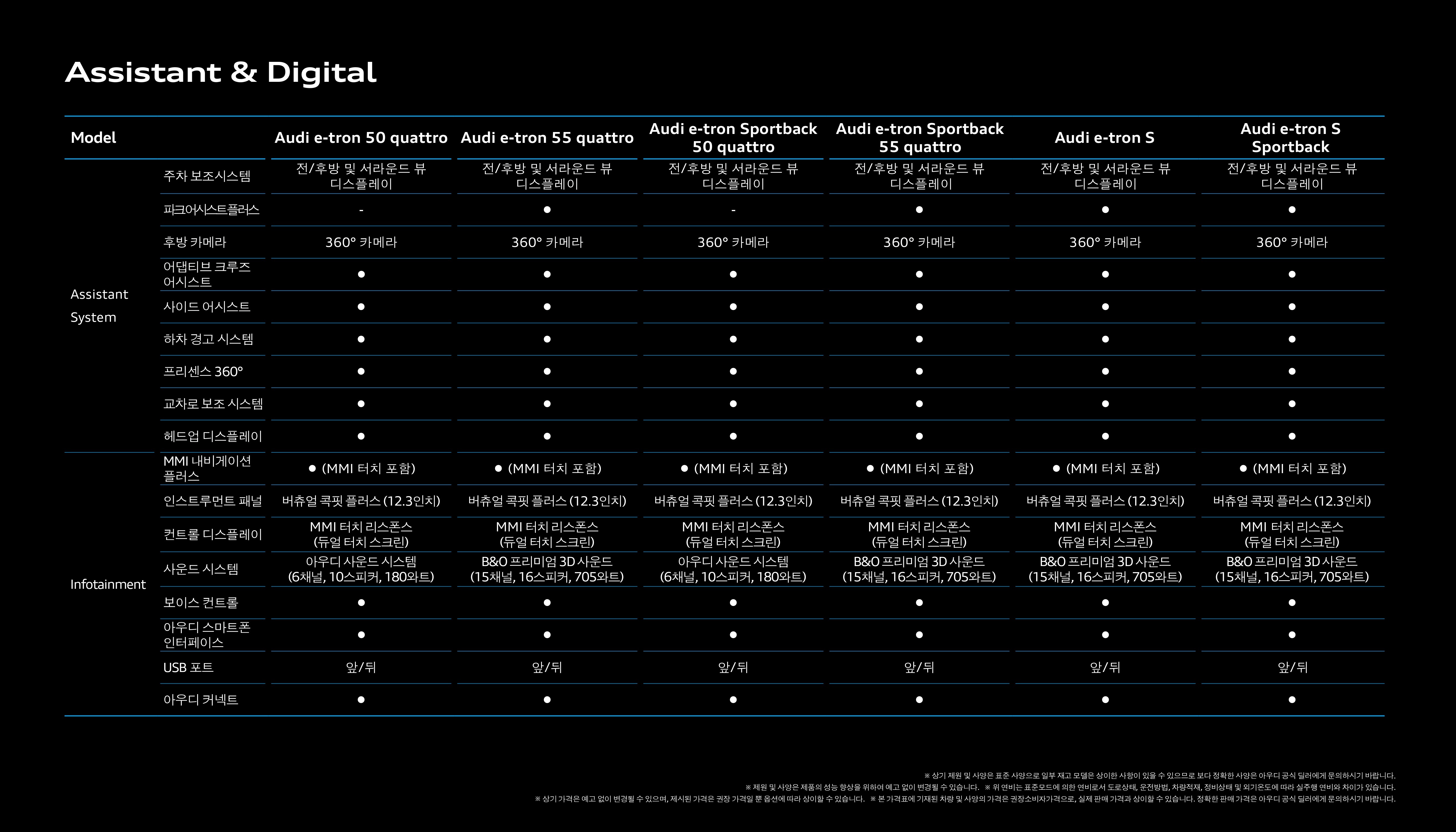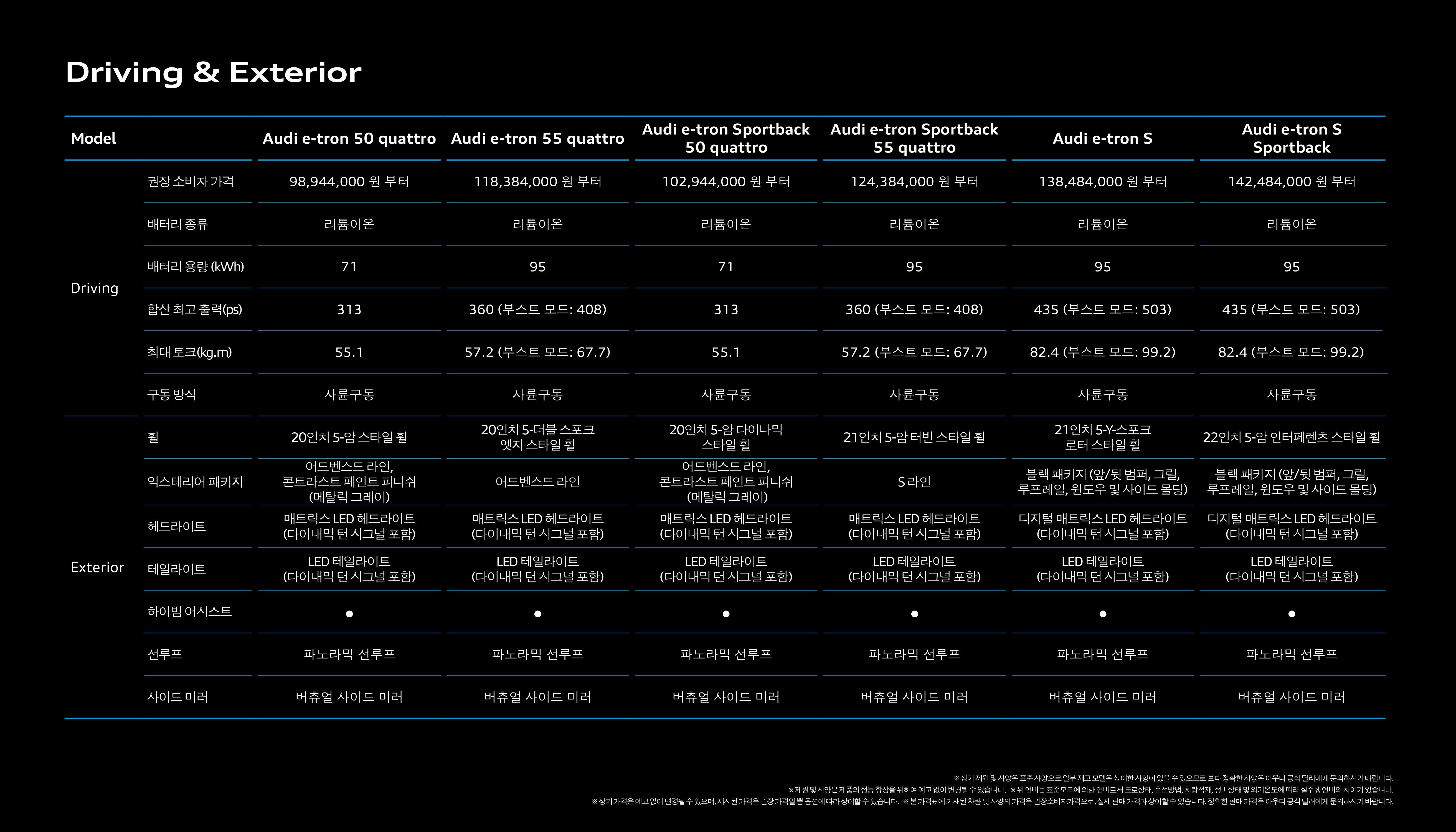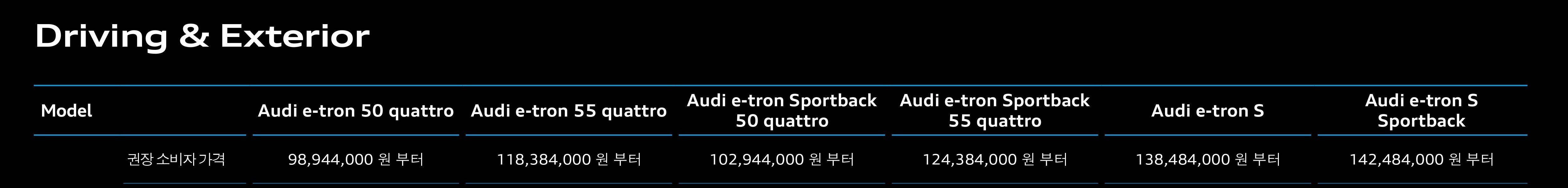 e트론은 모델 별 성능 차이도 명확하기 때문에, 제원표도 잘 살펴보셔야 합니다.