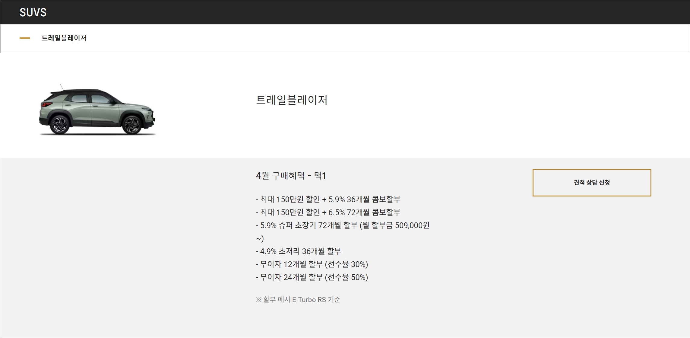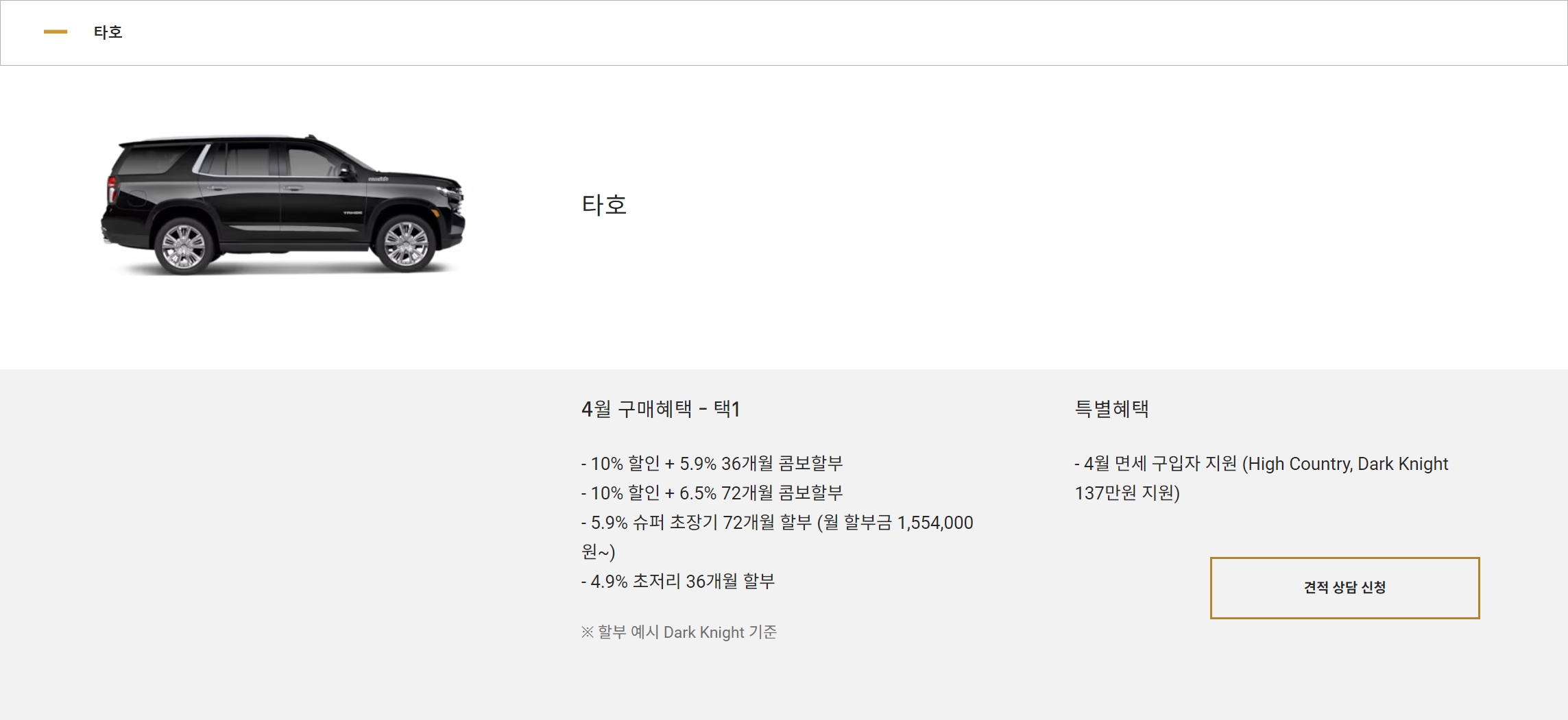 트래버스 / 타호 / 콜로라도 등은 얼른 신모델 출시를 하거나, 프로모션을 조금 더 강화해야 하지 않을까 싶은데, 요즘 환율이 너무 올라 당분간은 어려울 것 같습니다.