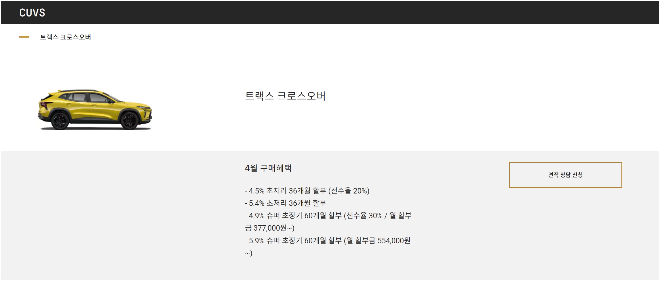 시작부터 변경된 부분만 말씀드리면, 트랙스 크로스오버의 일부 트림 변경이 있고, 이쿼녹스가 4월부터는 삭제되었다는 점입니다.