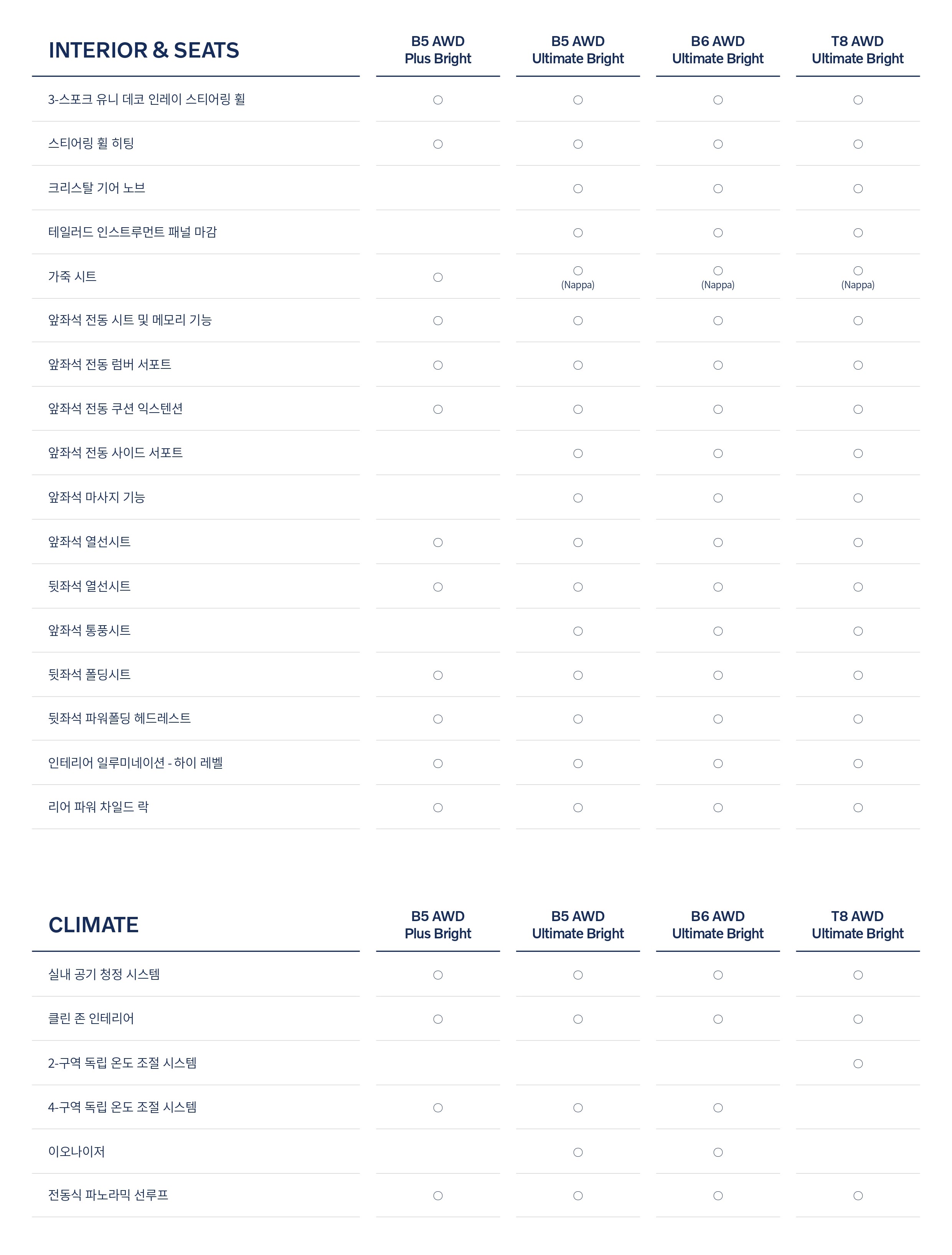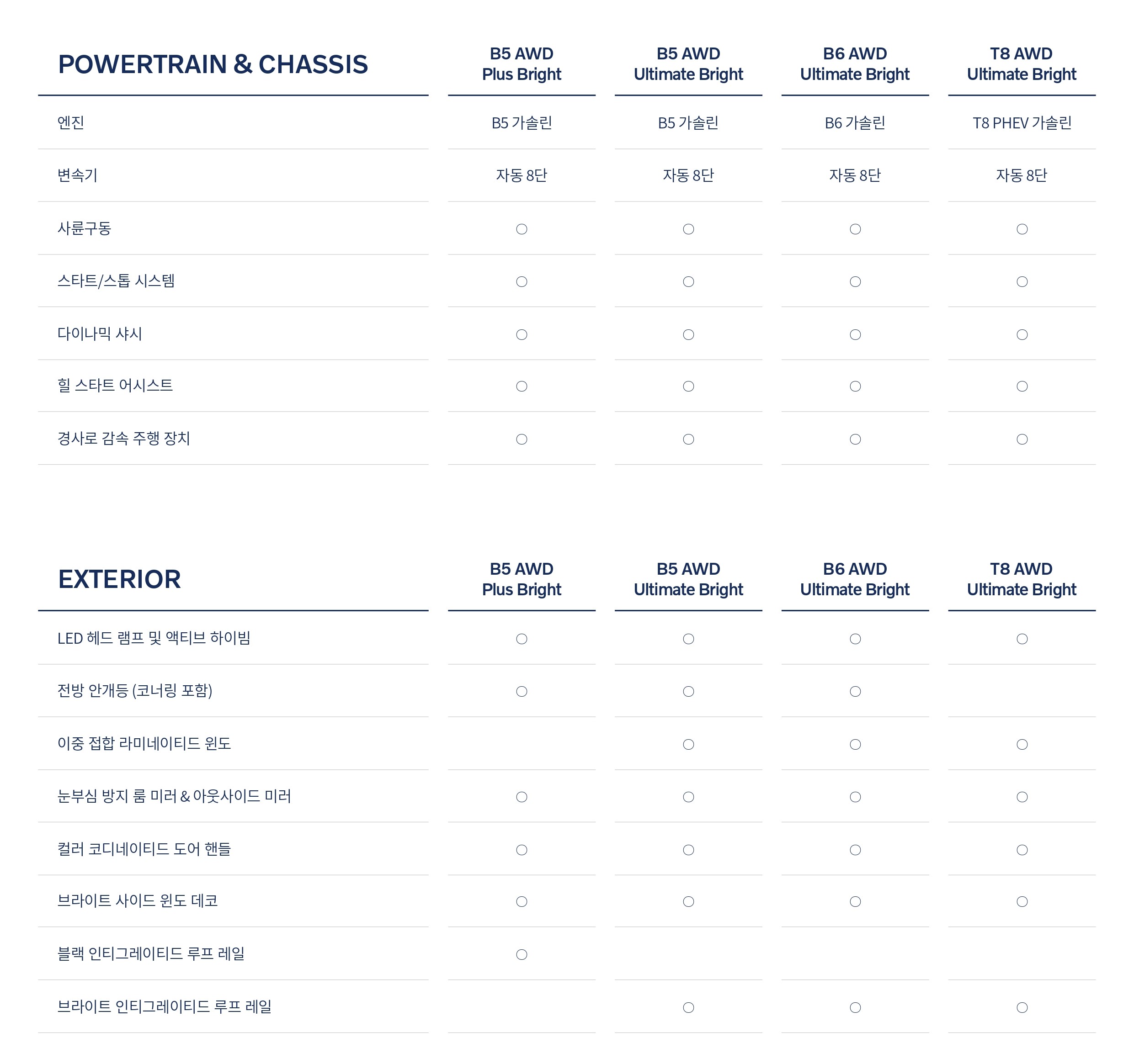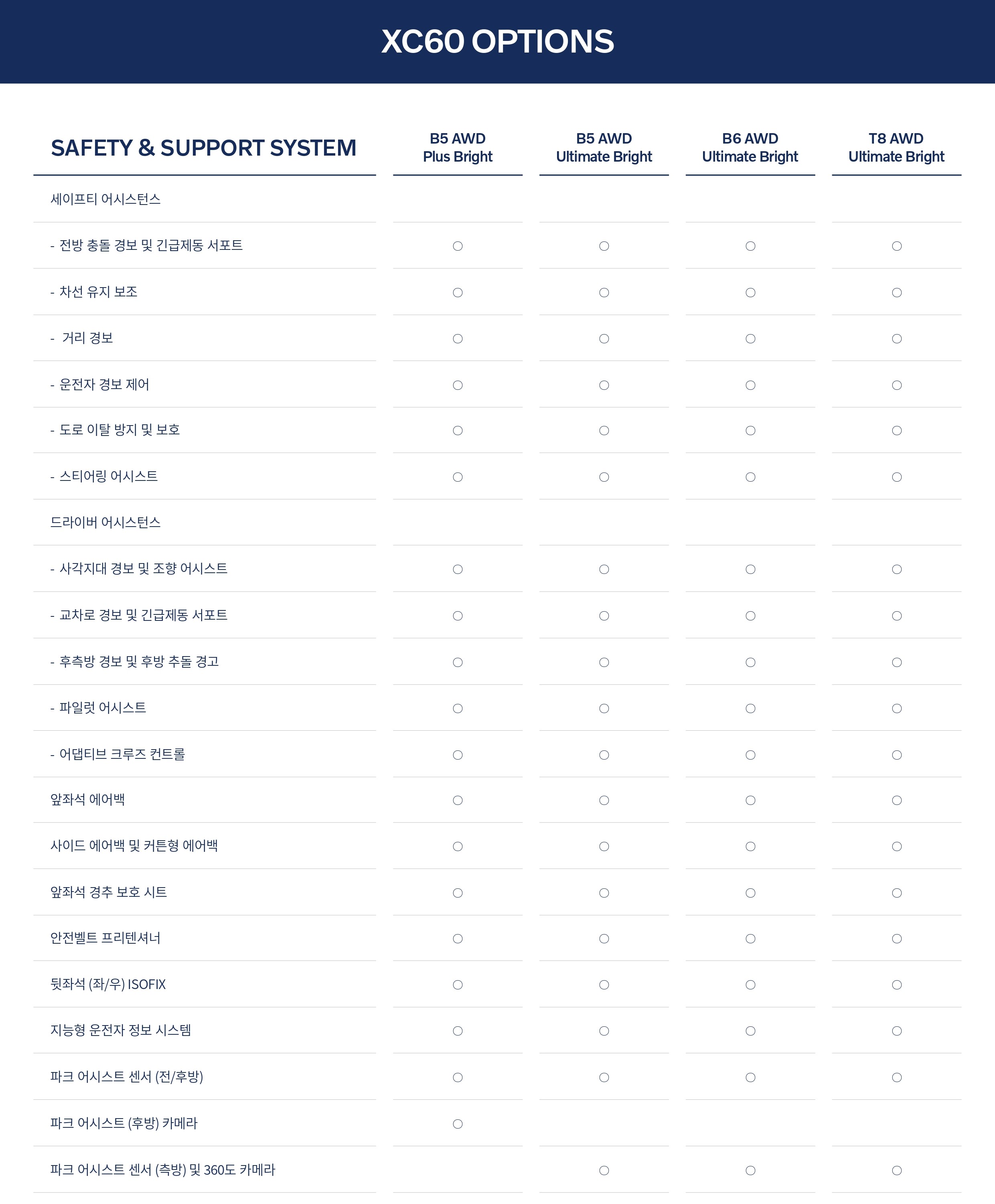 현재 판매되는 XC60 4가지 트림의 옵션표인데, 사실 B5 플러스와 얼티메이트 간 옵션 차이가 심한 편이며, B6 및 T8은 모두 얼티메이트 사양이기 때문에 옵션 차이는 적은 편입니다.