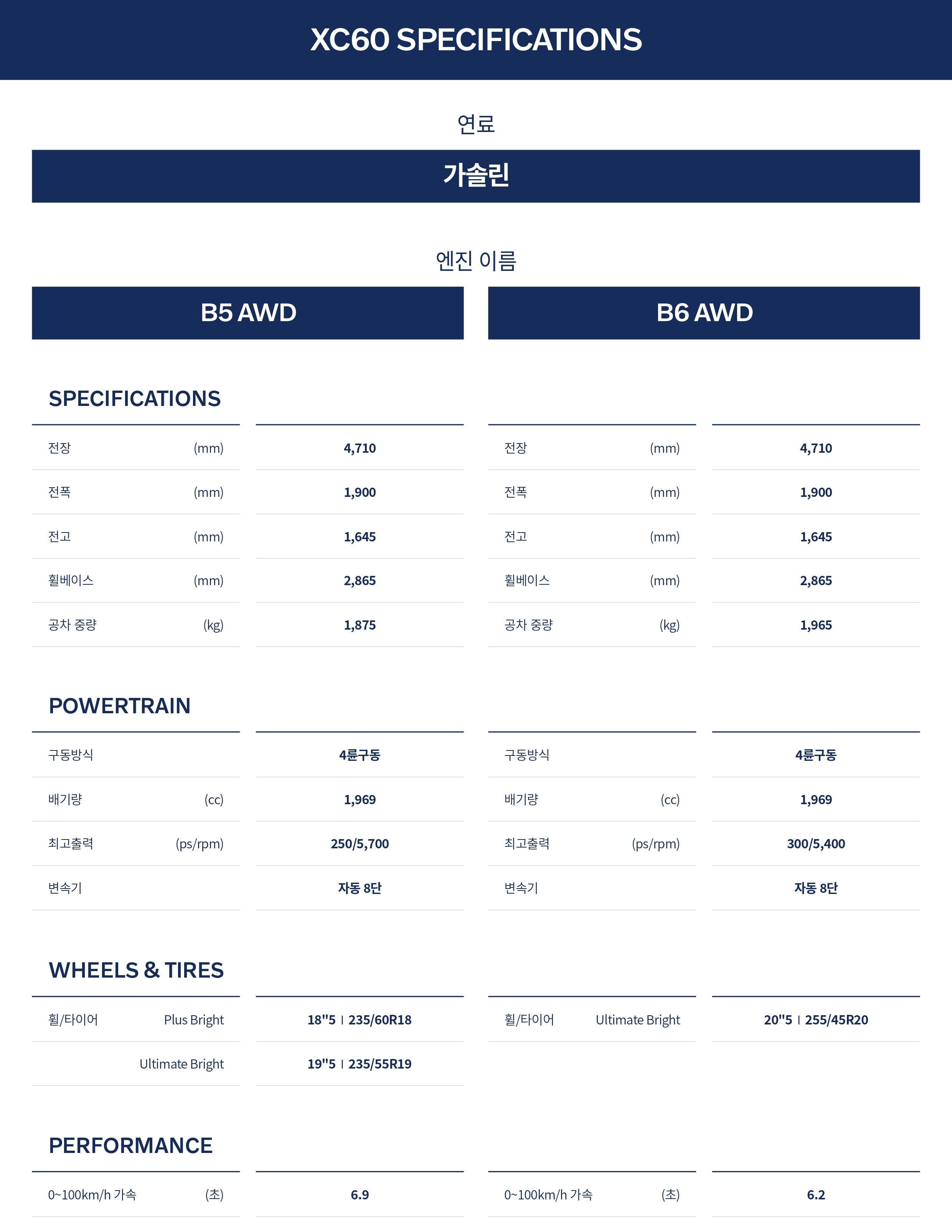 두 모델 간의 차이는 엔진 출력과 휠 크기 차이가 전부입니다. 참고로, 볼보는 출력과는 상관없이 전 모델 고급유 권장이니 이 점 또한 잘 고려하시기 바랍니다.
