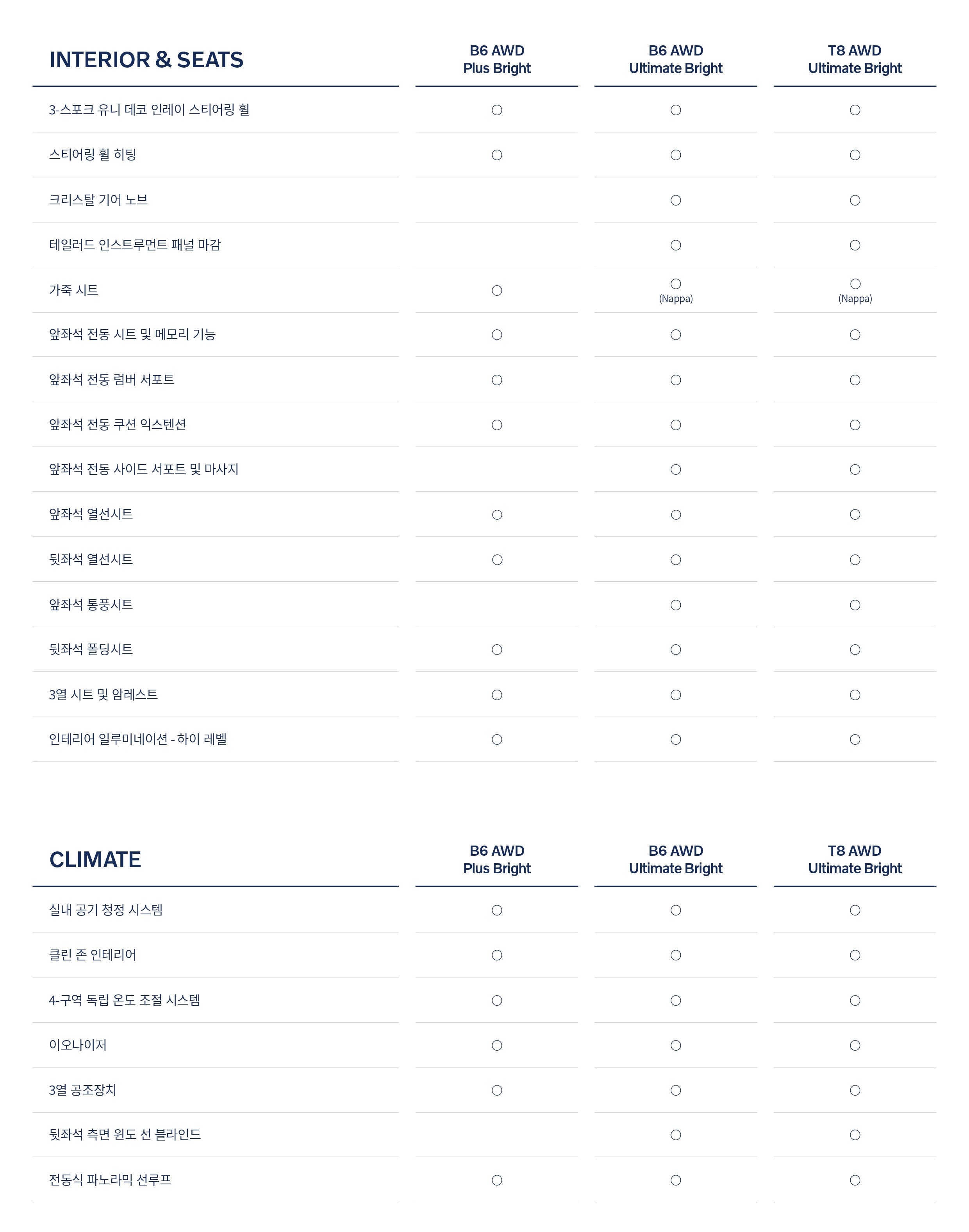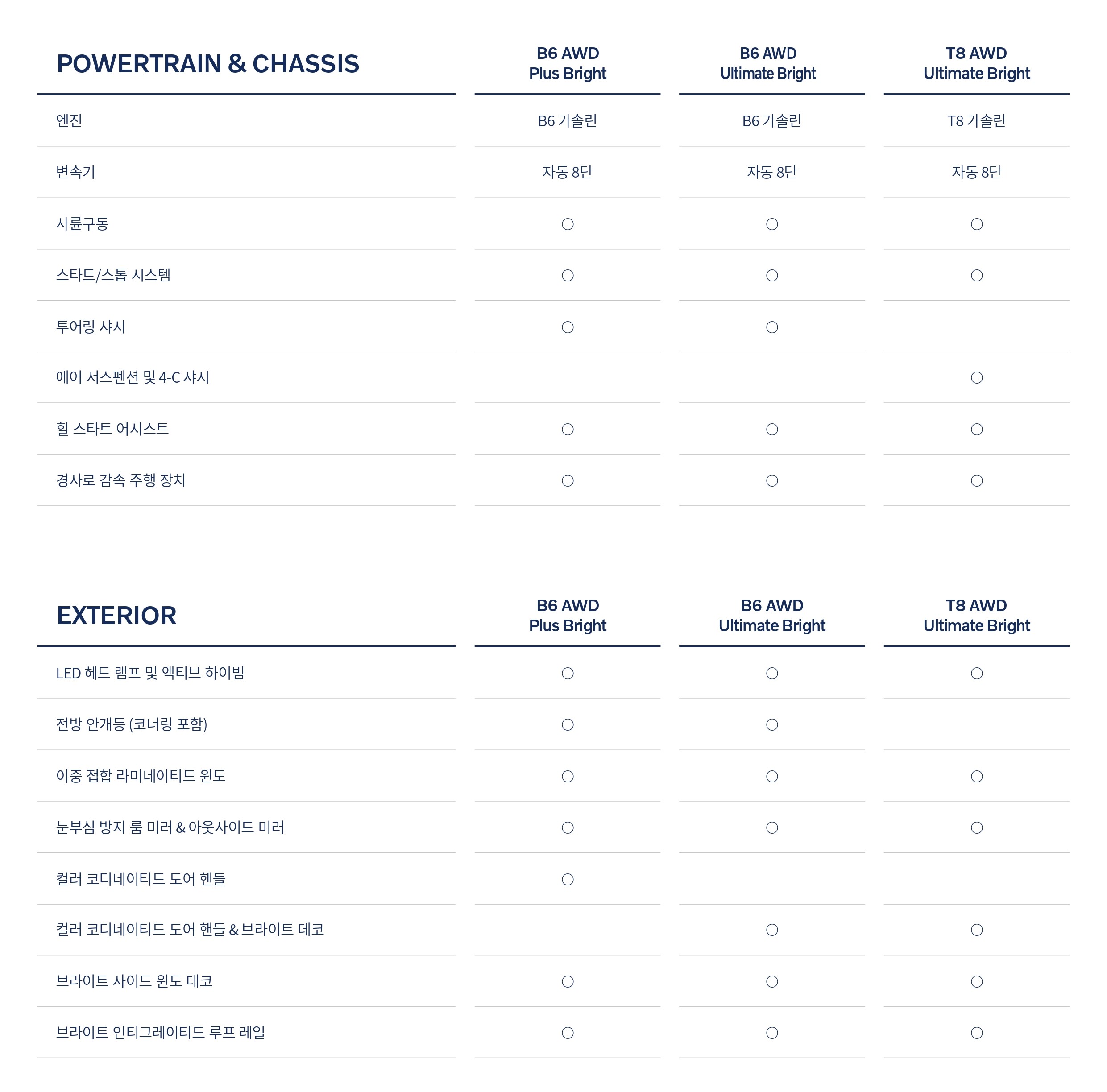 다음은 B6 모델과 T8 모델을 고민하시는 분들을 위한 옵션 비교입니다.