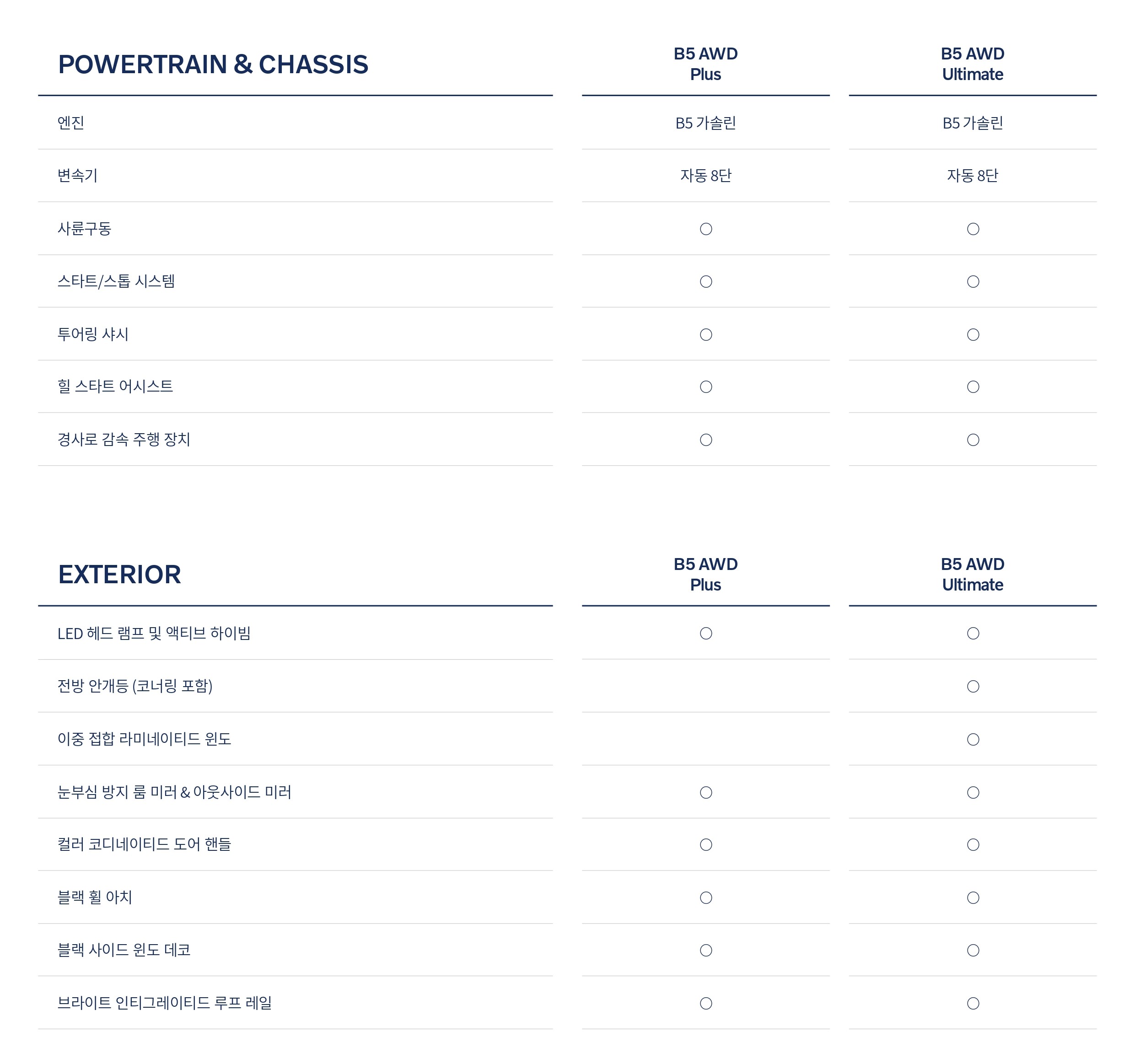 앞서 말씀드린 것과 같이, 파워트레인이 B5 단일로만 판매가 되기 때문에 비교까지는 할 게 없습니다.