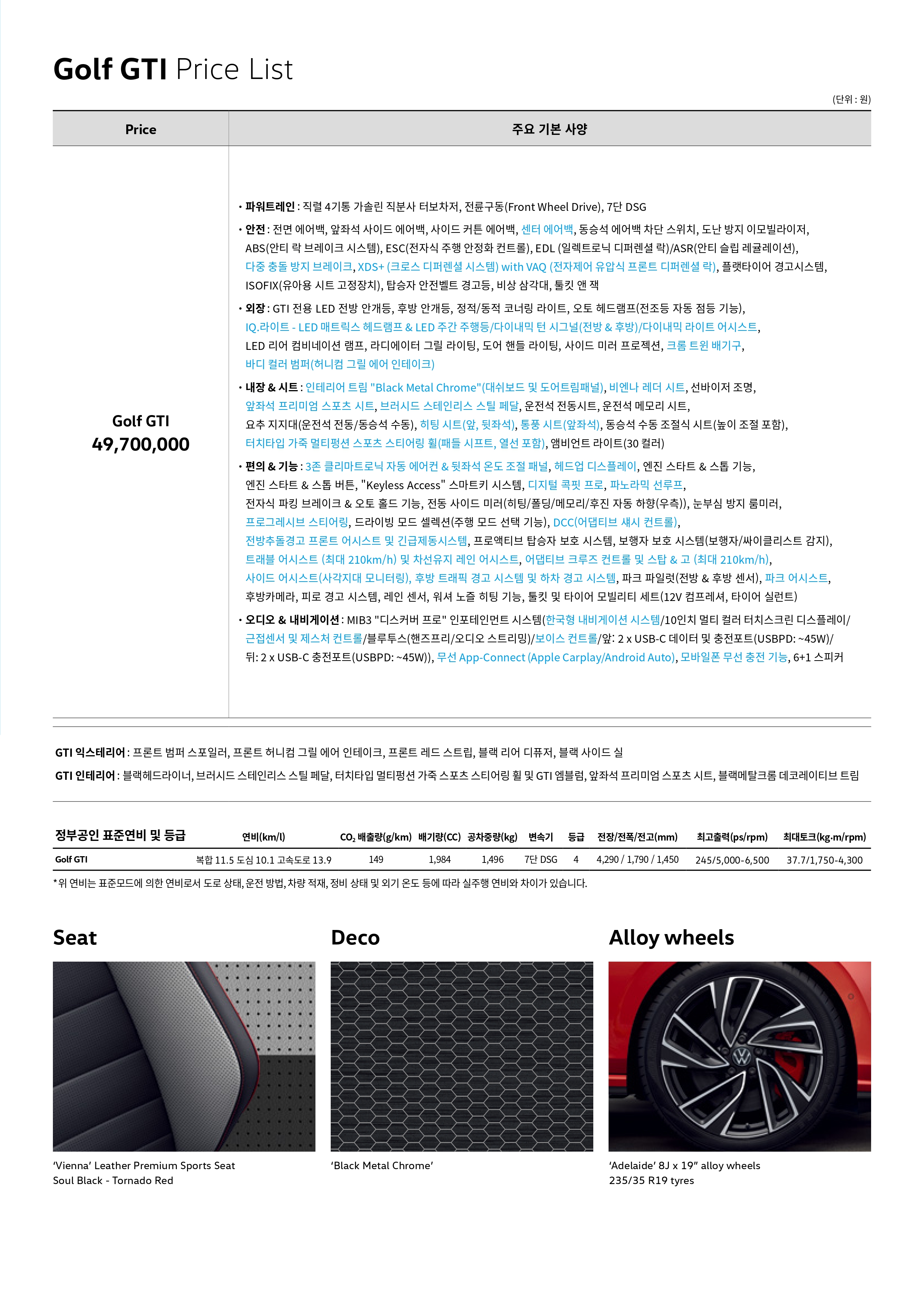 일반 골프 모델과는 달리, 골프 GTI는 단일 구성이라 옵션 비교를 할만한 건 없네요.