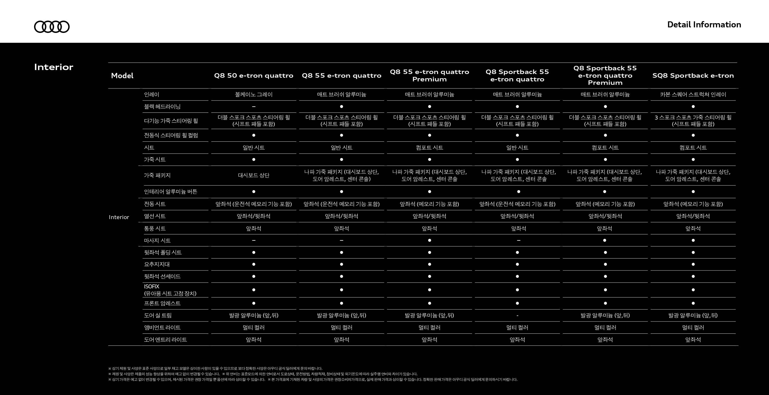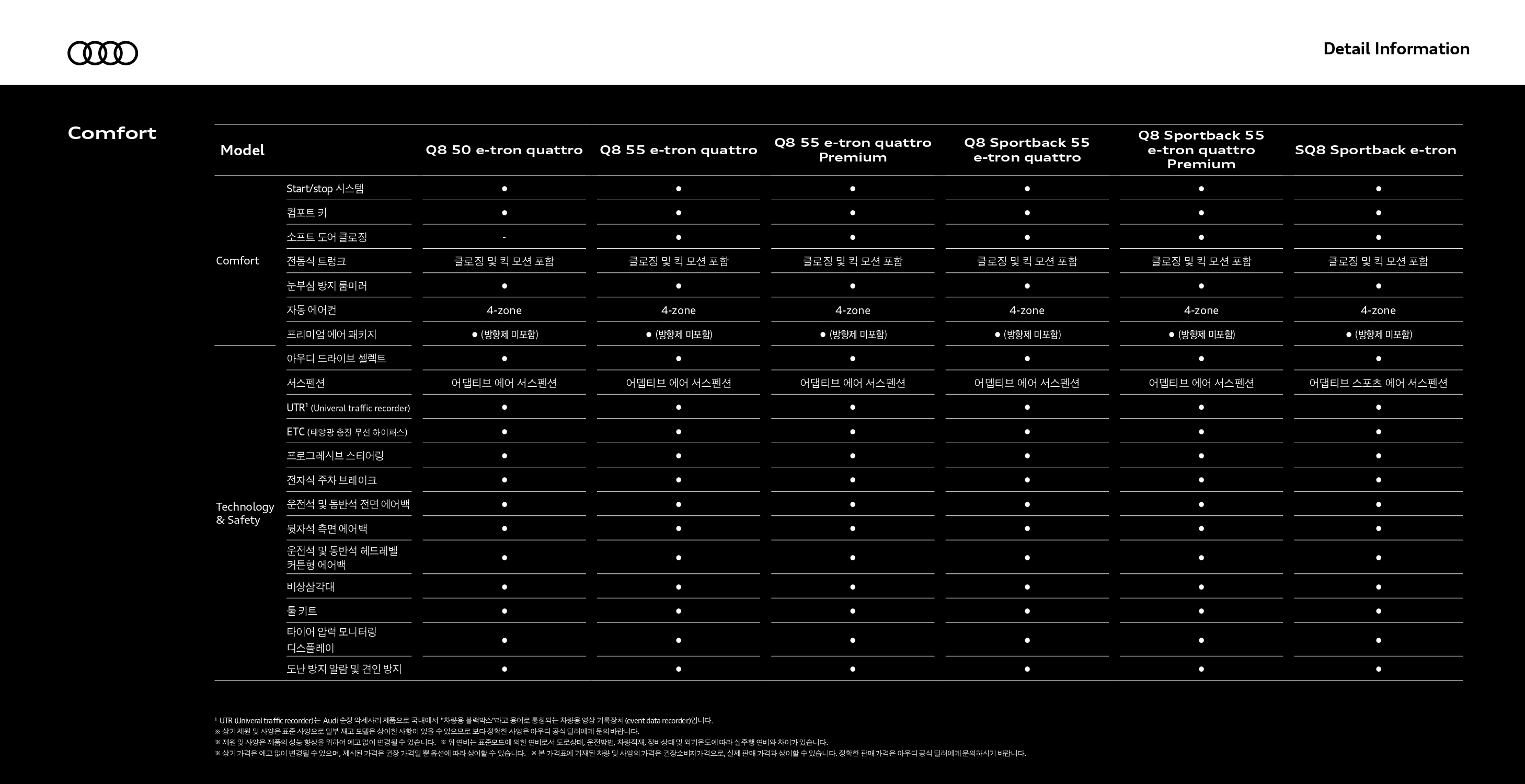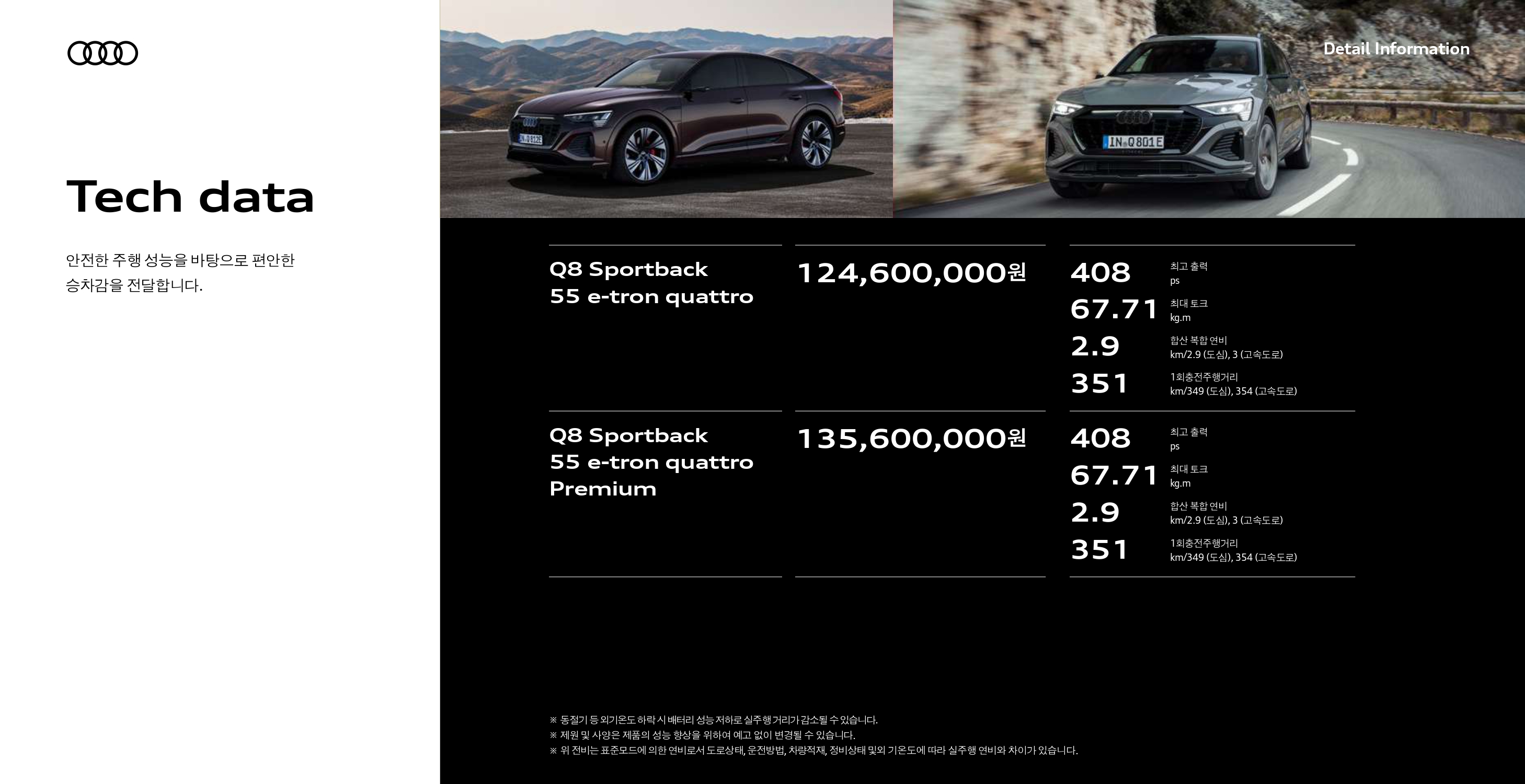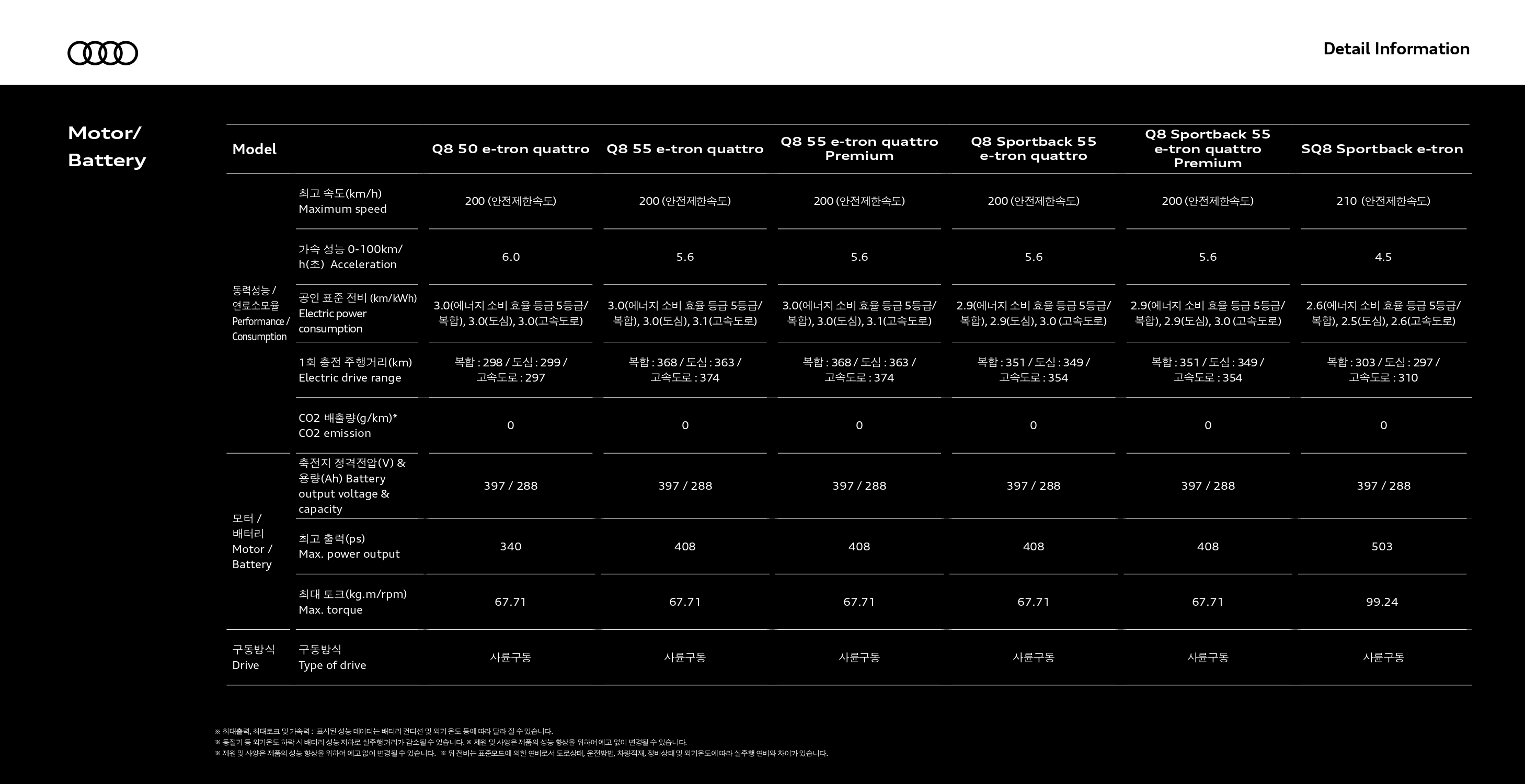 다음은 Q8 e-트론 시리즈의 스펙(제원) 입니다.