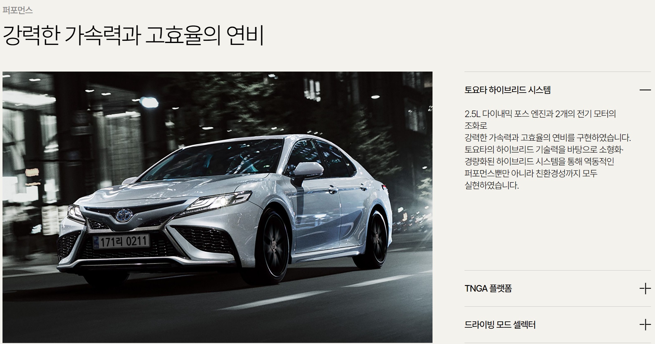 예전 캠리는 일반 가솔린 모델과 하이브리드 등 다양한 파워트레인이 수입이 되었지만, 지금은 오직 하이브리드 파워트레인만 수입이 되고 있습니다.