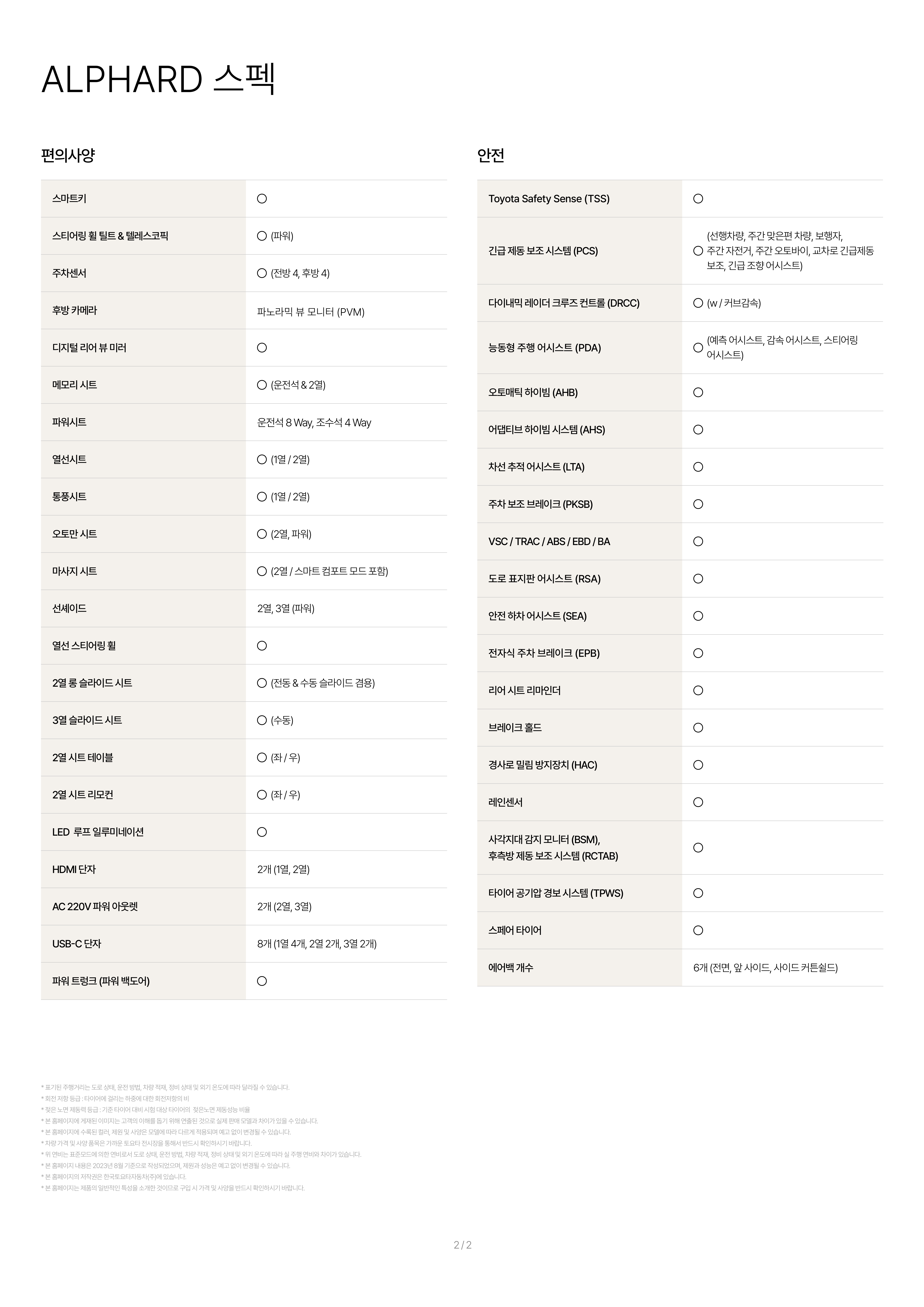 혹시나 필요하신 분이 계실까 봐, 제원 및 옵션표, 그리고 일본 토요타 홈페이지에서 받은 알파드 카탈로그 일본어 버전도 함께 공유드립니다.