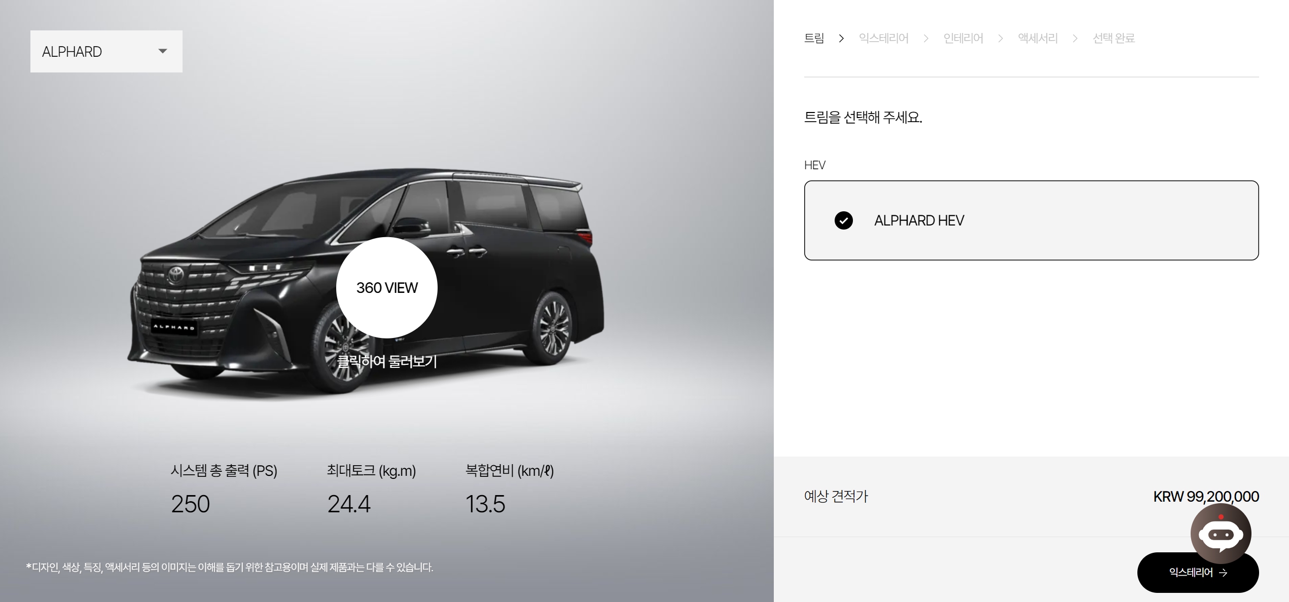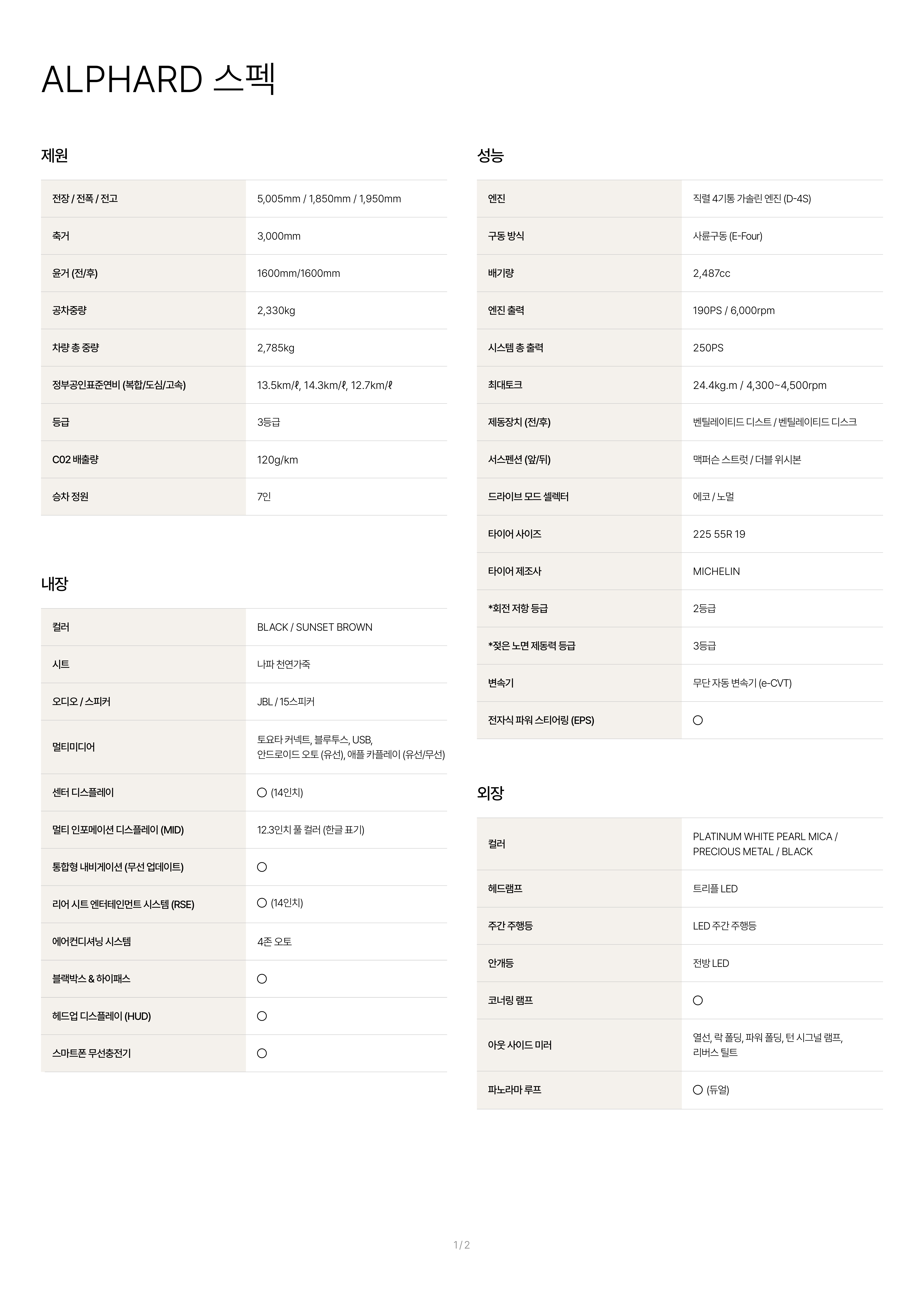 다음은 알파드 모델의 옵션과 스펙입니다.