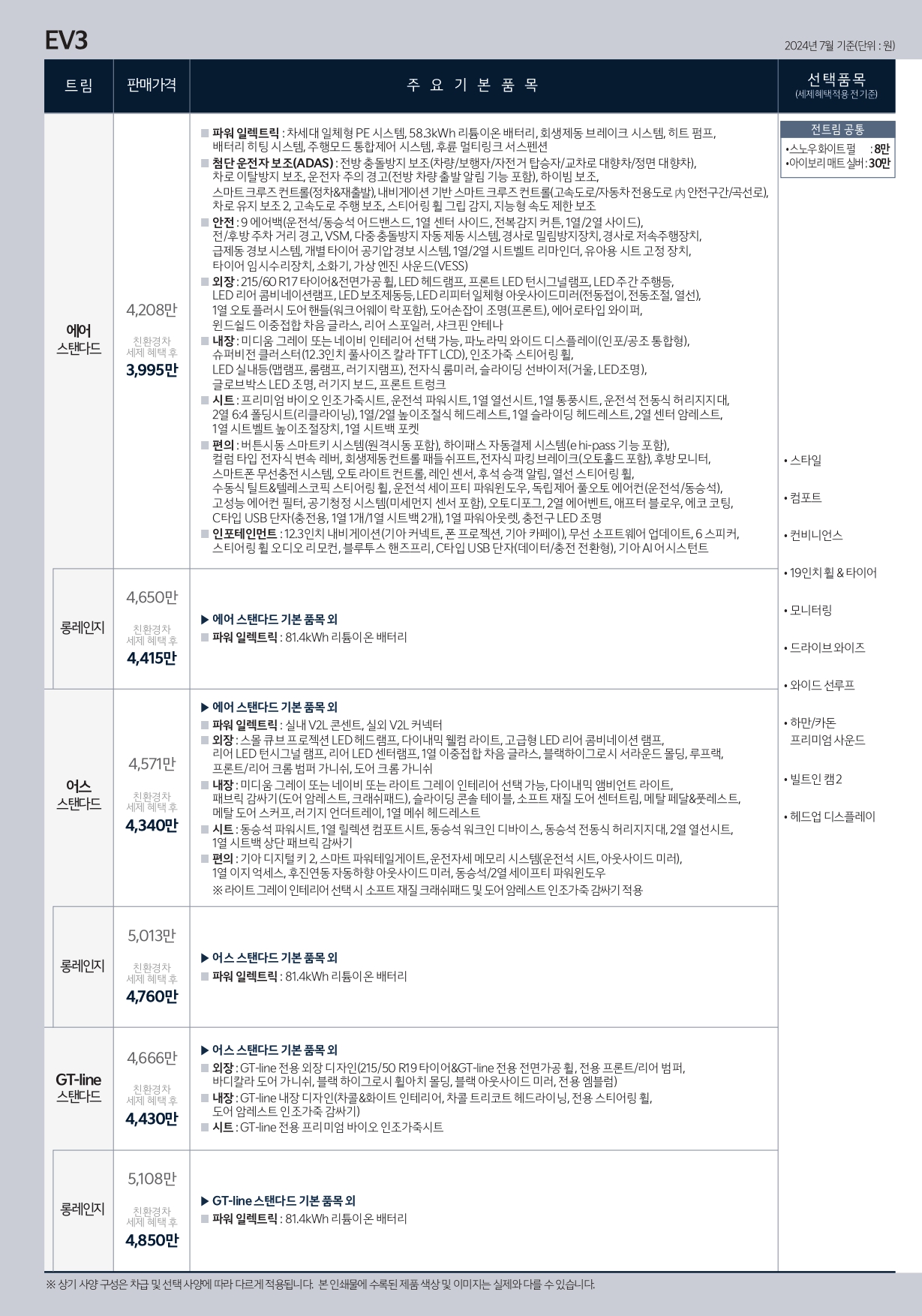 각 트림별로 선택할 수 있는 옵션의 종류와 그 가격이 다르기 때문에 유심히 보셔야 합니다.