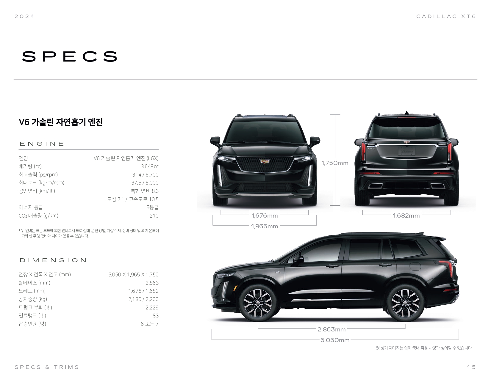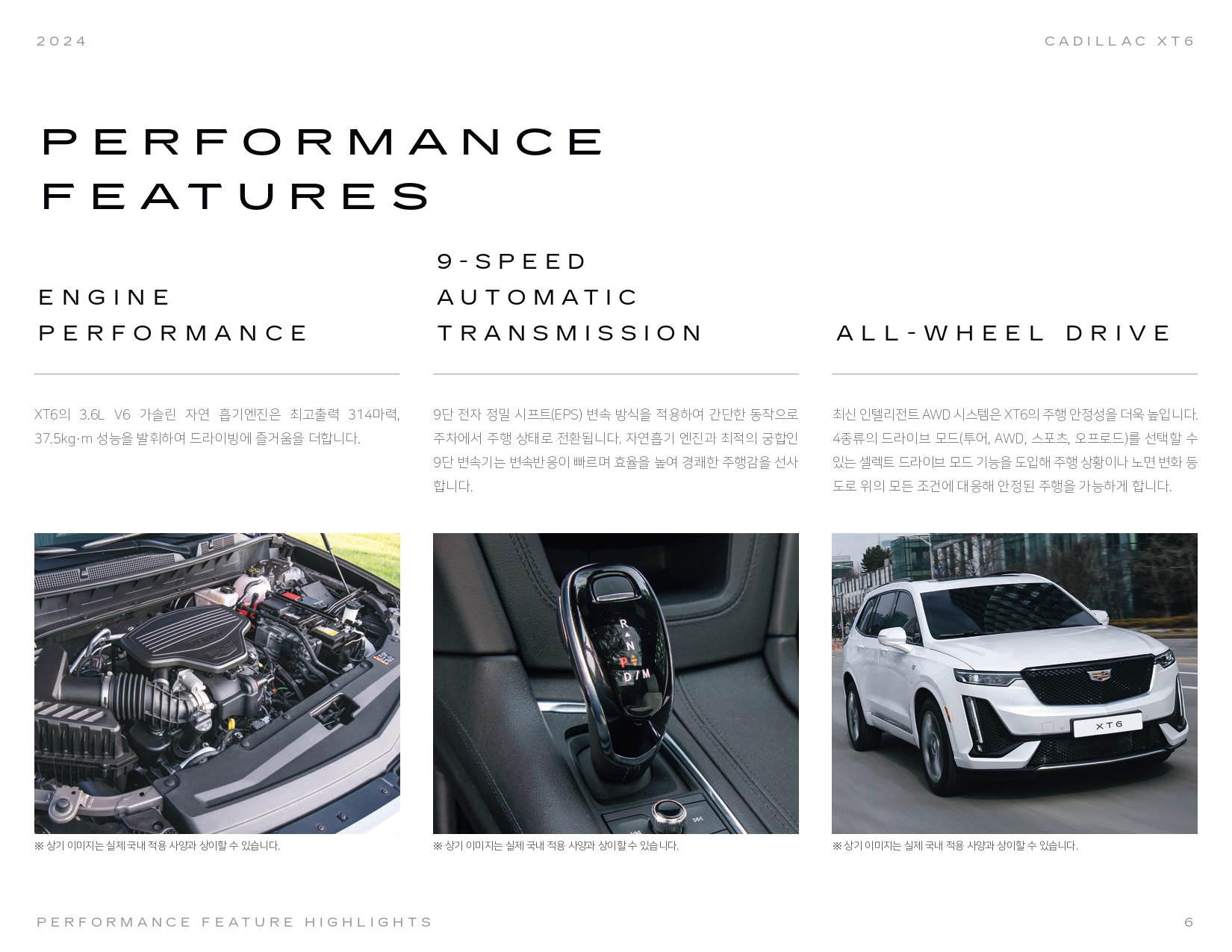한국에 수입되는 캐딜락 XT6 는 V6 3.6 가솔린 자연흡기 엔진만을 탑재하고 있고, 변속기는 9단, 4륜 구동이 기본 탑재됩니다.