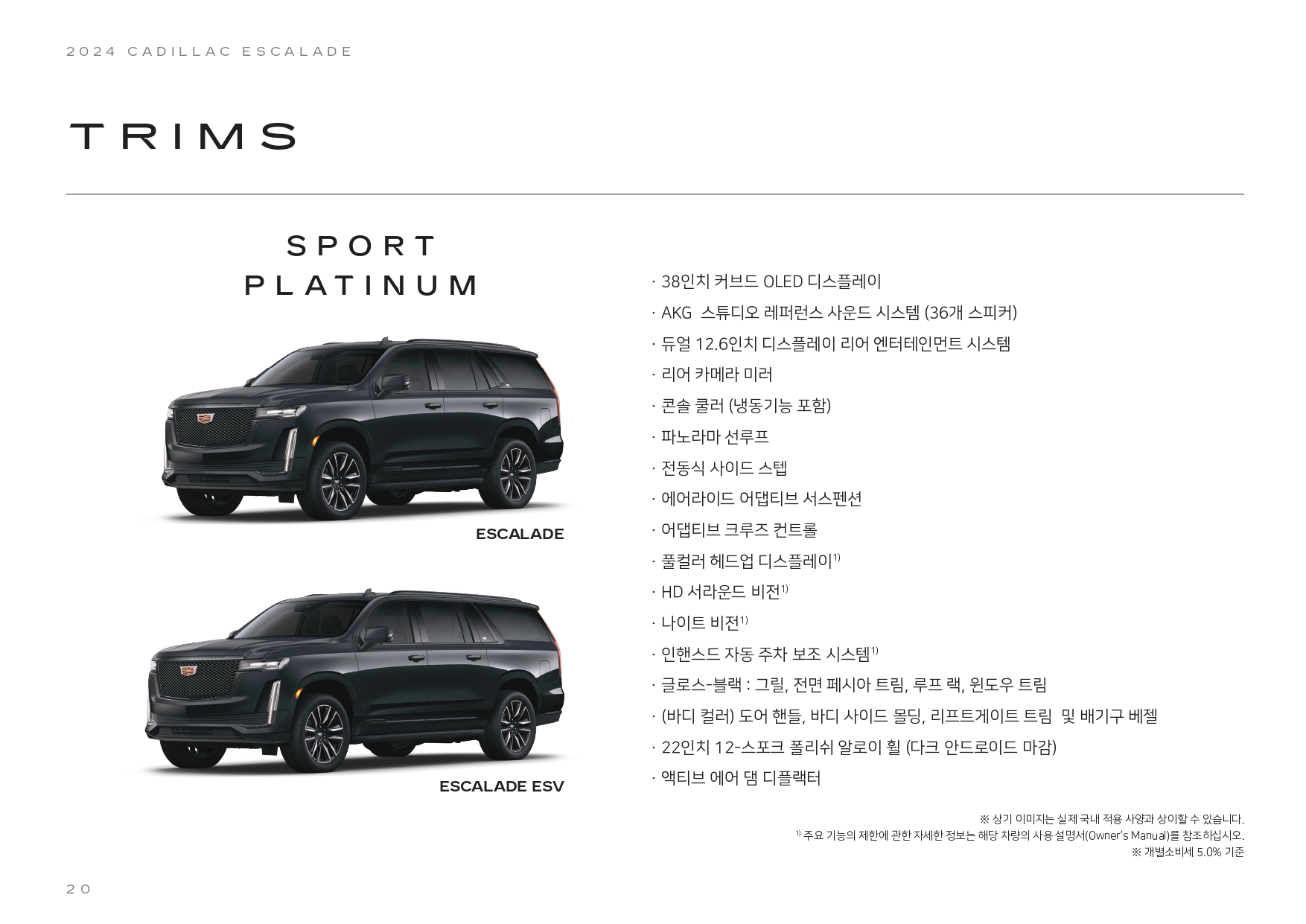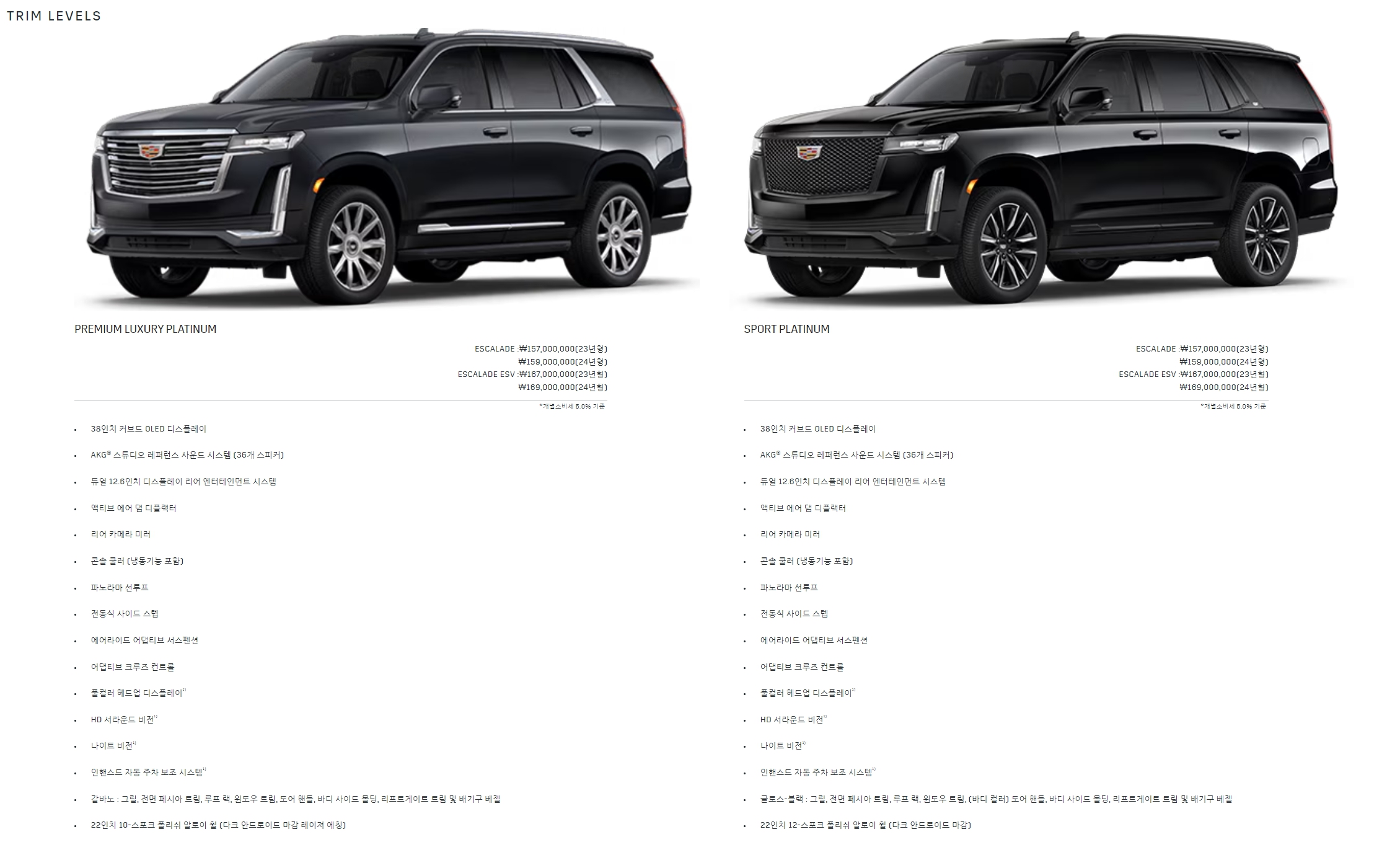 타 캐딜락 모델의 경우, 인기가 워낙 없어서 그런지 단일 트림으로 수입을 하는 모델이 대부분이지만, 에스컬레이드는 인기 모델답게 트림 또한 두 가지가 수입됩니다.