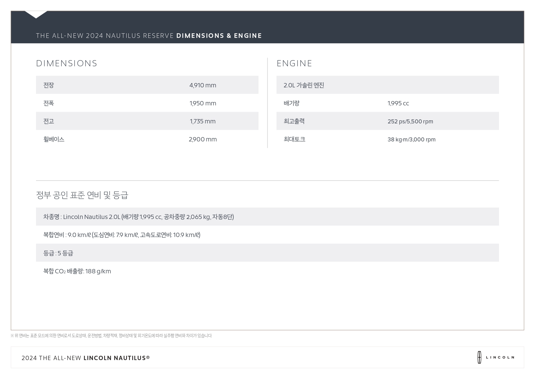 마지막으로 링컨 노틸러스의 간단한 제원입니다.
