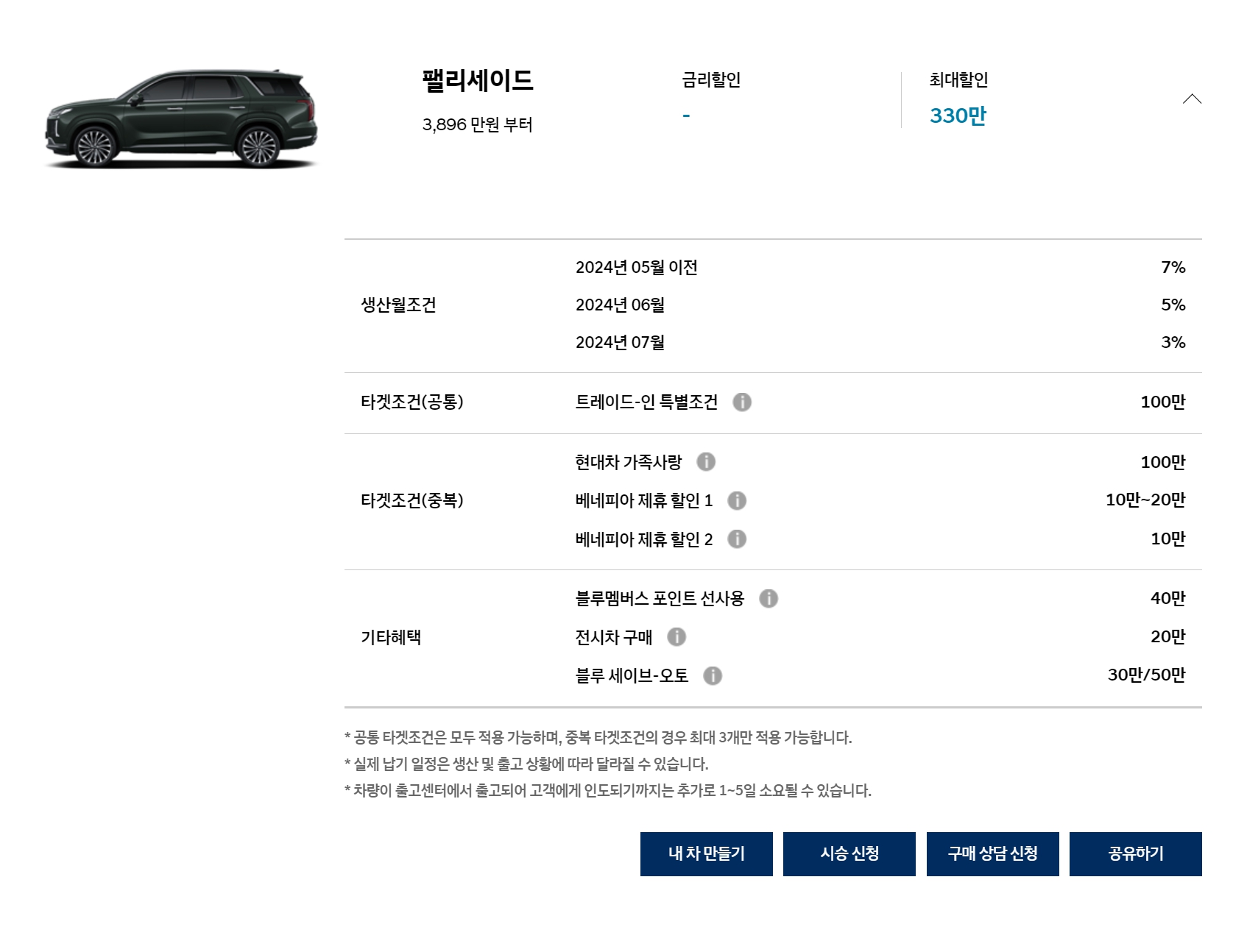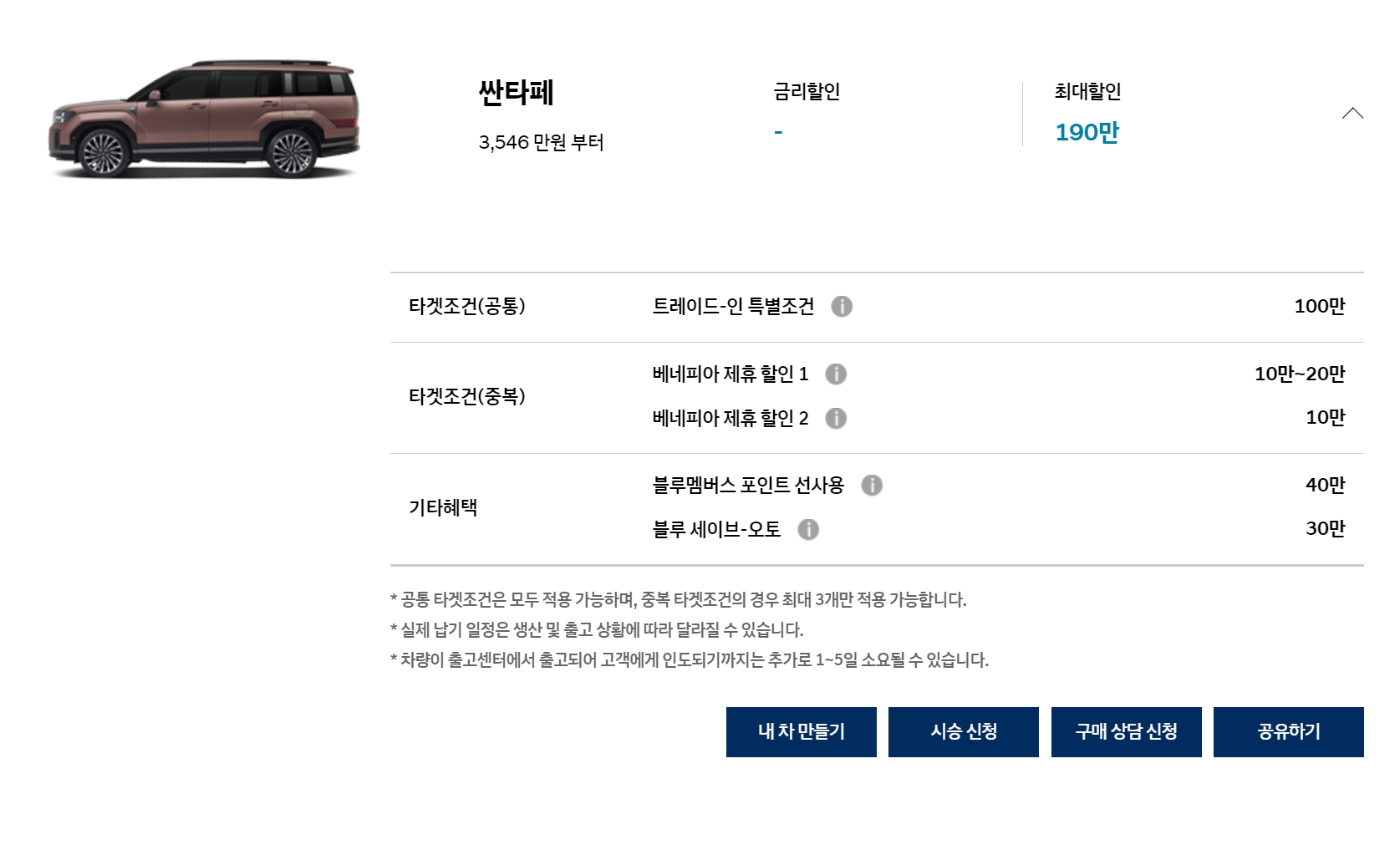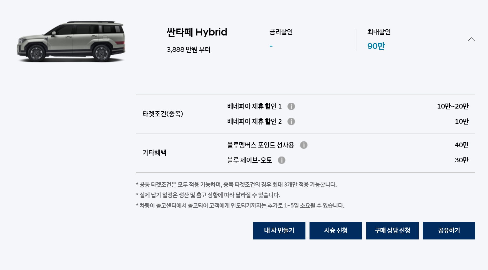 이번 달은 코나와 싼타페 구매 조건이 대폭 나빠졌고, 반대로 팰리세이드의 할인 조건은 매우 좋습니다.