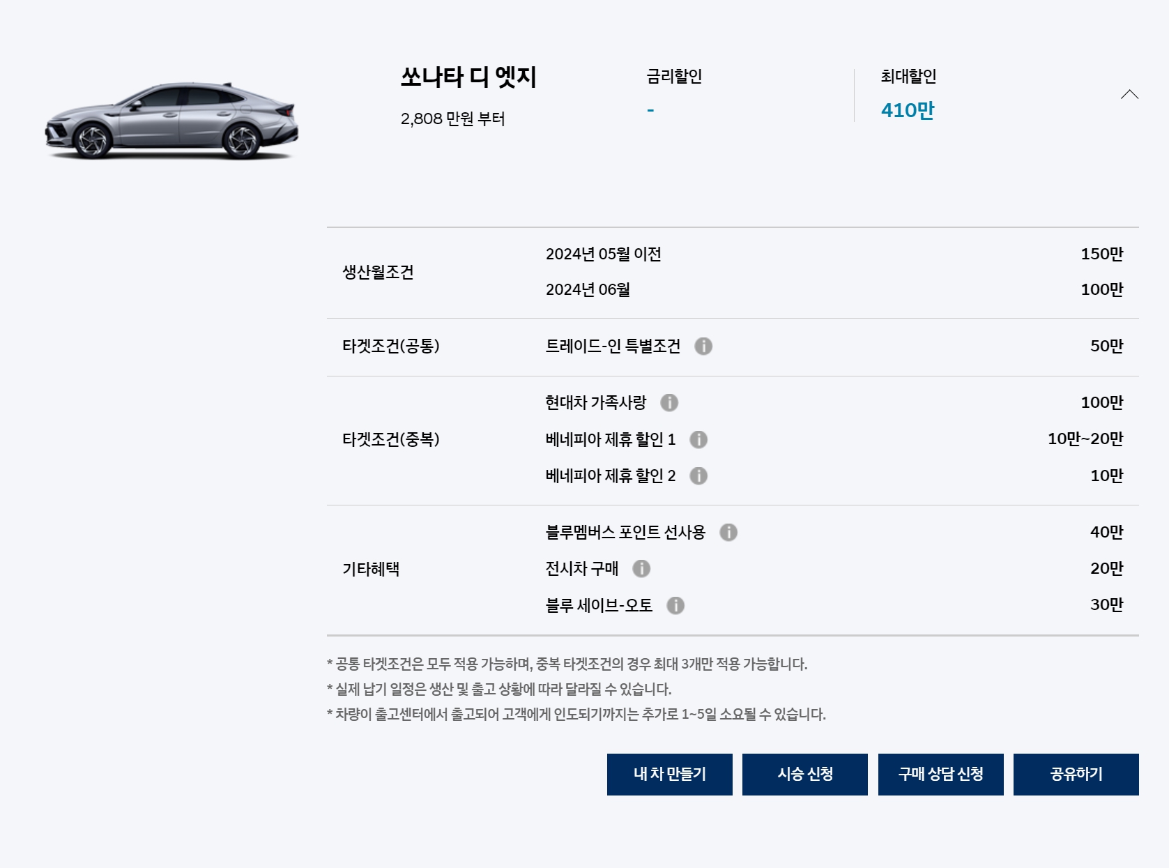 일반 쏘나타의 경우, 지난달 대비 재고할인이 200 -> 150만원으로 줄어들었습니다.