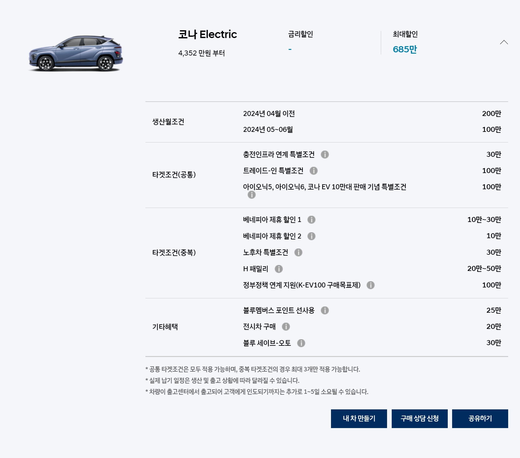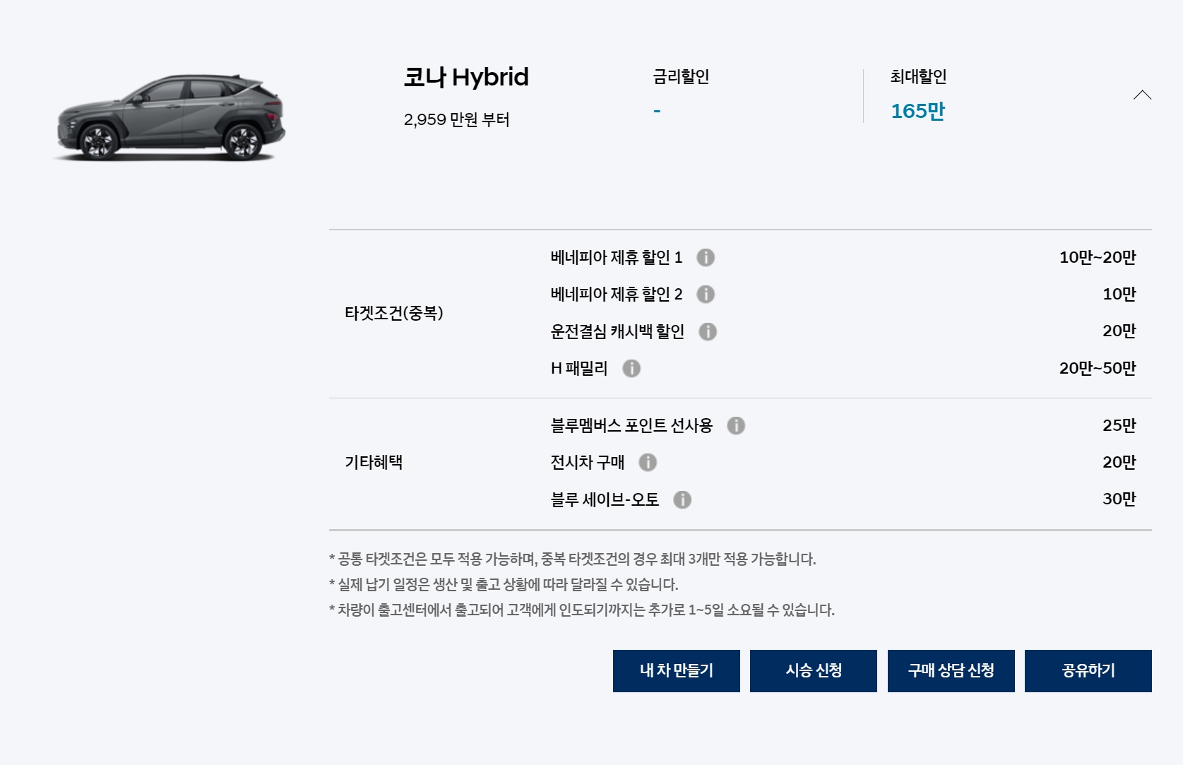 코나 하이브리드 모델은 원래 프로모션이 없었고, 이번 달도 동일하게 없습니다.