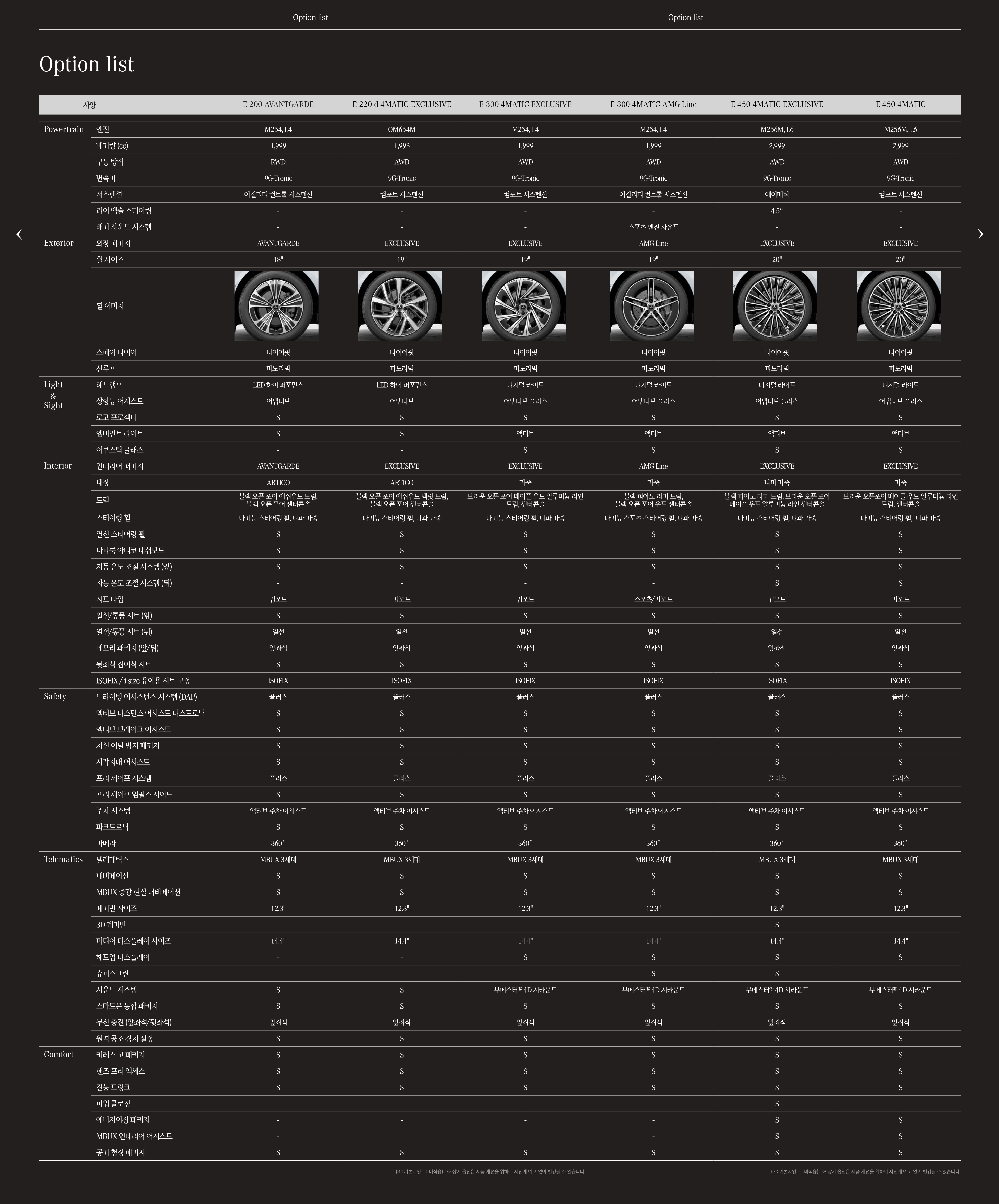 E클래스 전 모델의 옵션표를 준비해 보았습니다.