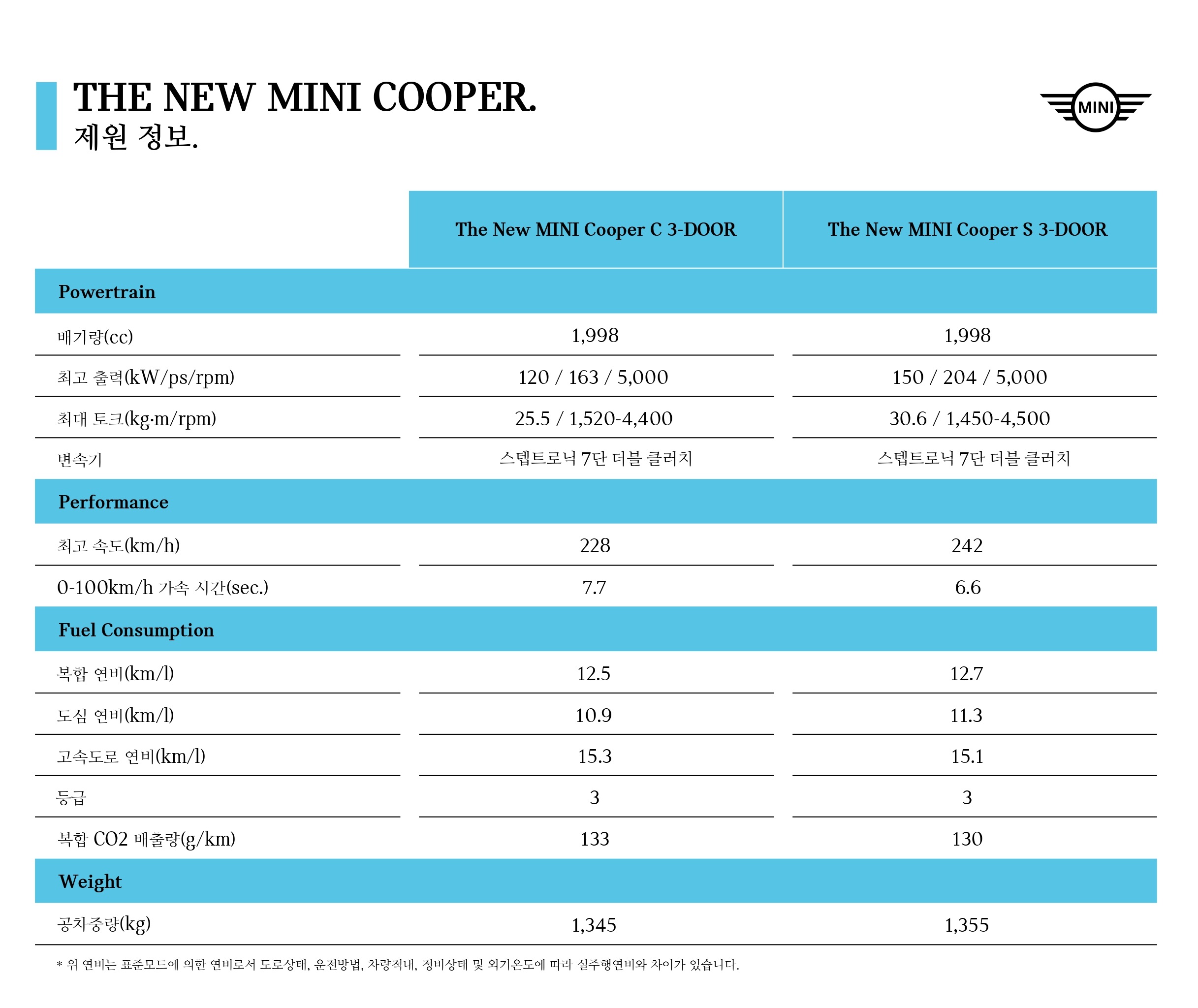 구형 미니쿠퍼의 경우, 미니쿠퍼 C는 3기통 1.5 터보 엔진이었으나, 신형은 전 트림 4기통 2.0 터보 입니다.