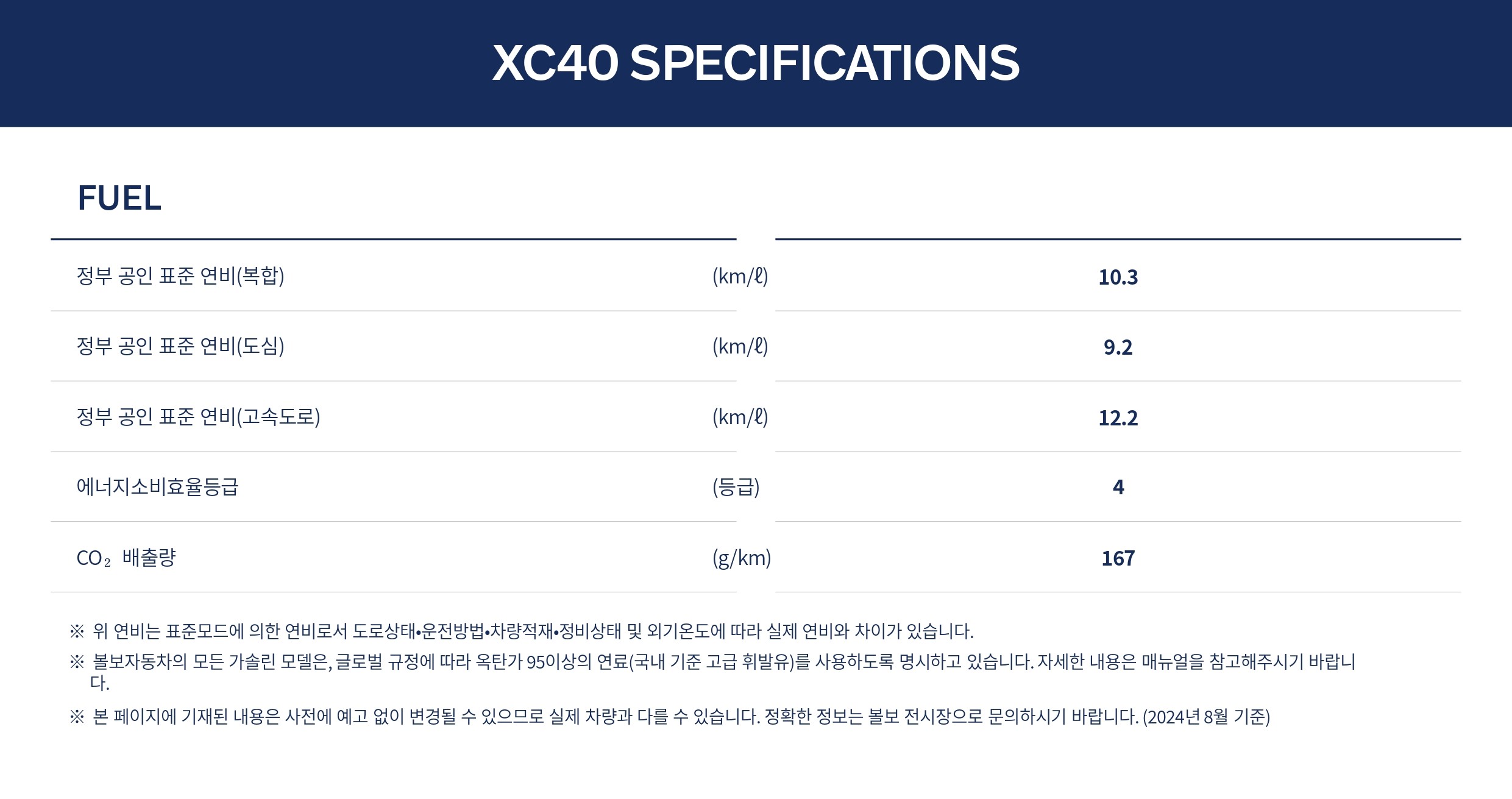 반면, B4 엔진을 사용하는 XC40은 전 구간 연비 저하 및 이산화탄소 배출량이 증가하였습니다.