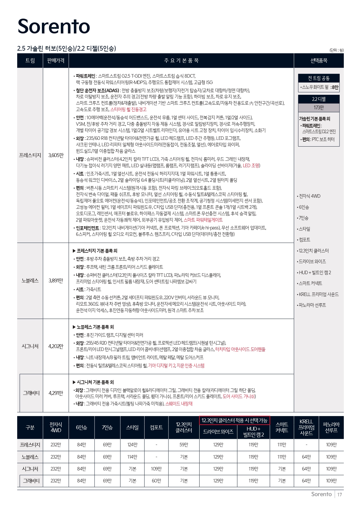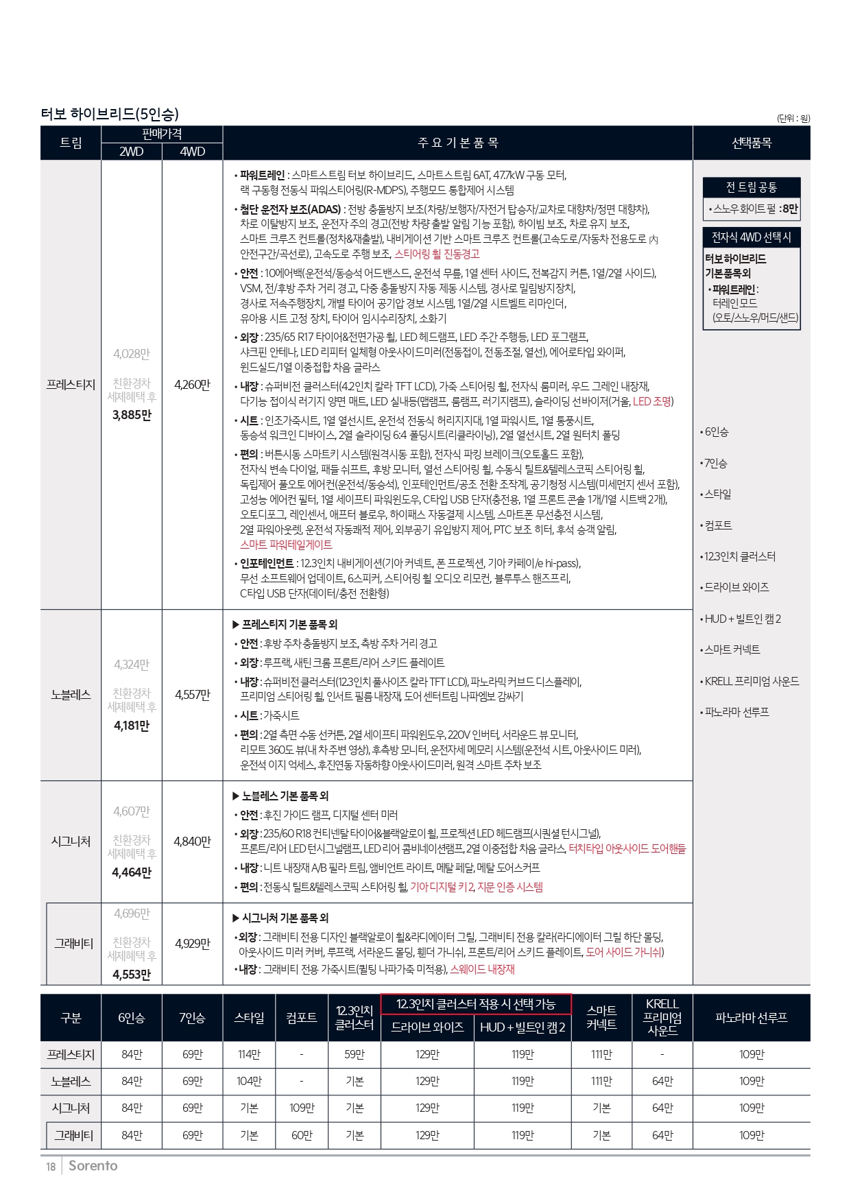 쏘렌토 하이브리드 가격표 입니다.