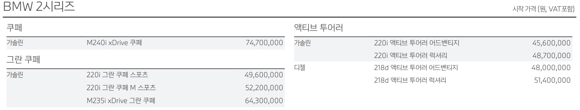 BMW 2시리즈 가격표