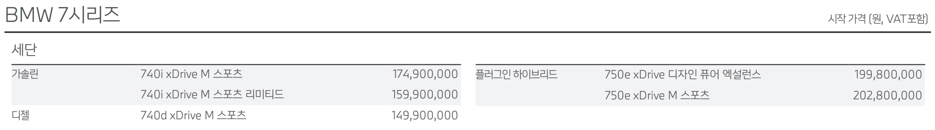 BMW 7시리즈 가격표