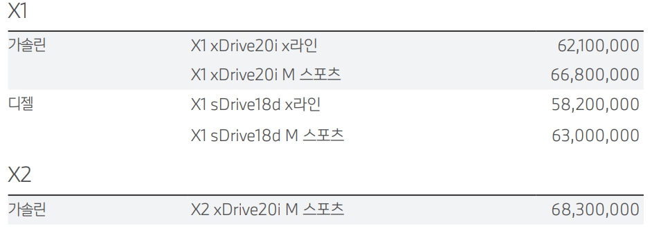 BMW X1 & X2 가격표