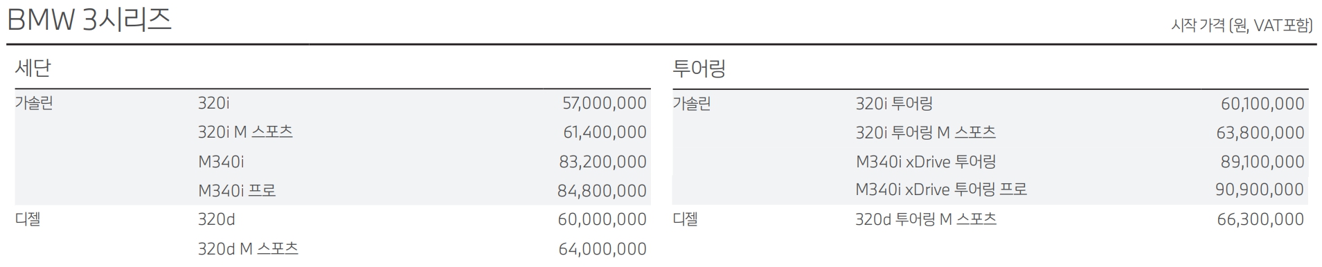 세단 : 320i, 320i M스포츠, M340i, M340i 프로, 320d, 320d M 스포츠