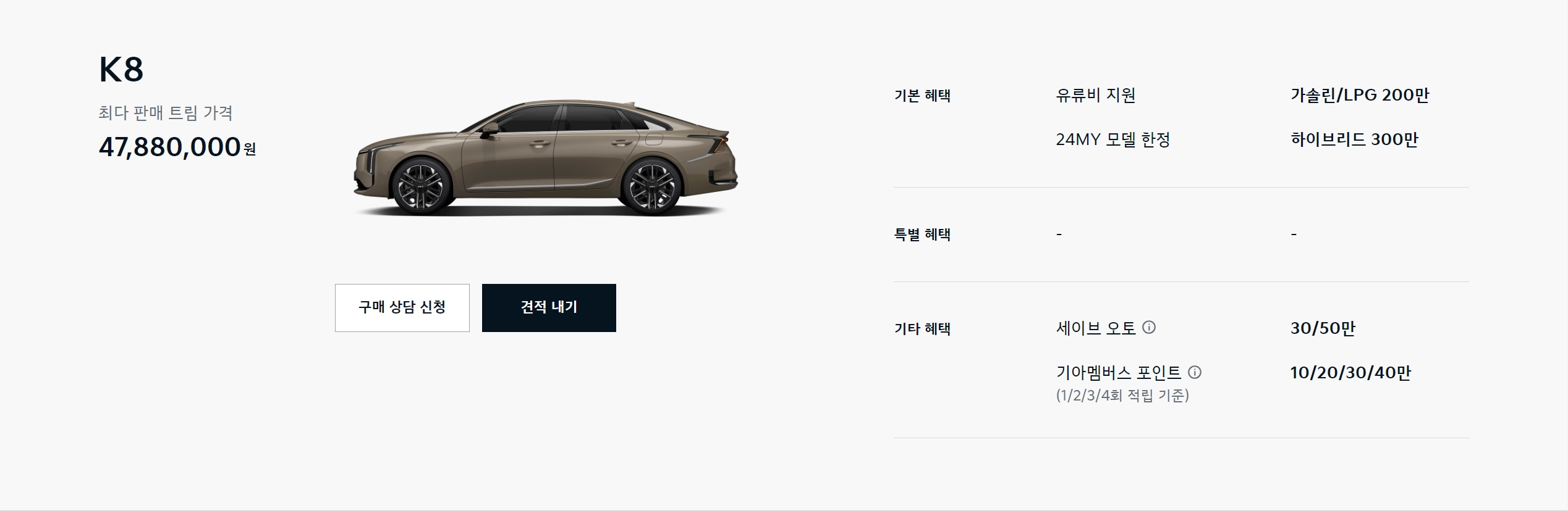 기아차에서 그나마 이번 달에 조건이 좋아진 차량은 K8 하이브리드 재고 및 EV6 정도가 전부네요.