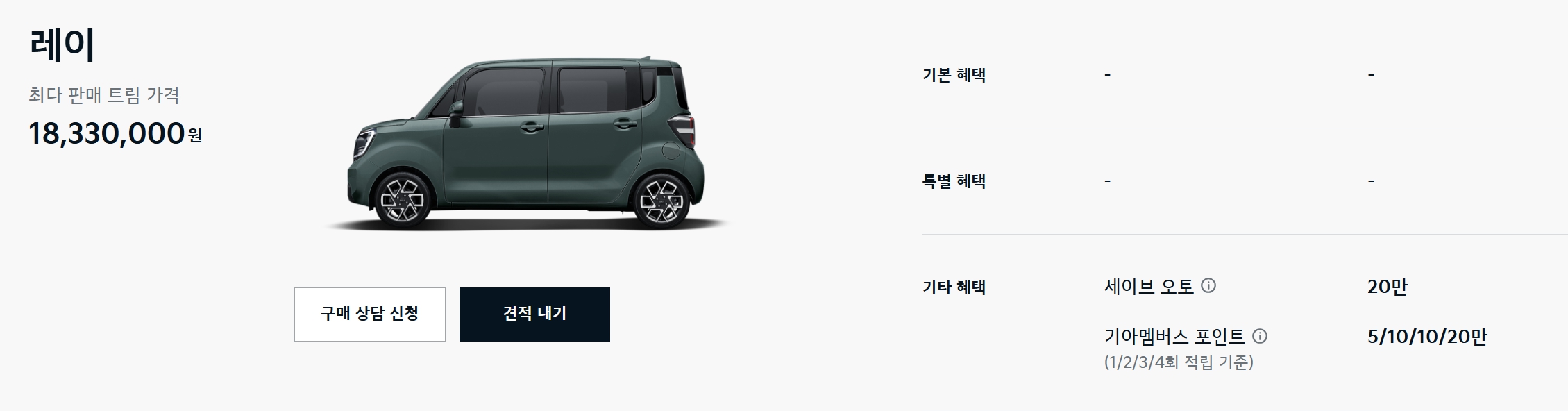 사실, 레이도 안 팔리는 전기차는 가격을 동결했는데, 가솔린 모델은 워낙 고정 수요가 탄탄하니, 늘 프로모션이 없는 차종 중 하나입니다.