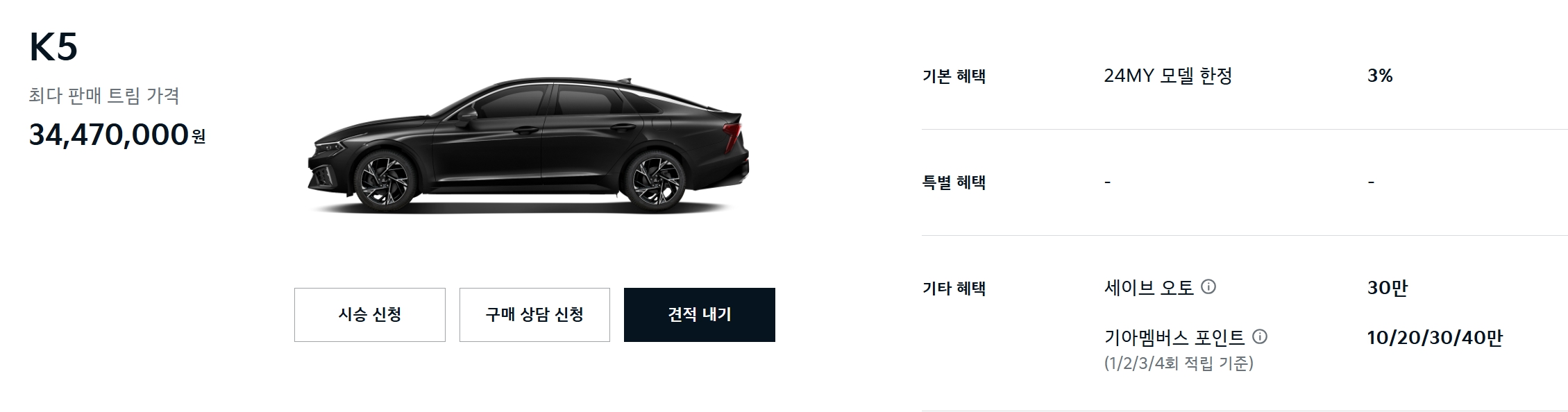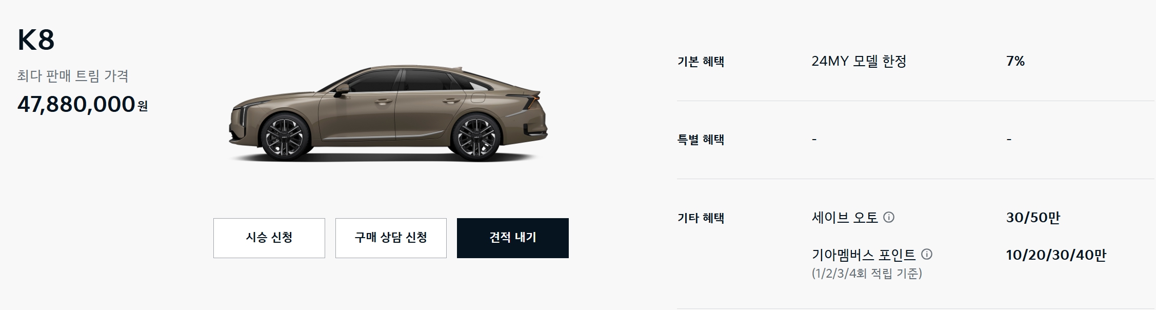 지난달에는 K5 할인이 전혀 없었으나, 이번 달에는 24년형 모델 한정 3% 할인이 있습니다.