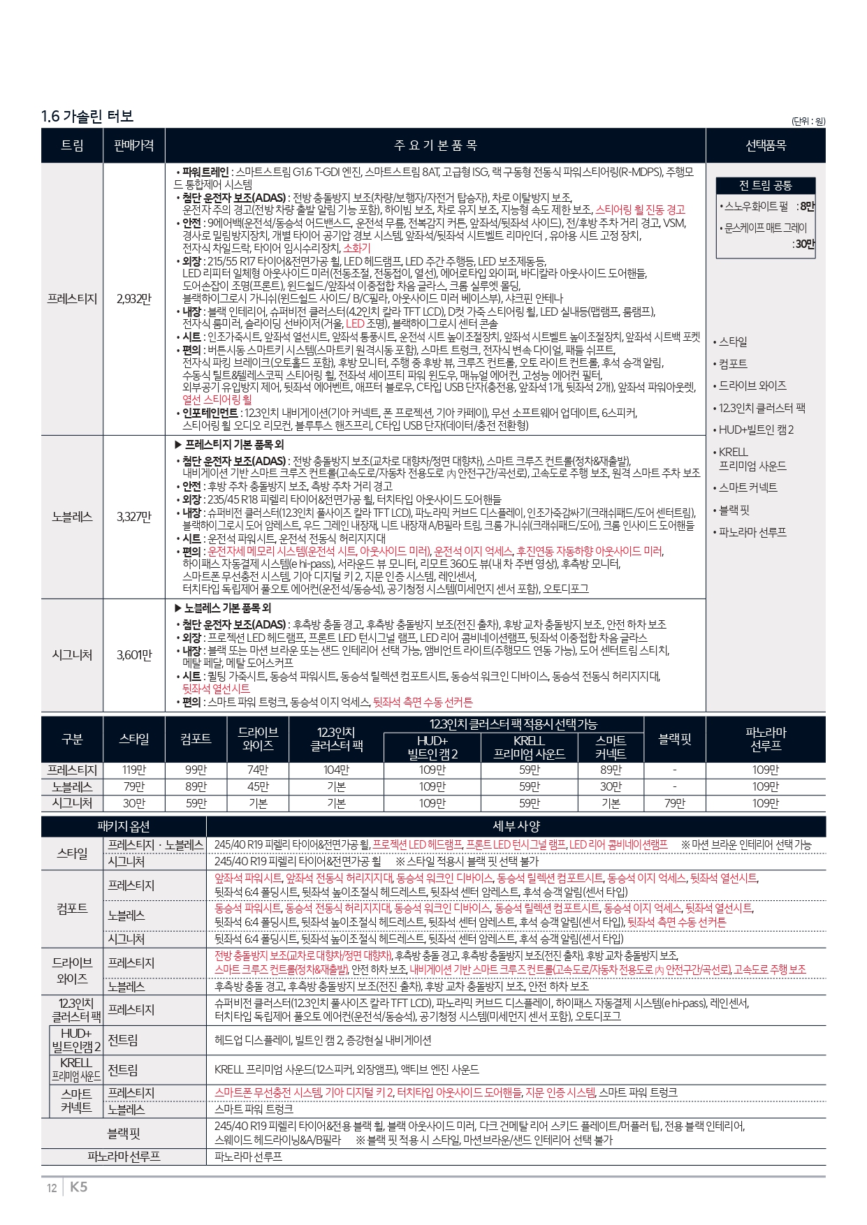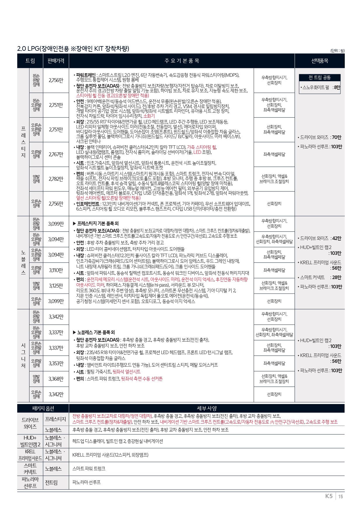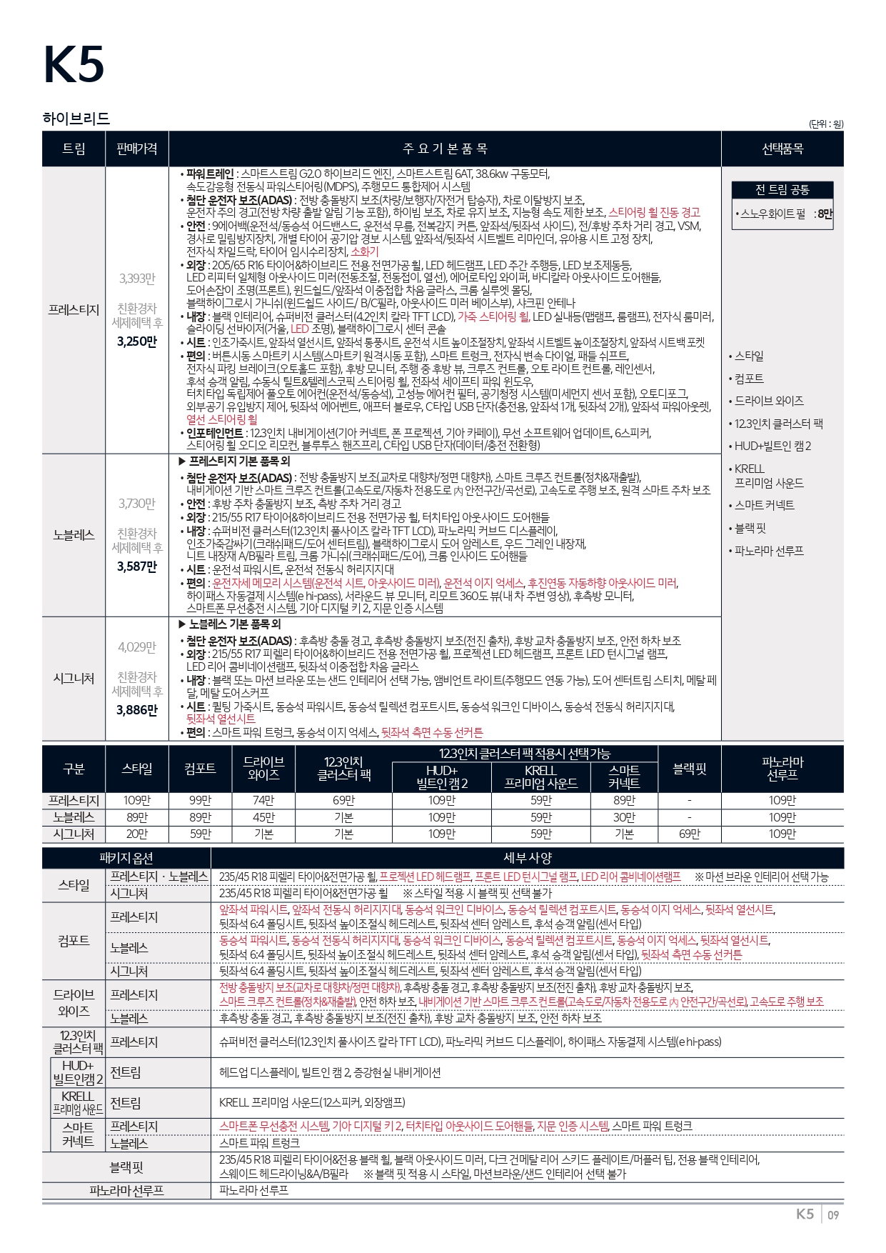 우선은 요즘 가장 인기가 많고, 납기도 긴 K5 하이브리드 가격표 입니다.