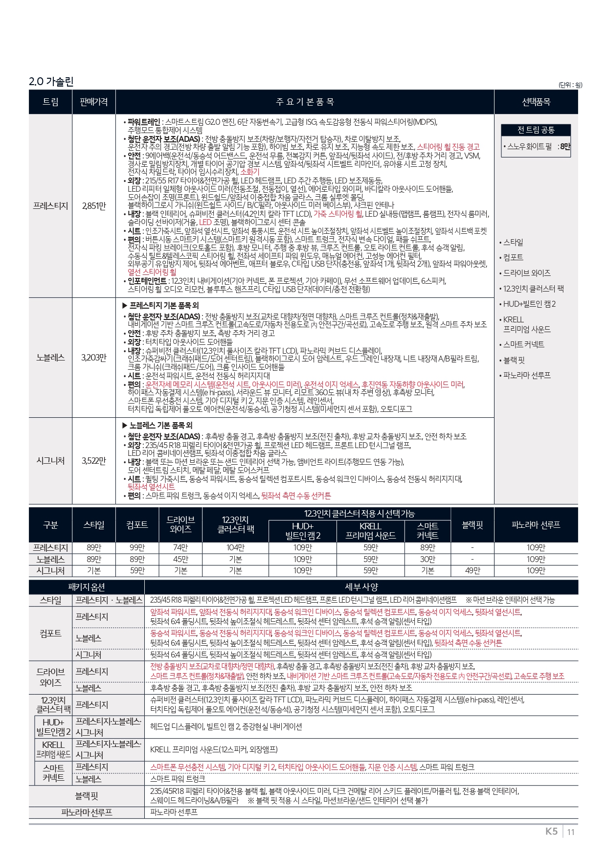 사실, 2.0 가솔린 자체가 내연기관 차량 중 가장 저렴한 가격인데, 여기에 옵션을 좀 더 단순화하여 가격을 더욱 낮춘 보급형 트림을 출시한 거라 보시면 됩니다.