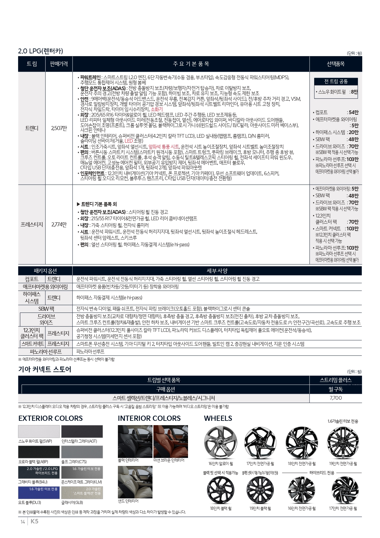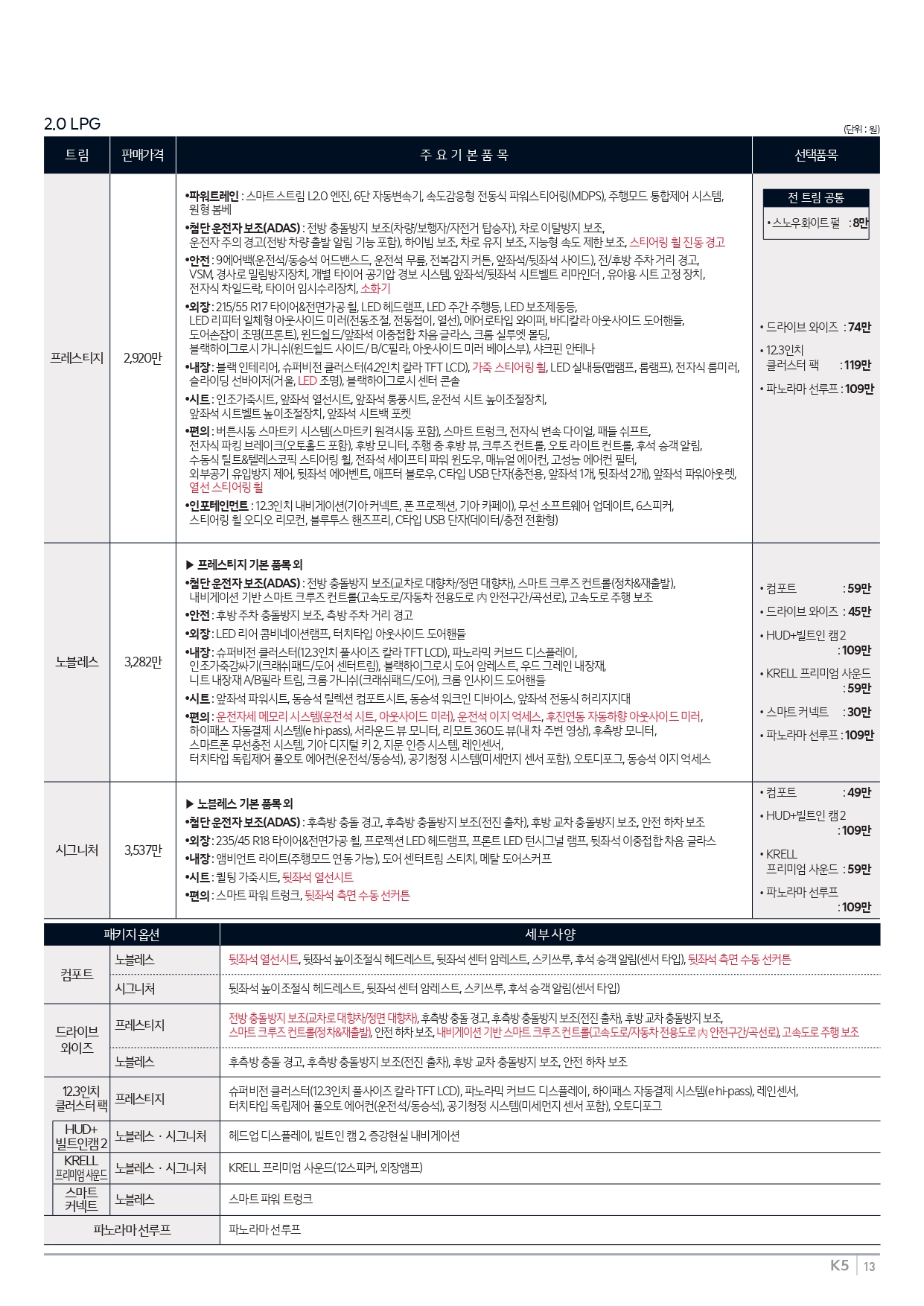 다음은 스마트 셀렉션이 아닌, 일반 K5 2.0 가솔린 모델의 가격표 입니다.