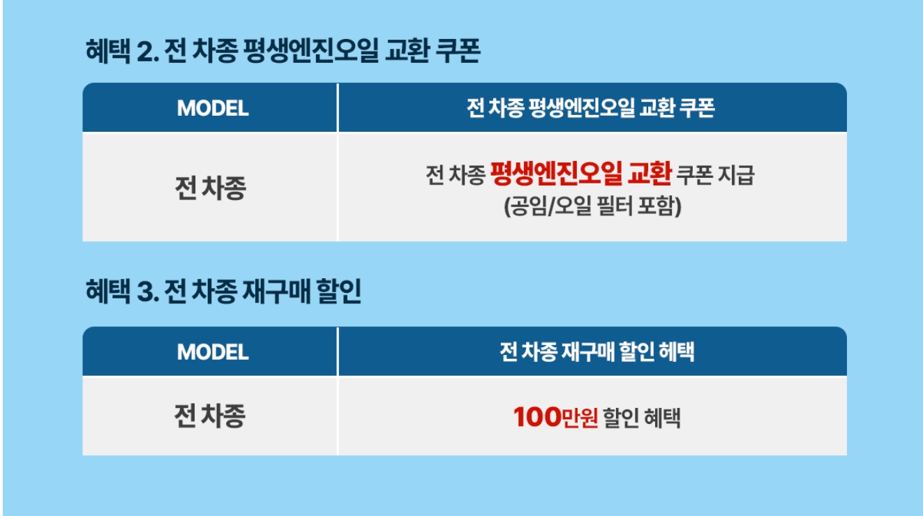 참고로, 늘 하는 프로모션이지만, 평생 엔진오일 교환 쿠폰 및 재구매 할인도 여전히 있습니다.