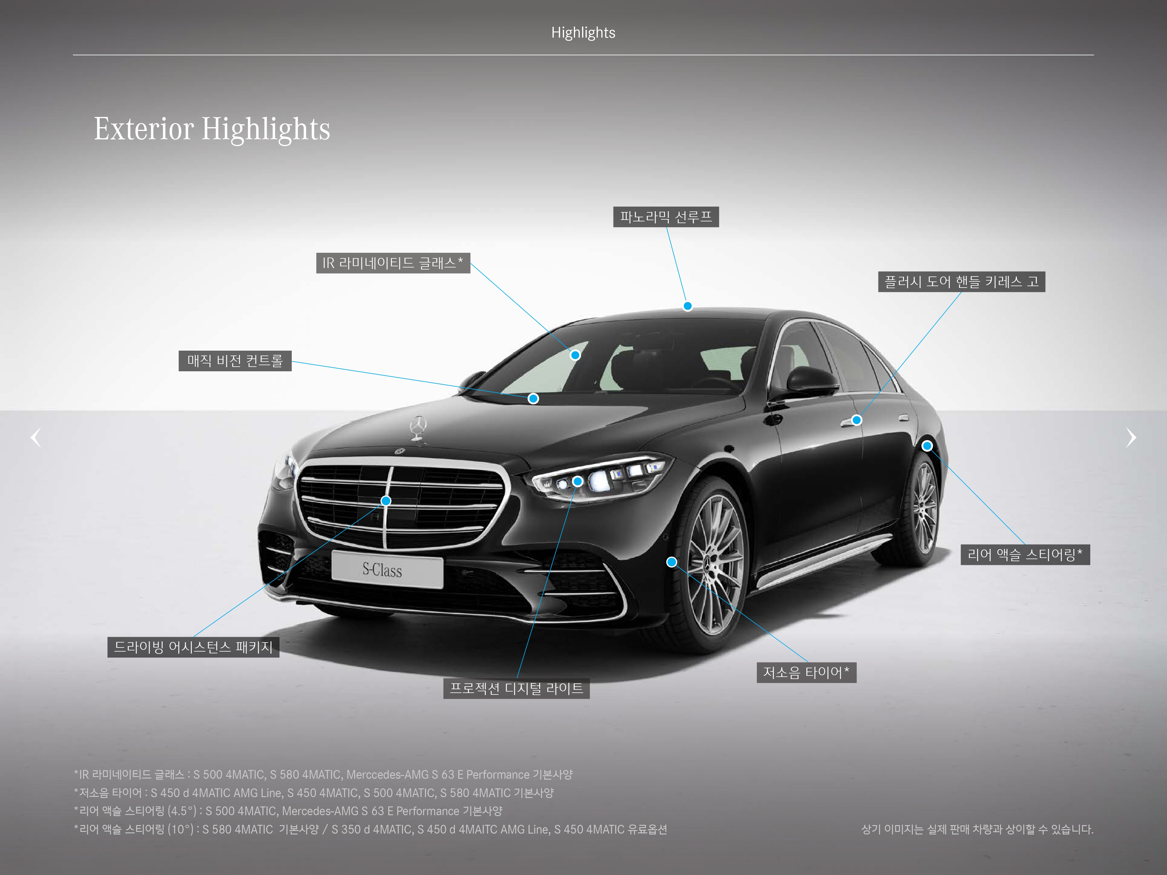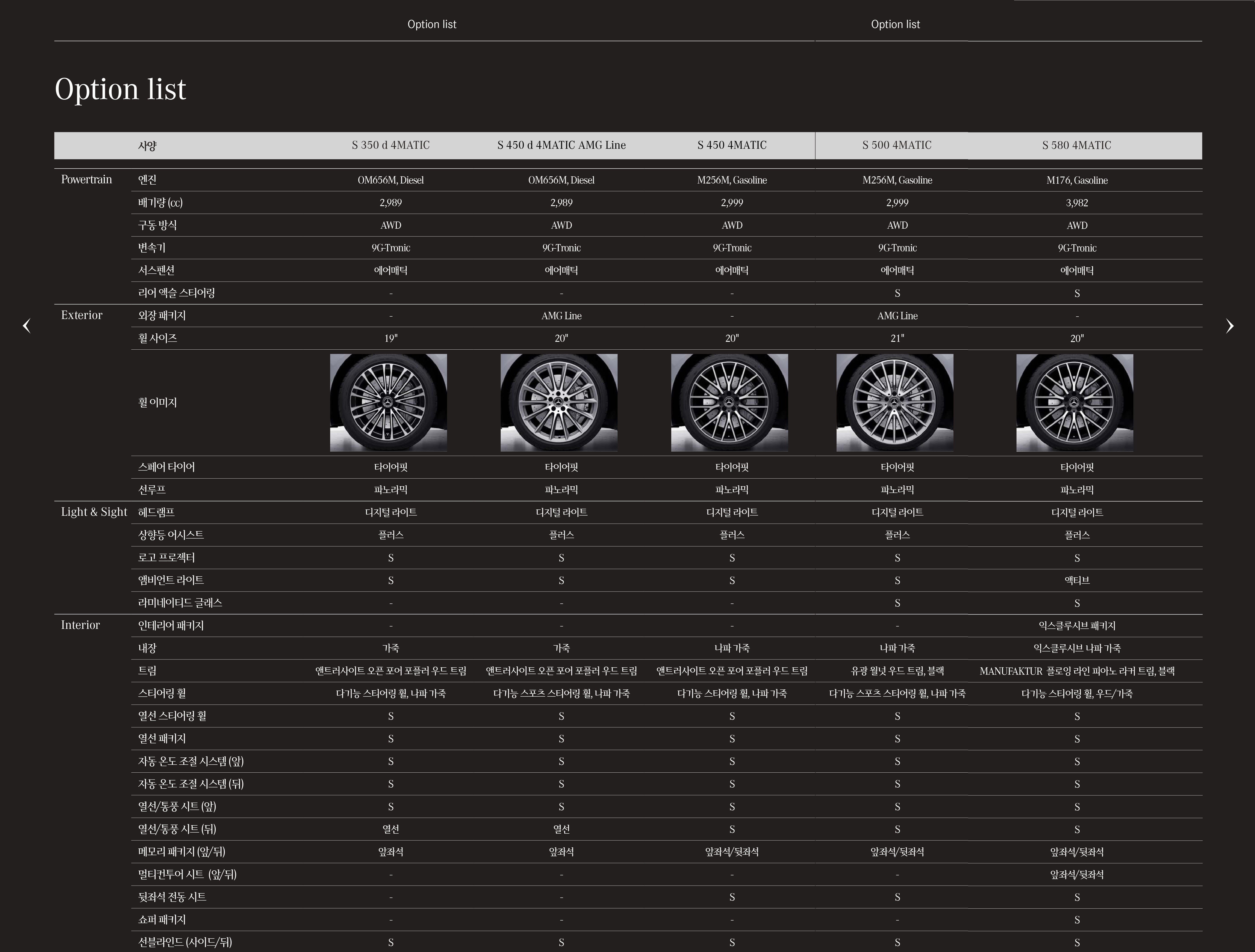 한 가지 아쉬운 점은, 많은 분들이 선호하는 옵션인 AMG 패키지가 디젤 모델인 S450d 에만 존재한다는 점 입니다.