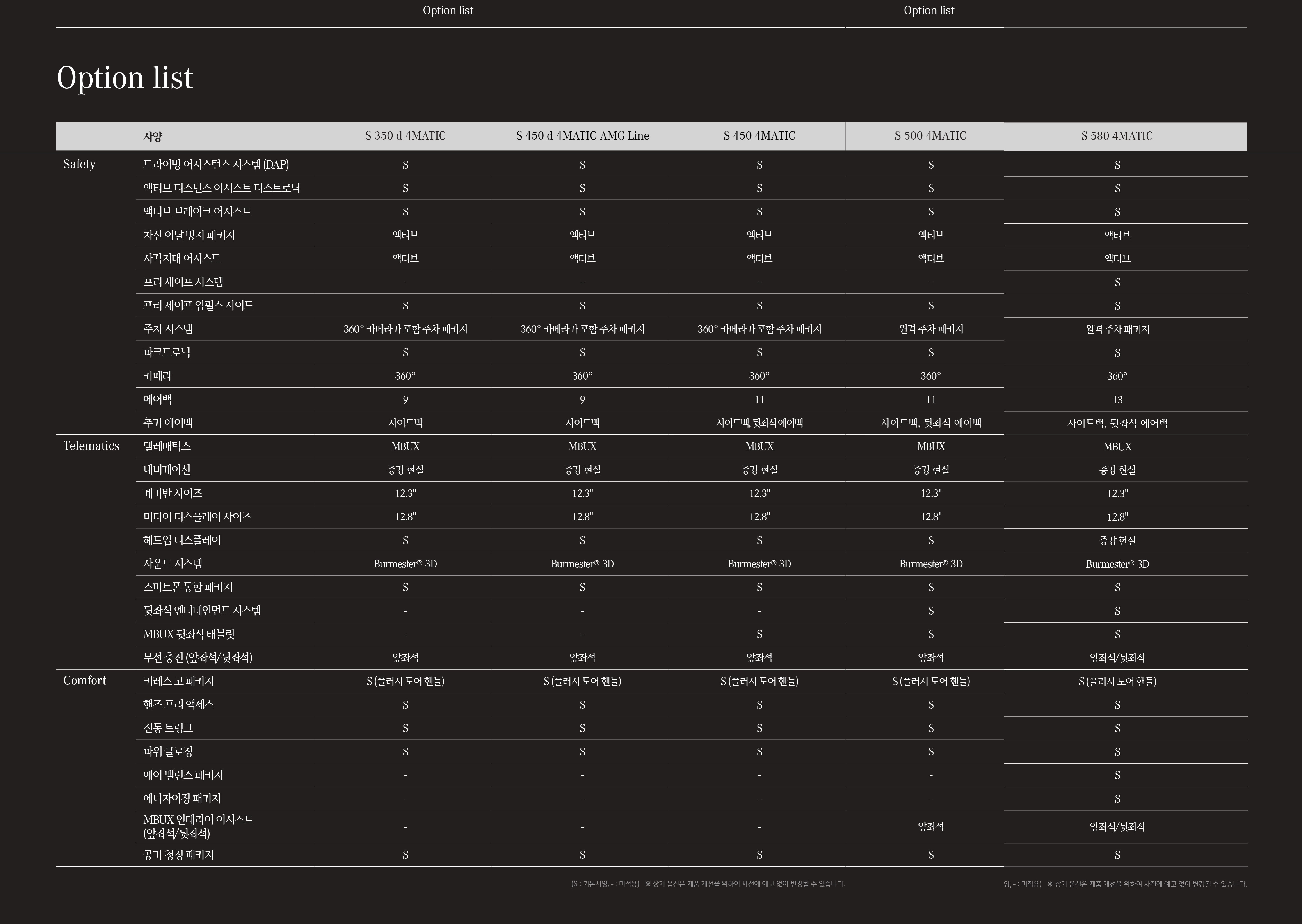 S클래스는 특히 뒷좌석 옵션이 정말 다양한 차종이기에, 옵션표가 상당히 복잡하기도 하고, 꼼꼼한 비교가 필요한 차종입니다.
