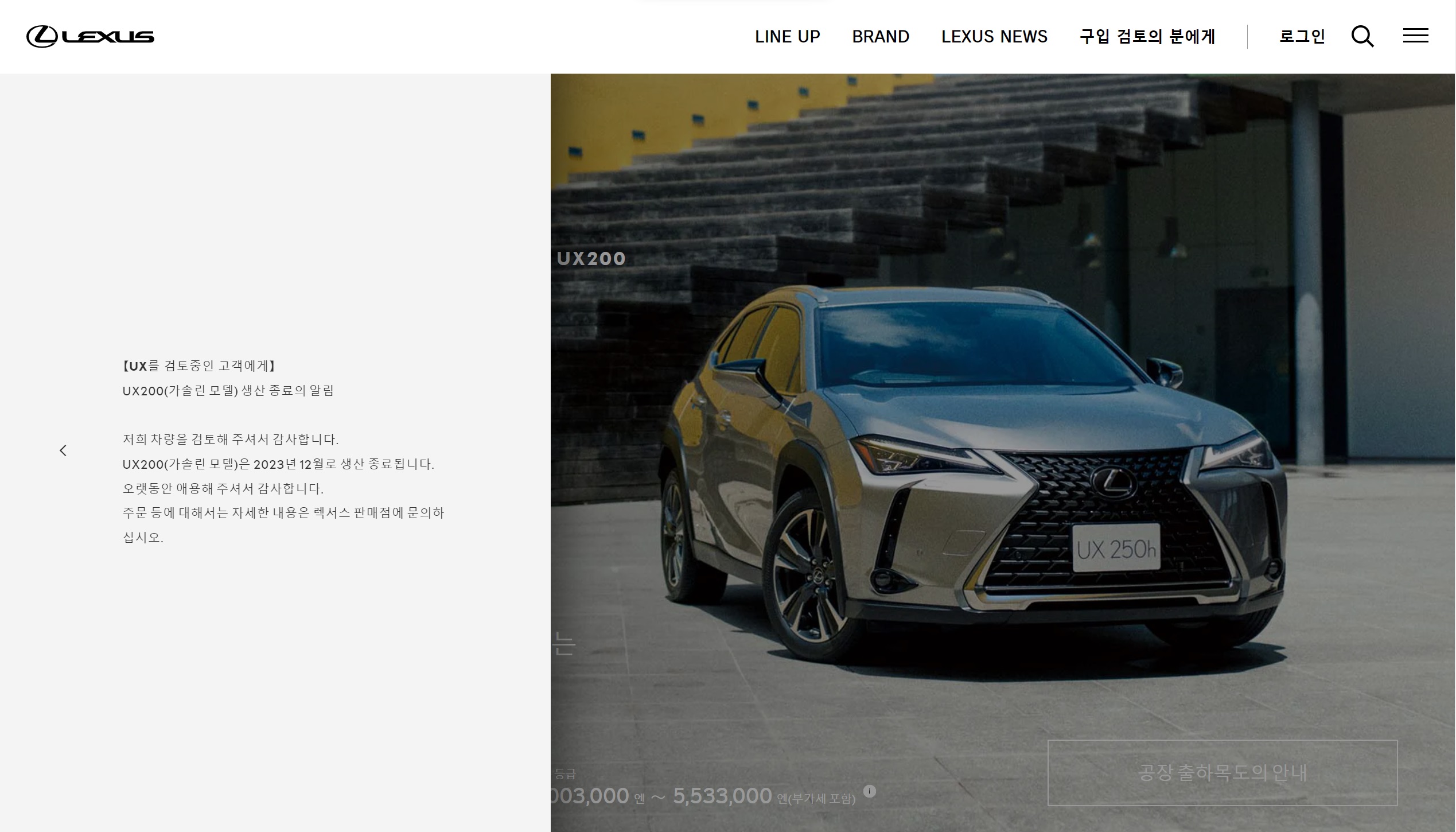 원래는 UX기본형 시작가가 4,003,000엔 이었으나, 이제는 4,559,000엔이 되었습니다.