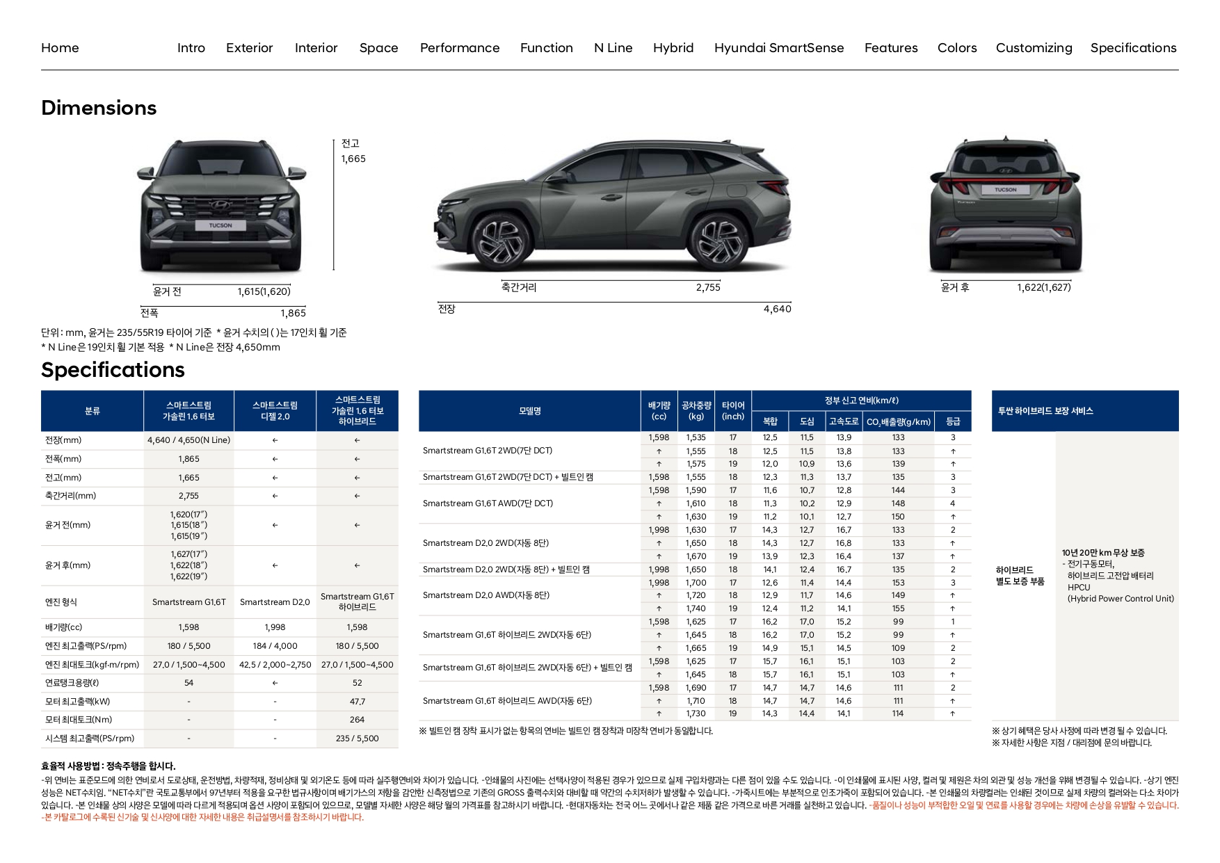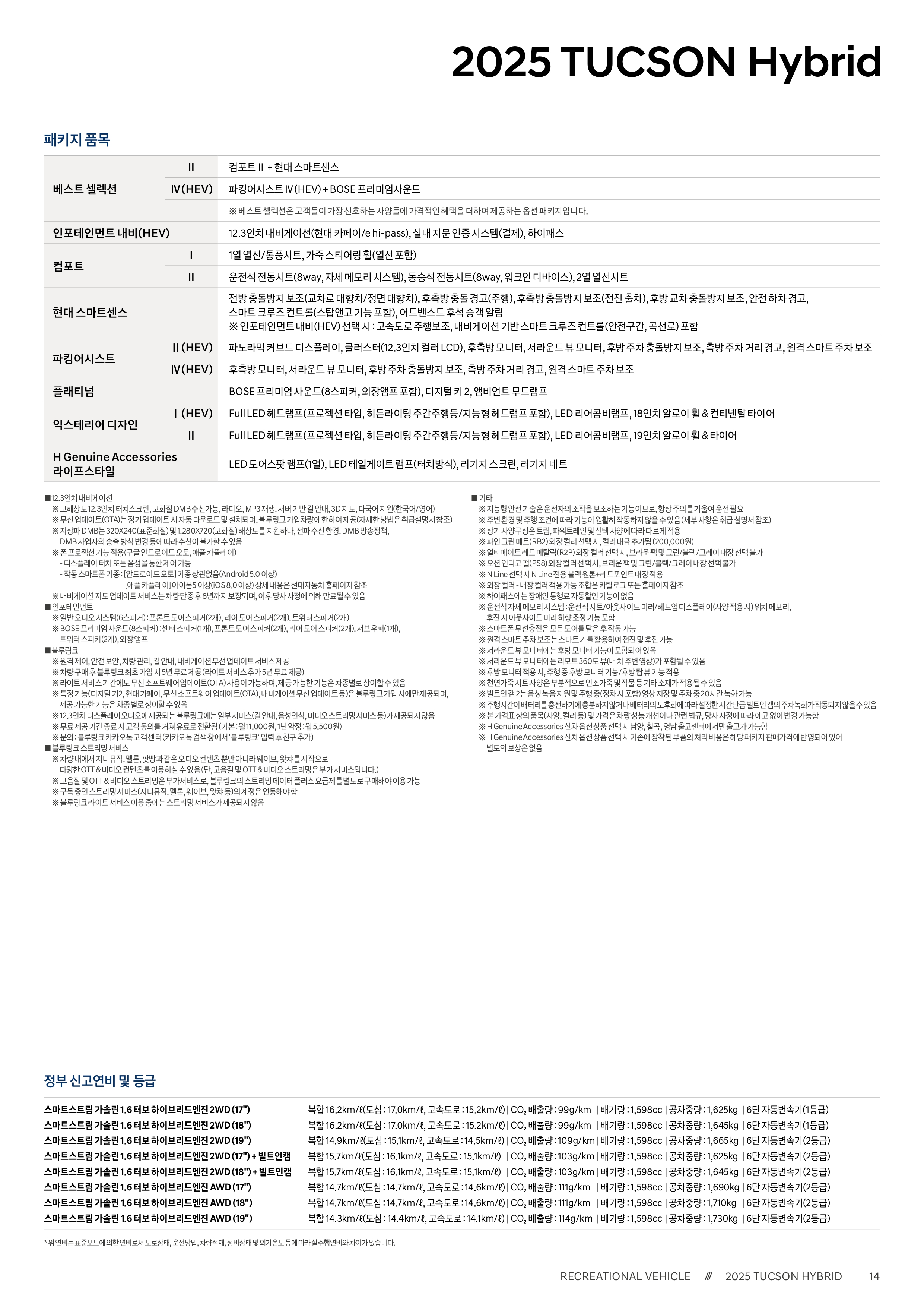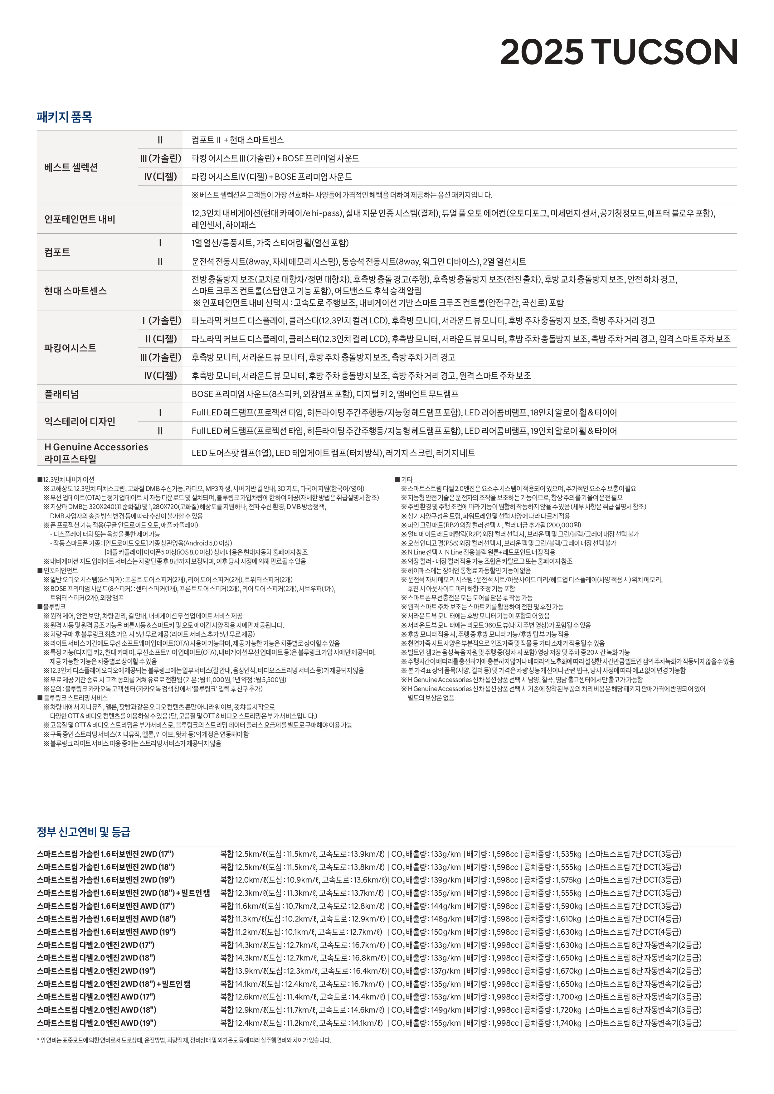 마지막으로 2025 투싼 모델의 제원 및 연비 입니다.
