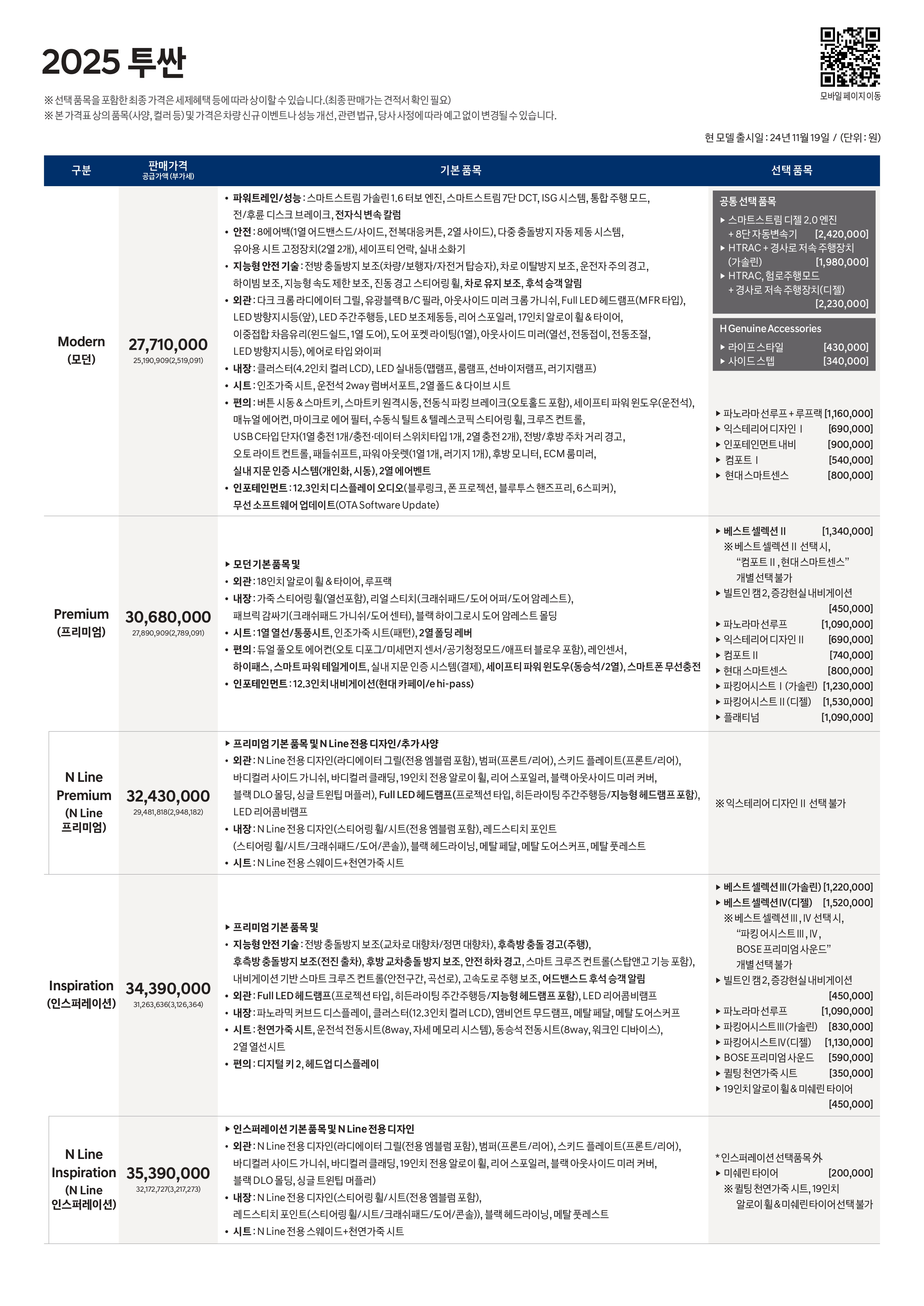 2025 투싼 하이브리드 N라인 인스퍼레이션 : 3,938 만원