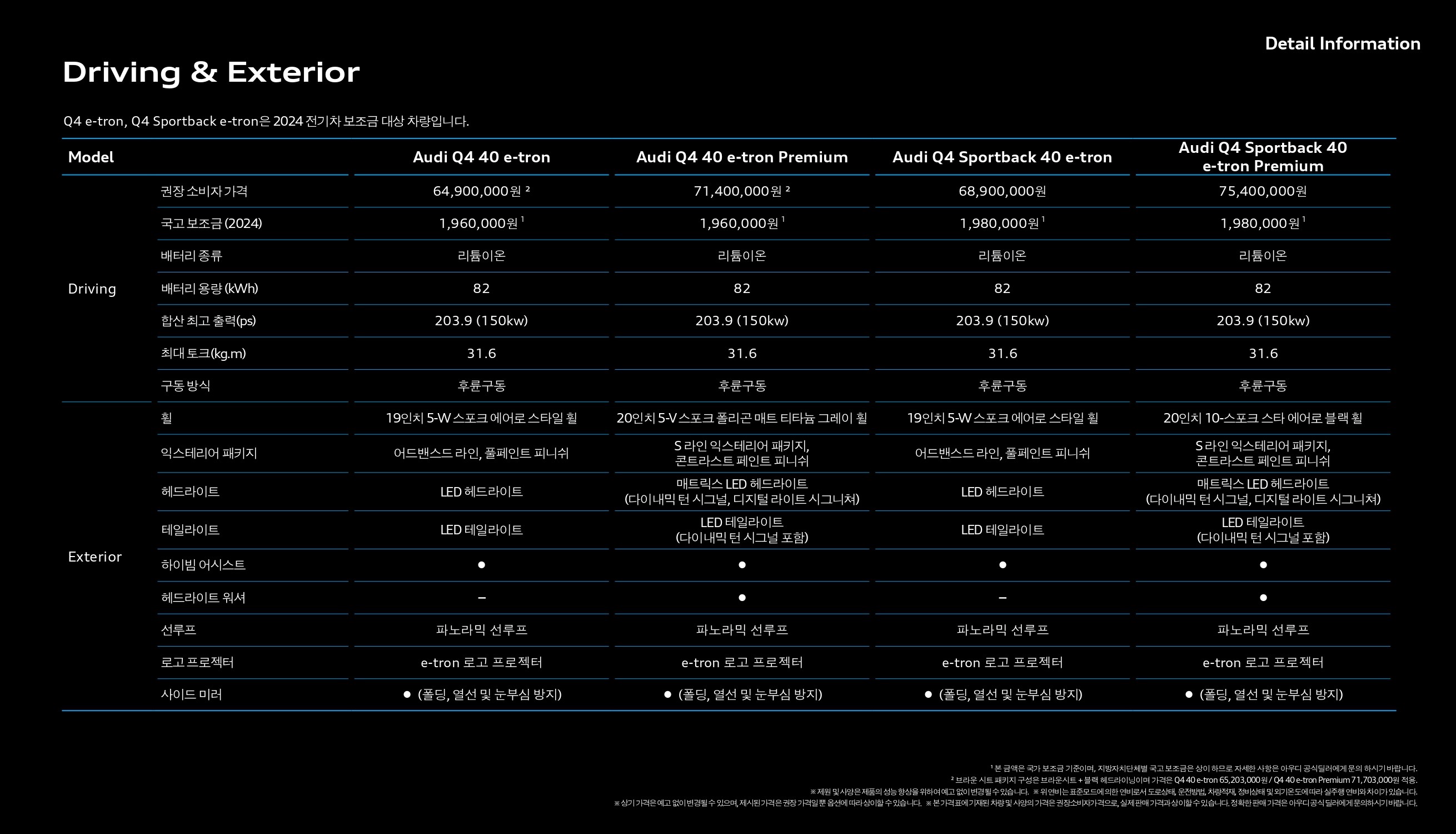 앞서 말씀드린 것과 같이, 국내 수입되는 파워트레인 자체가 40 e-트론 하나만 수입이 되기 때문에, 사실상 성능차이가 없다고 보셔도 무방합니다.