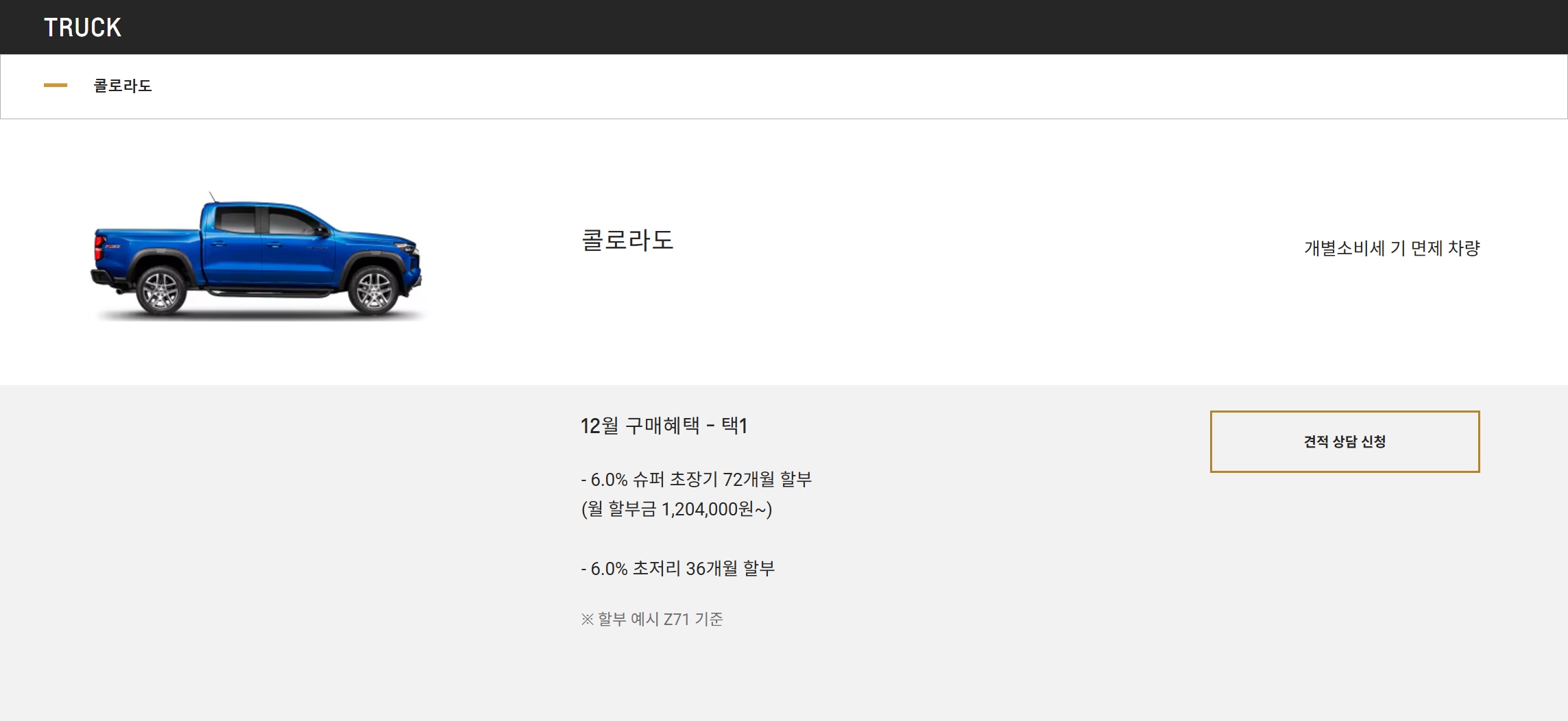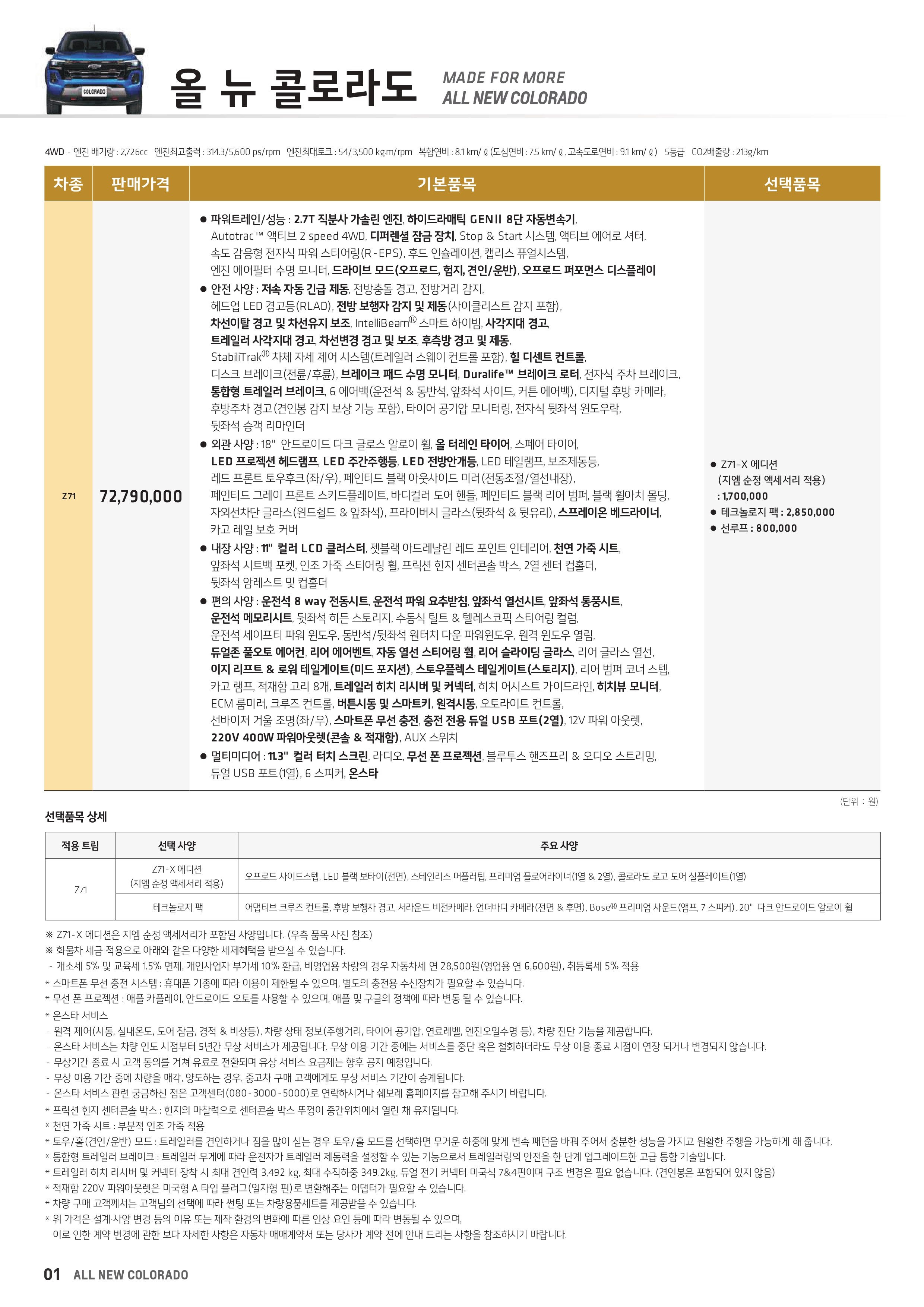 풀체인지 이후 줄곧 풀옵션 사양인 Z71 사양만 판매 중에 있으며, 프로모션 혜택이 없습니다.