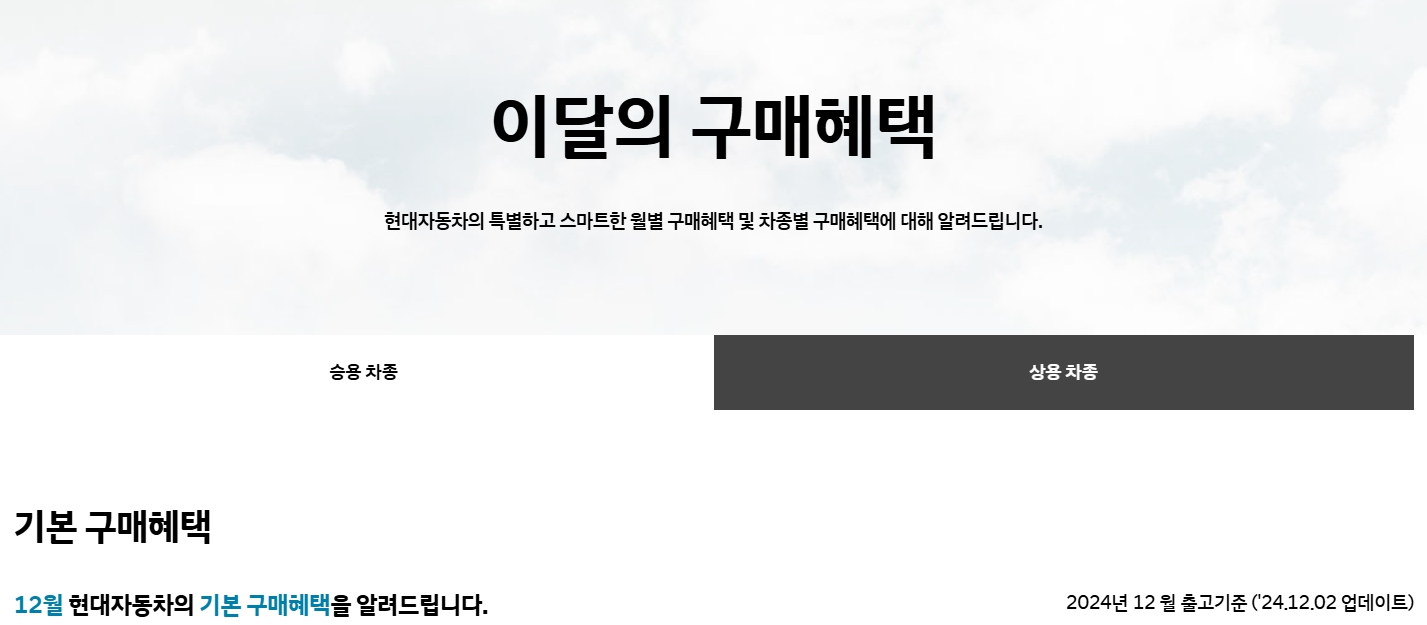 오늘은 여러분들께 2024년 12월 현대자동차 구매 혜택을 소개해 드려 볼까 합니다.