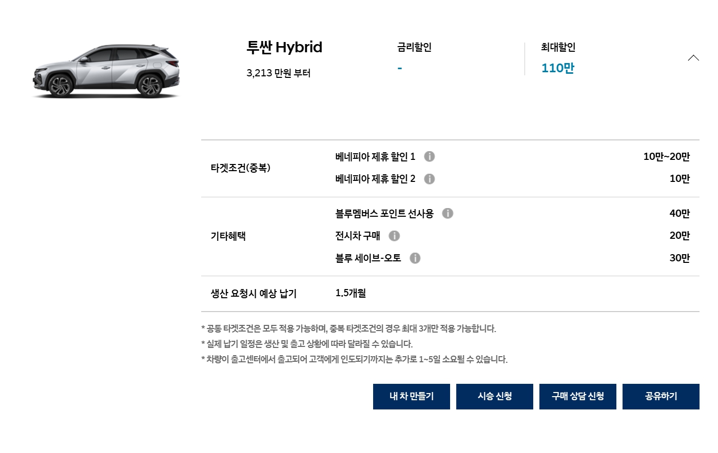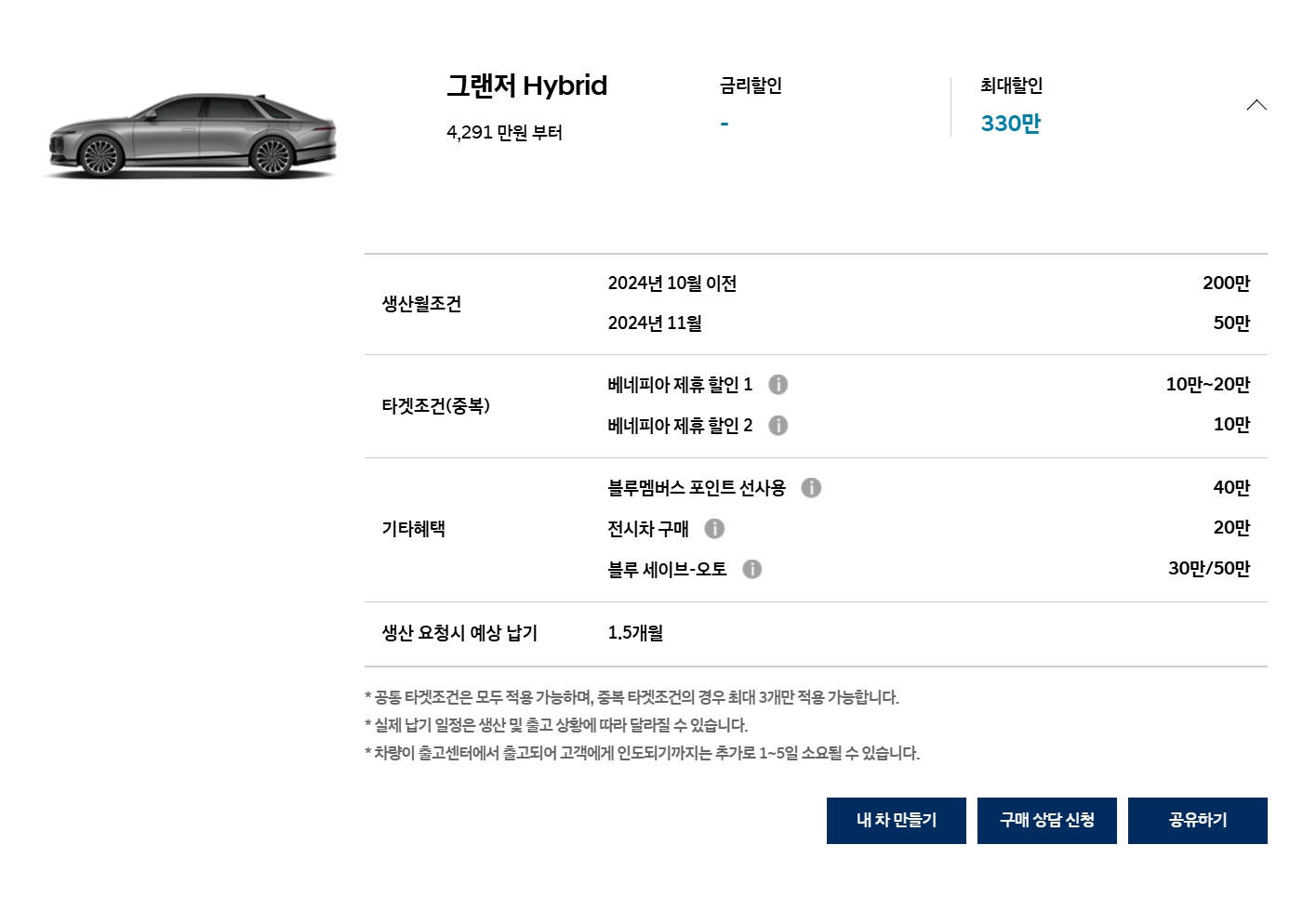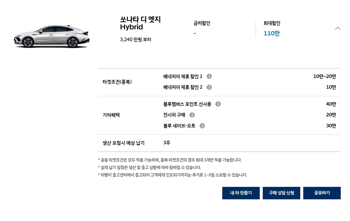 일반 내연기관 모델은 할인이 10만원 줄어들었고, 하이브리드 모델은 그대로입니다.